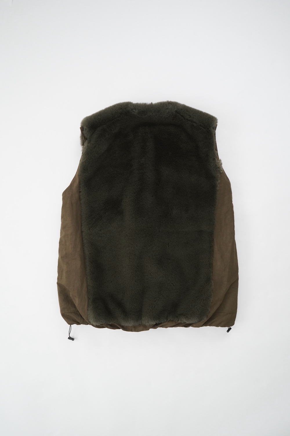 表側はふわっとした質感で暖かみのあるファー素材。裏側はナイロン素材。異なる表情を楽しめる2WAYリバーシブルベストです。