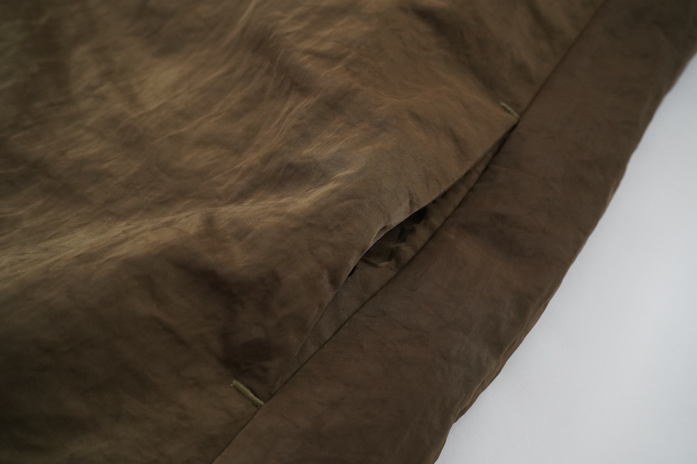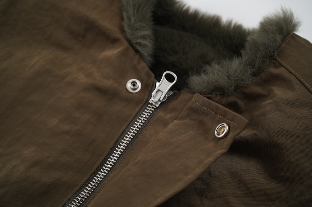 フロントはトップと裾にドットボタンがあり、ジップを隠す仕様です。ジップはリバース用の持ち手