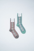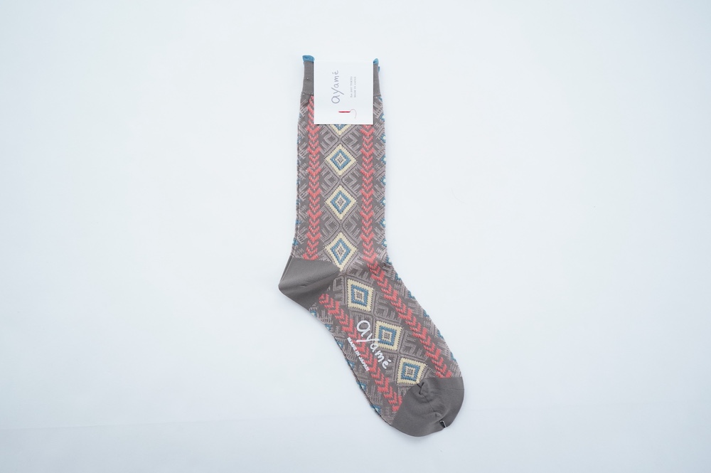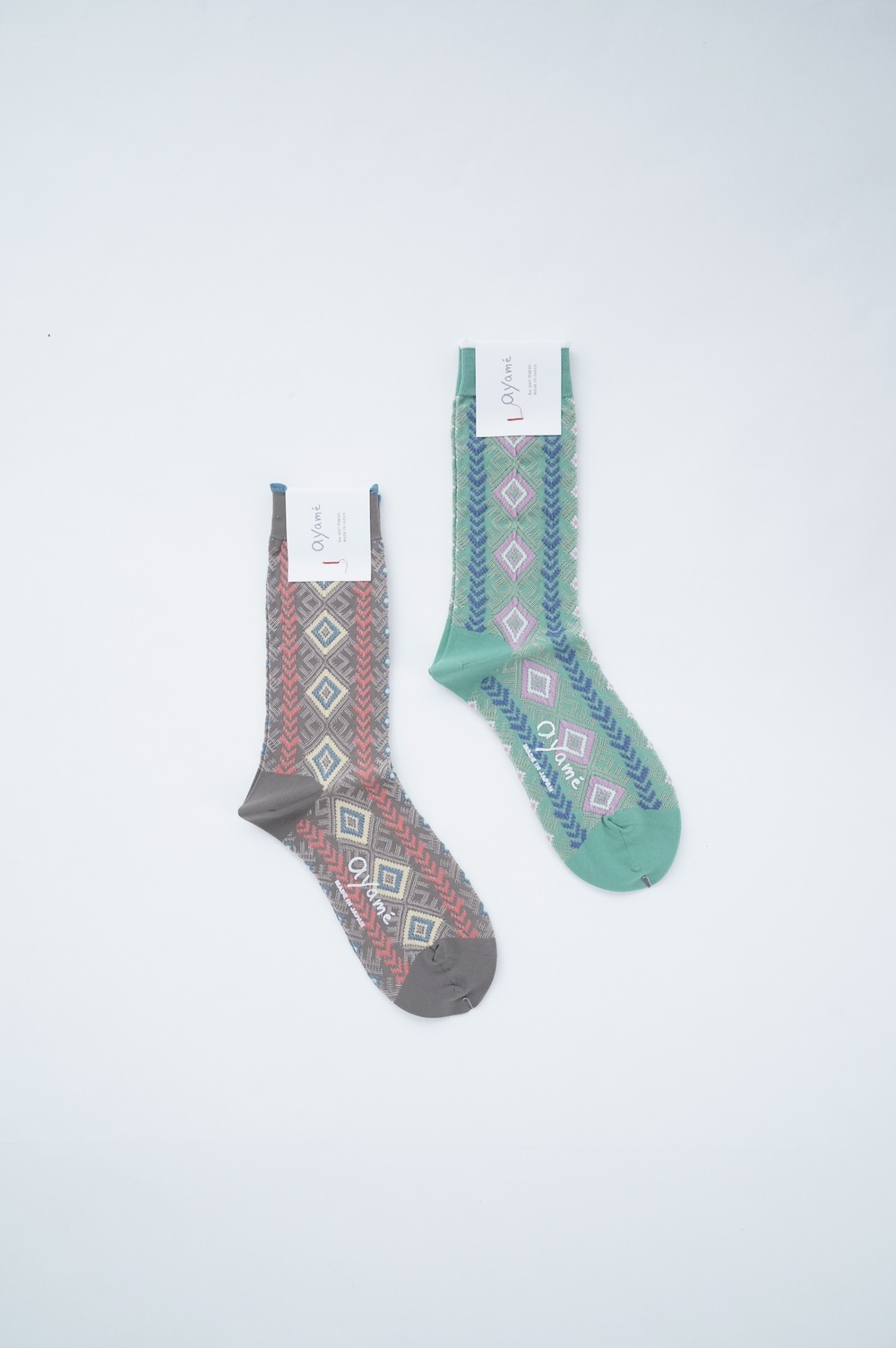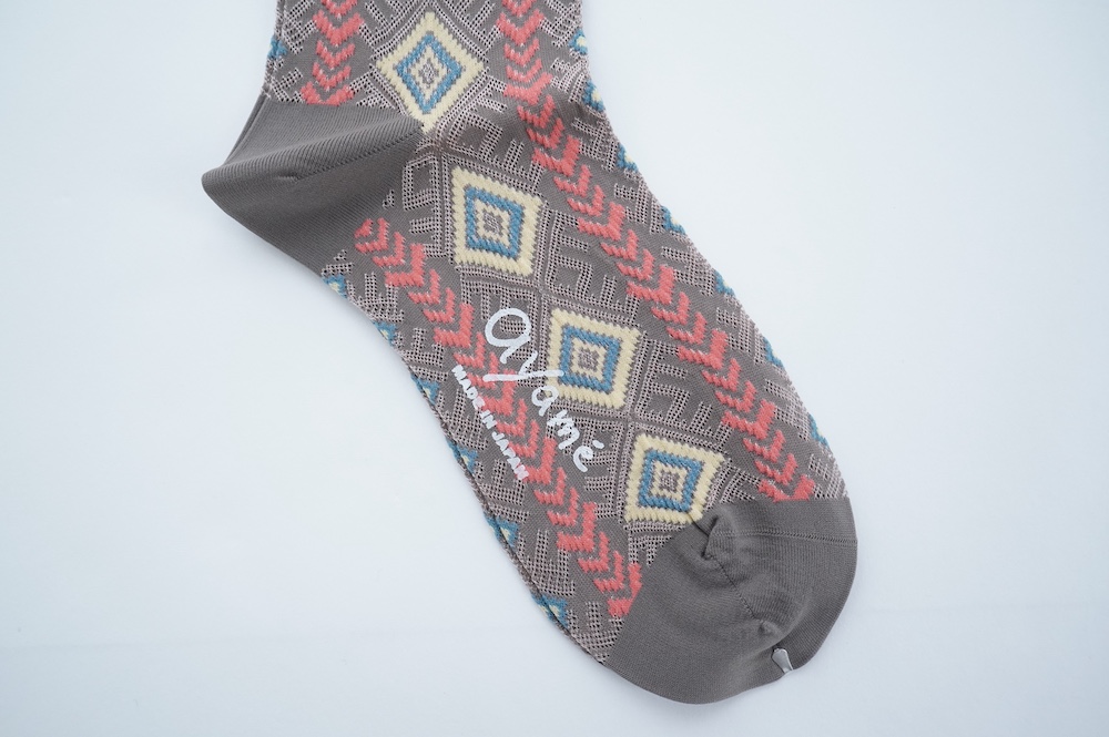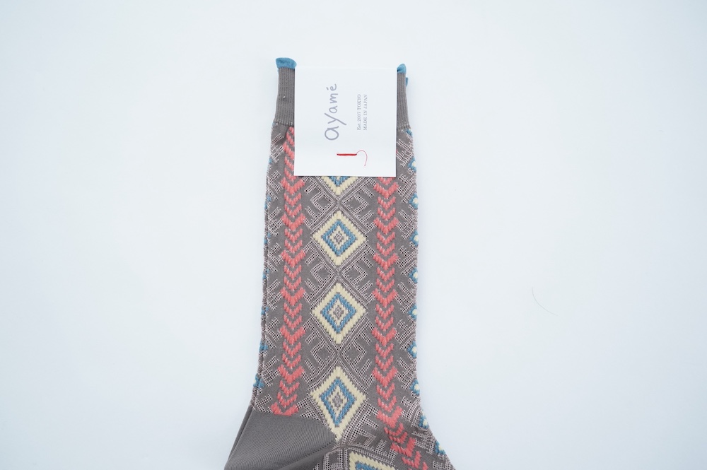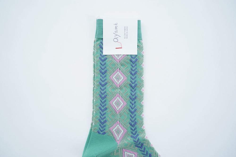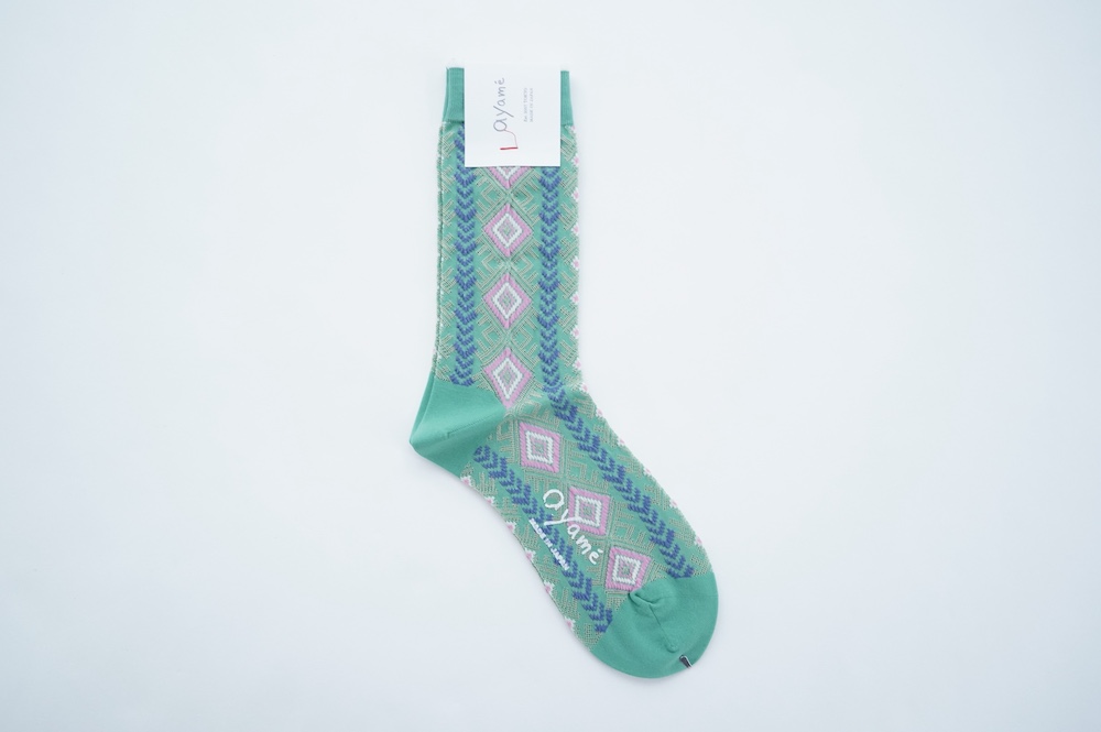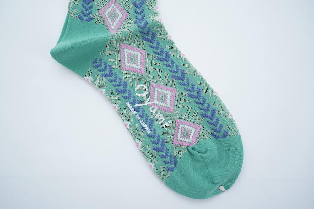 アヤメのソックス。鮮やかな色使いがポイントになる、賑やかなラトルソックス。凹凸感があり繊細な織り柄が素敵です。普段は目につかない部分だからこそ、楽しみたい足元を彩るアイテムです。