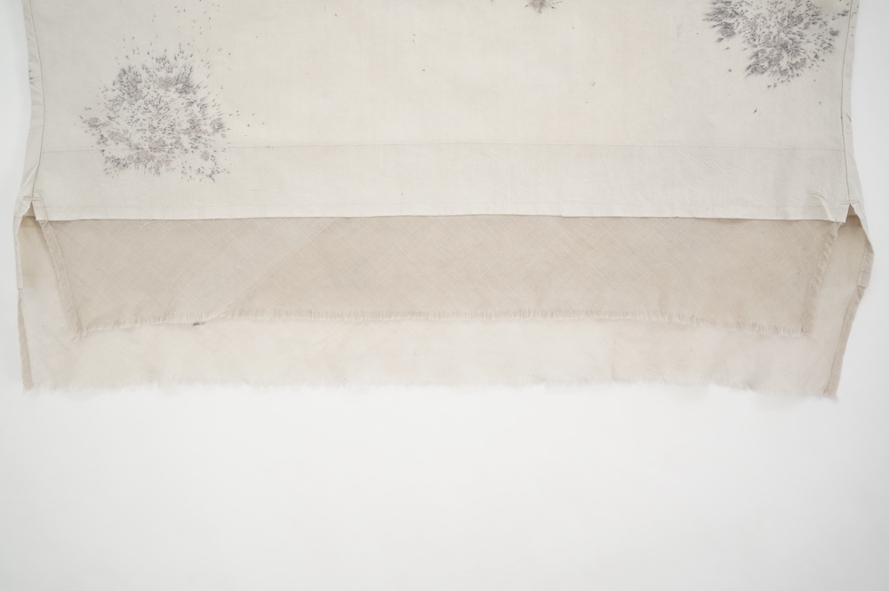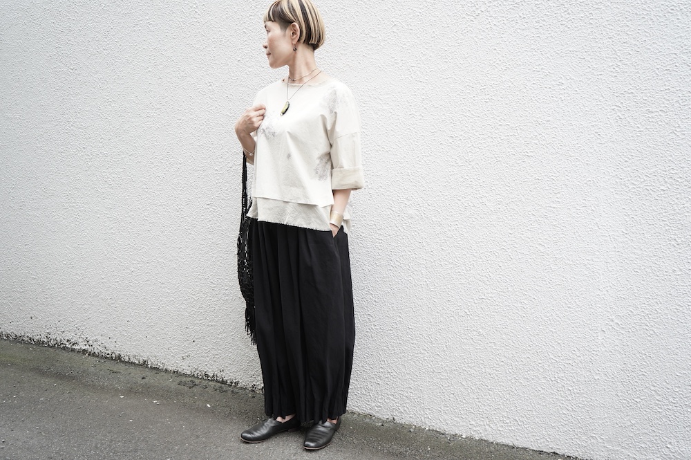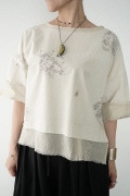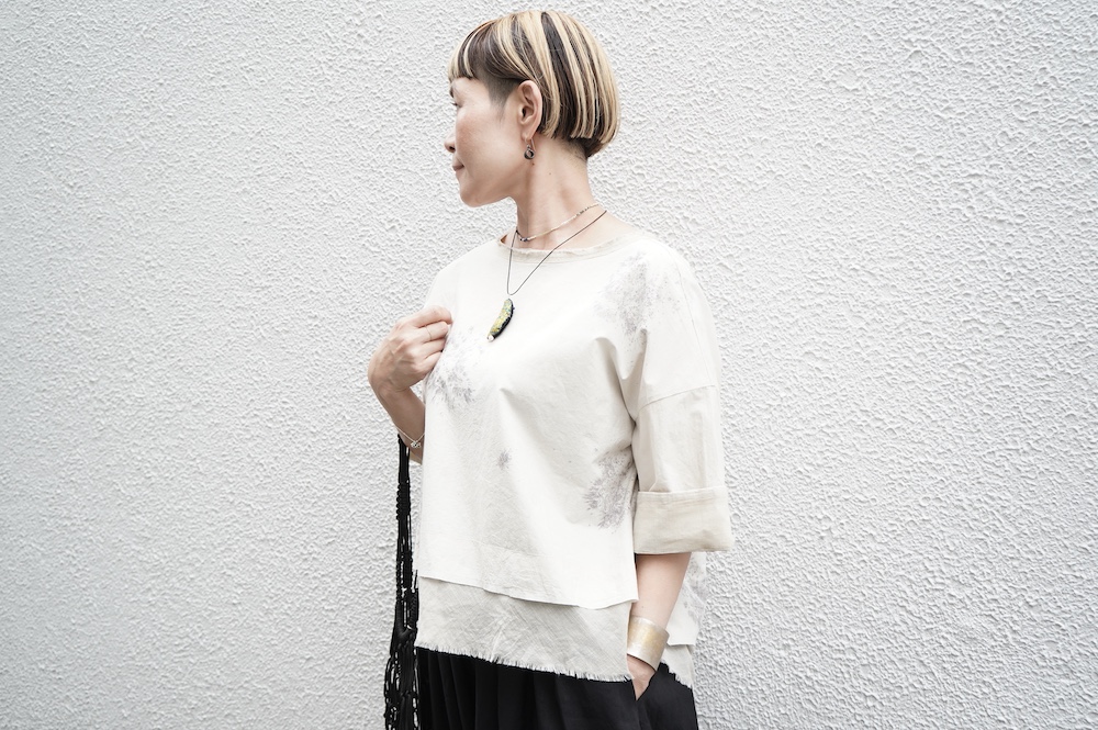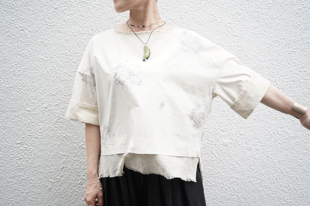 デザインはゆったりとしたシルエットのプルオーバーブラウス。ボートネックで首元もすっきりと、着丈は短めなデザインです。着丈に前後さがあるのと、サイドにスリットと裾のインド綿の薄手素材があることで、着丈が短くなりすぎずにバランスよく合わせていただけます。身頃とポイント使いのインド綿の濃淡が、絶妙なアクセントに。フリンジ仕上げも夏らしい涼やかな1枚です。また、袖口の裏にもインド綿を使用しているので、五分袖を折り返せば、デザインと色の変化も楽しめます。ランダムに施された花火のような儚げなモチーフが華やかで、アクセサリーなどがなくても一枚で涼しく楽しめるブラウスです。