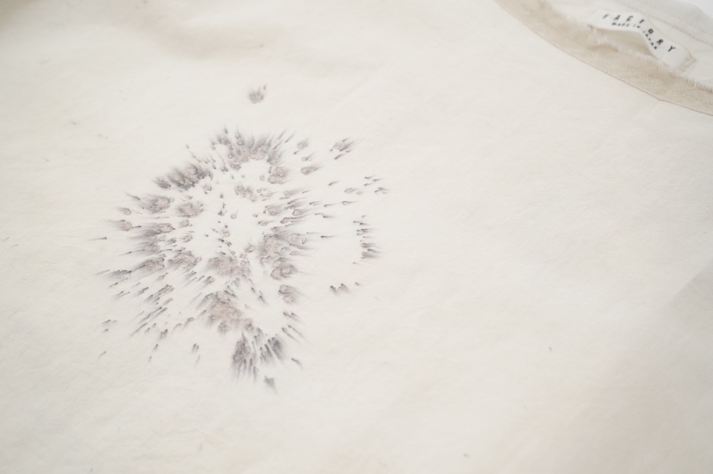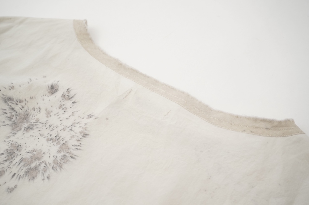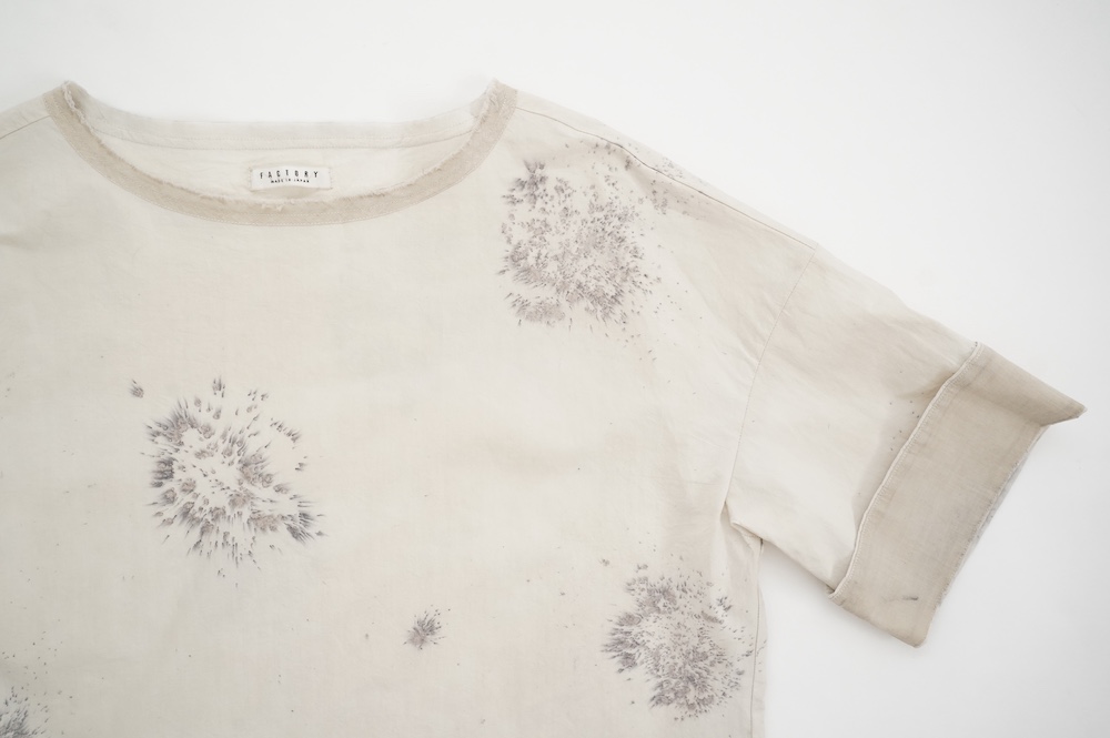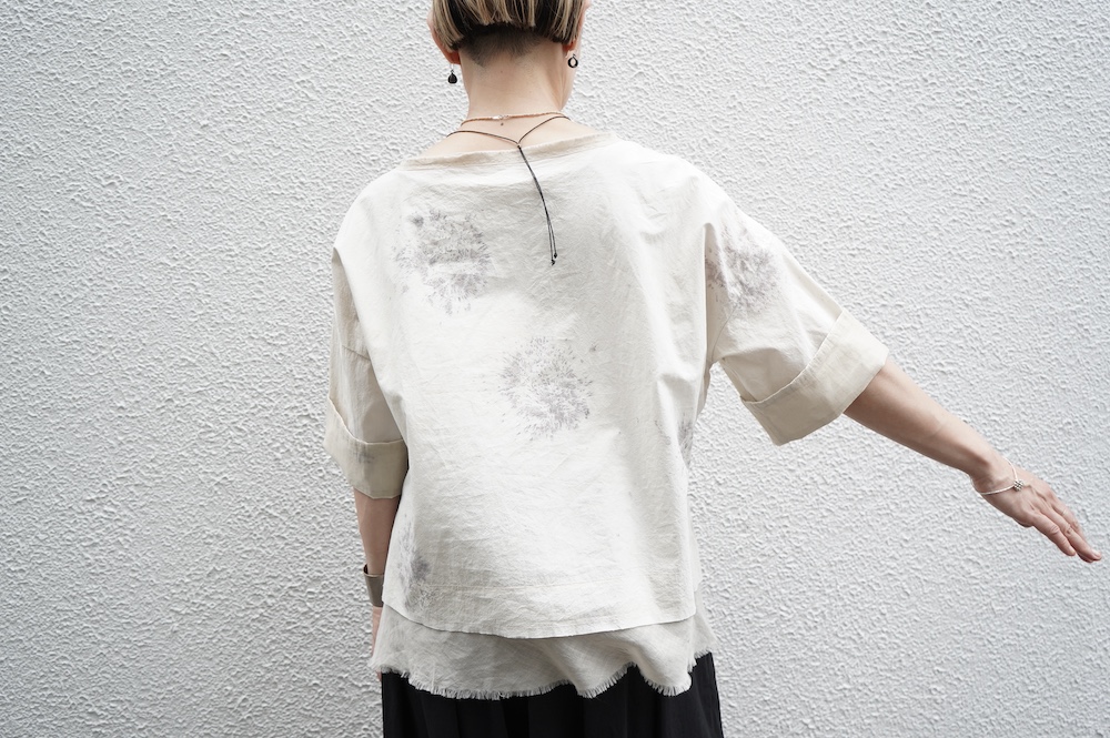 ファクトリーのブラウス。細番手の糸で高密度に織り上げられた、滋賀県に伝わる伝統的な近江晒しを使用。薄手で柔らかさがありながら、パリッとしたハリ感があり肌離れの良い気持ちいい素材です。ベースのベージュの色は、機械を使わず全て手作業で『かけ染め』を施しています。顔料染めで、手作業ならではの柔らかな色合いが特徴です。そのベースの上に、別の染料でさらに『かけ染め』を行い、染料をふりかけるように加工をしているので花火のような模様を出しています。一つずつ模様の出方・色が違うので、その個性もぜひお楽しみください。