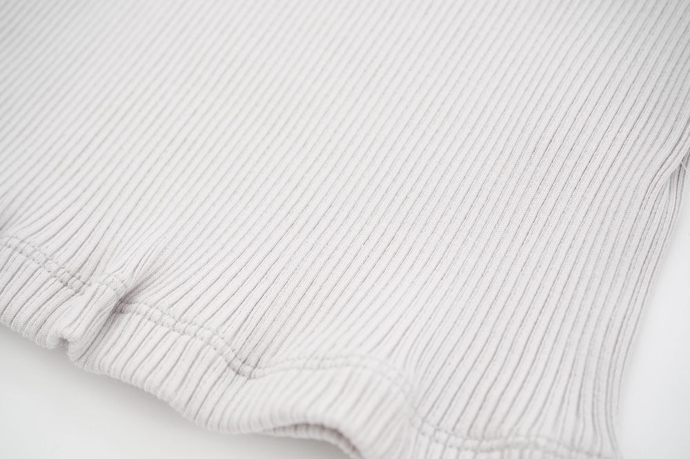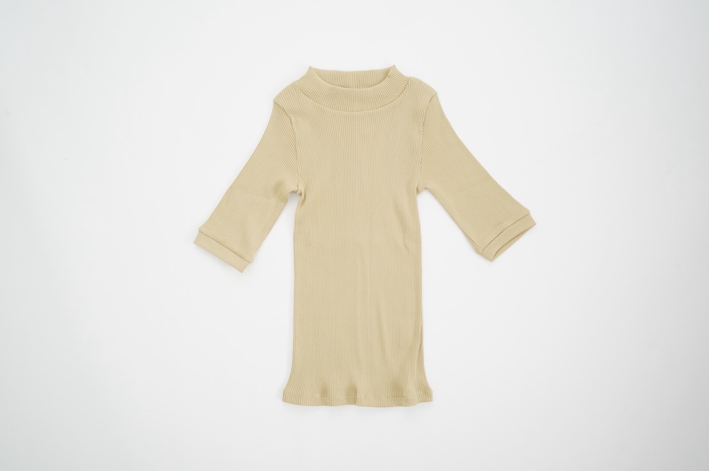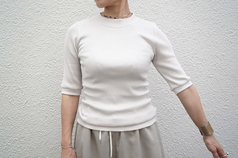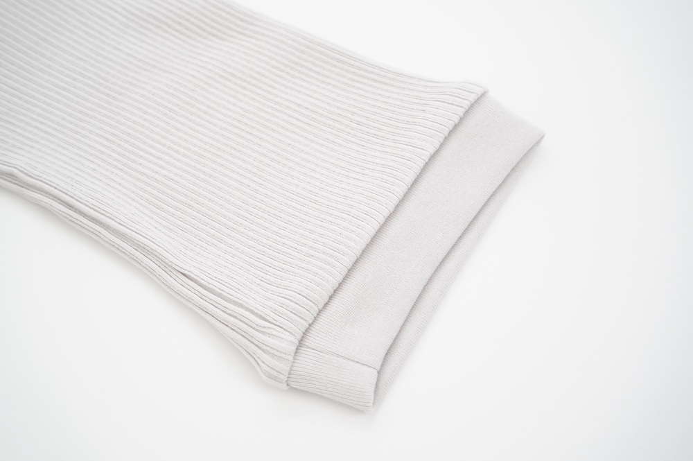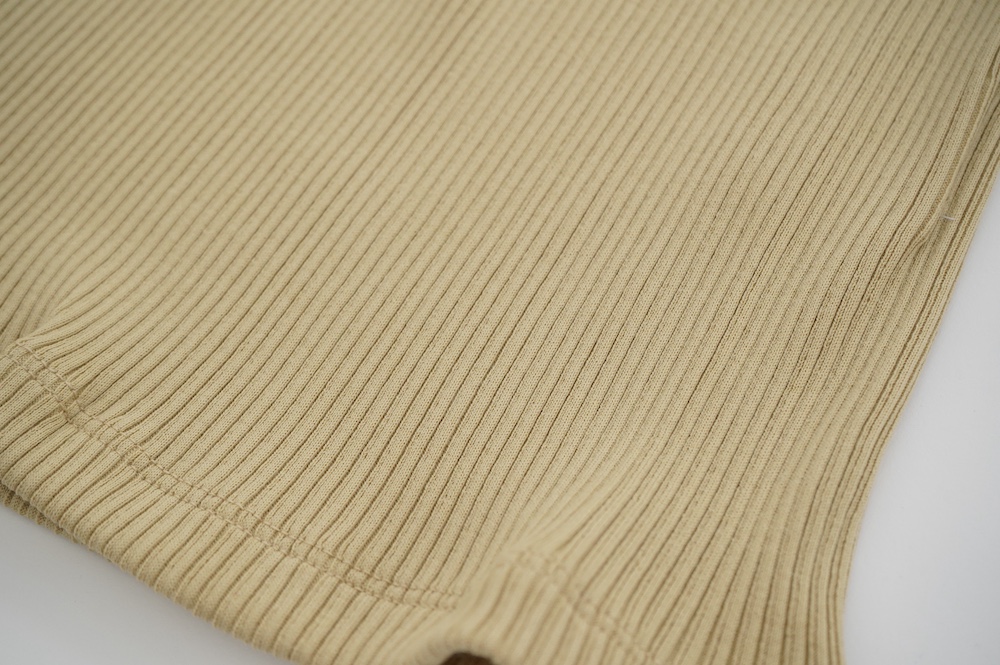 50/2スーピマコットンを使用した丸胴の変則テレコ生地を使用。コットンシルクのrib innerシリーズと比較すると糸番手が太い分生地がしっかりしていてテンションも強めですが、ポリウレタン混ではないので着用をしていくうちに徐々に緩くなっていきます。 細身で程よく体にフィットしインナーとしても着られるので、夏から秋口までの長い期間活躍してくれそうです。透ける心配がないので、もちろん1枚で着てもカッコ良いです。