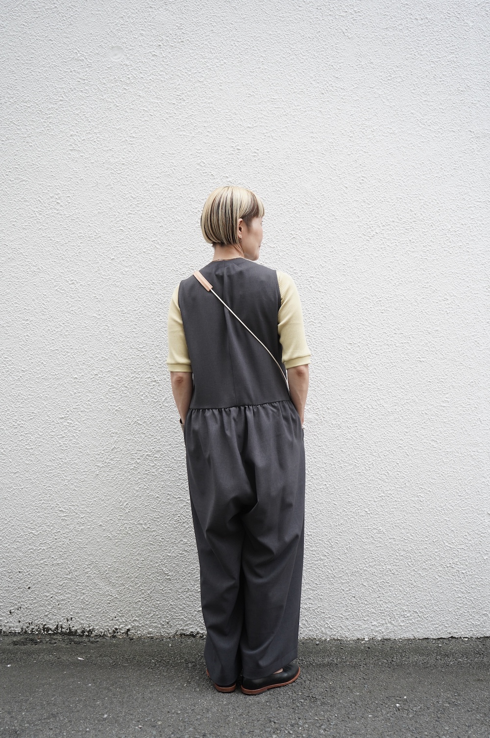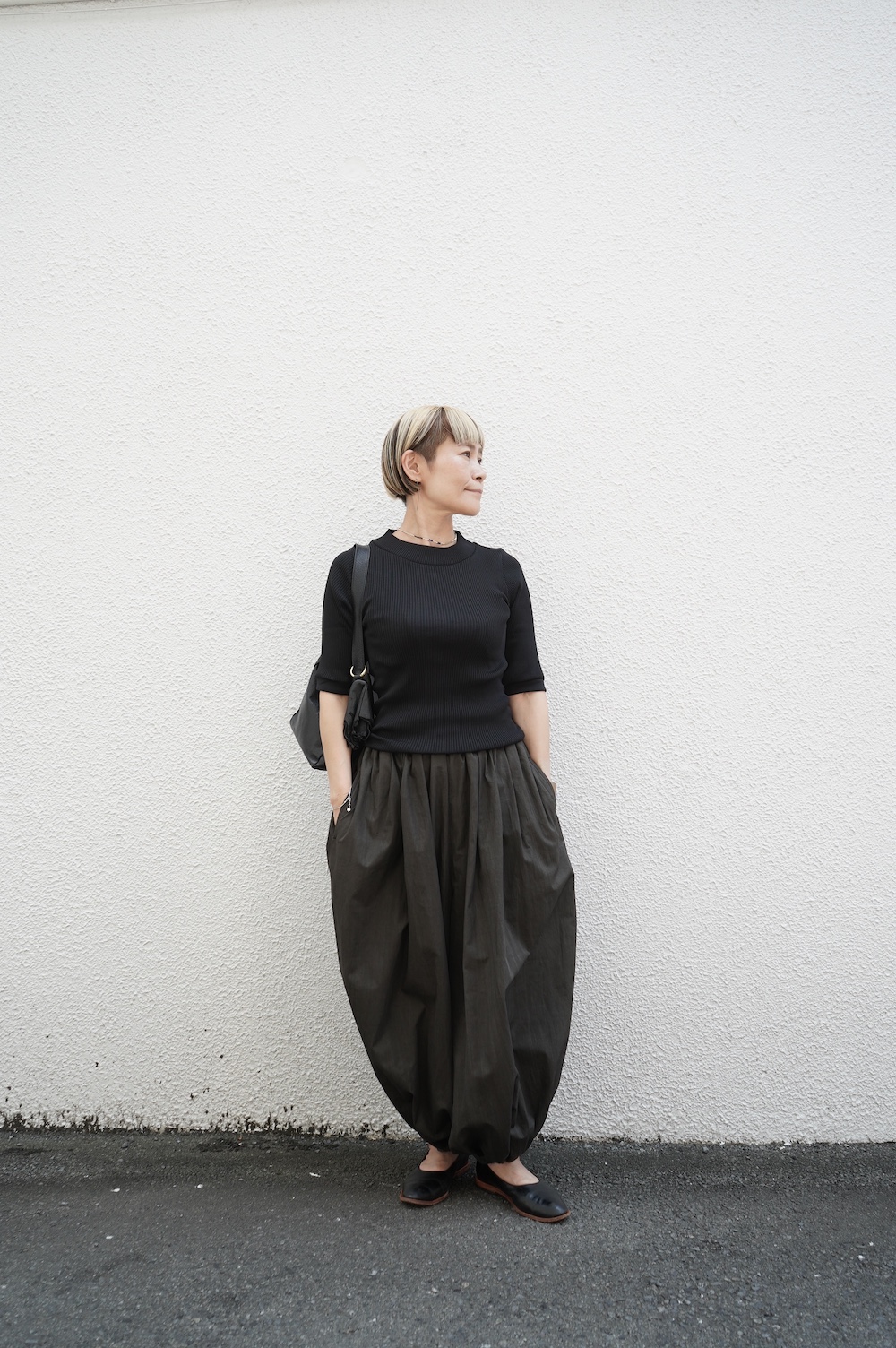デザインはシンプルな半袖Tee。共地で太めの襟ぐりをとったボートネック寄りの開きと肘までの五部袖で大人っぽい雰囲気です。