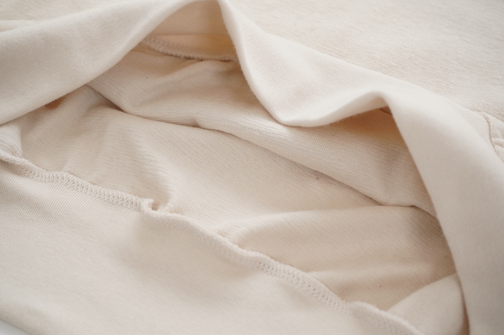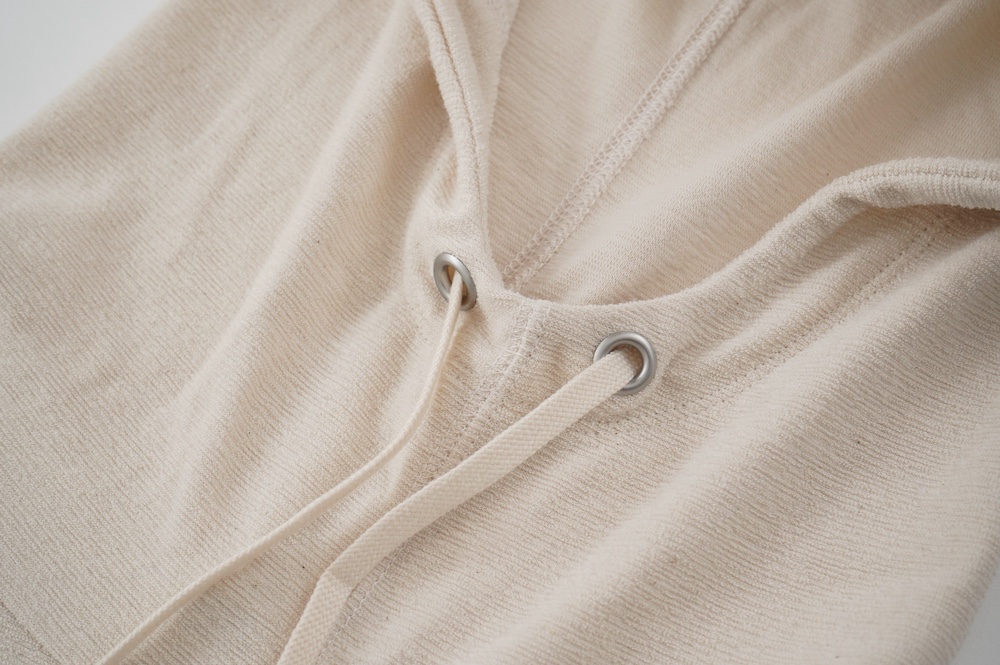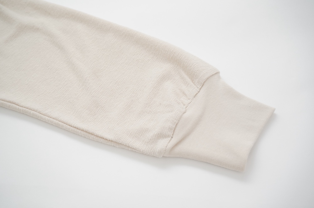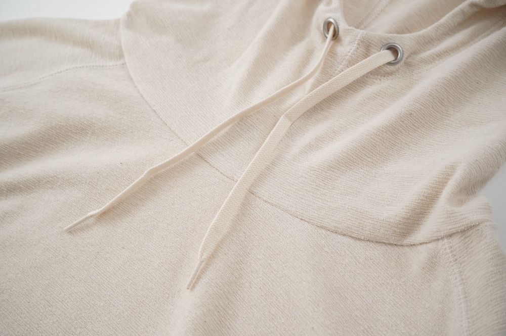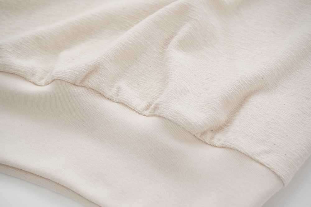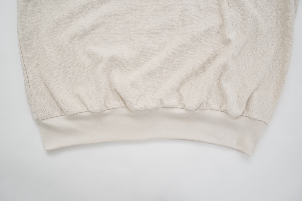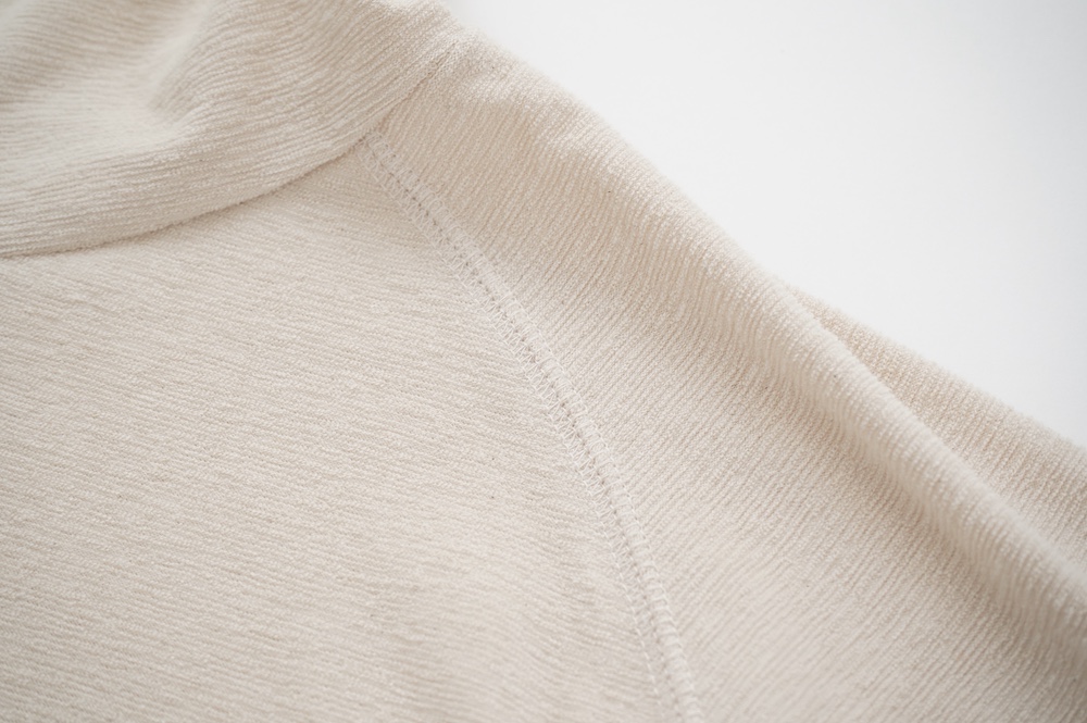 通常のパイル生地よりループがとても小さく、かさばらない薄手のパイル生地を使用。梨地のようなさらっとした手触りです。毛羽が少ないコンパクトヤーンと通常の綿糸を組み合わせ使う事で、タオル地のようなボソッとしたラフ感はなく、なめらかで綺麗な仕上がり。伸縮性もございます。ドライタッチな大人のパイル生地です。