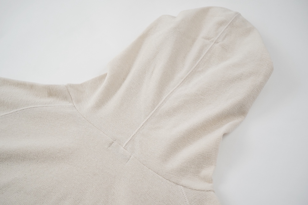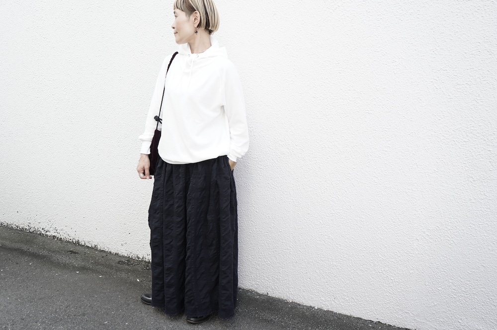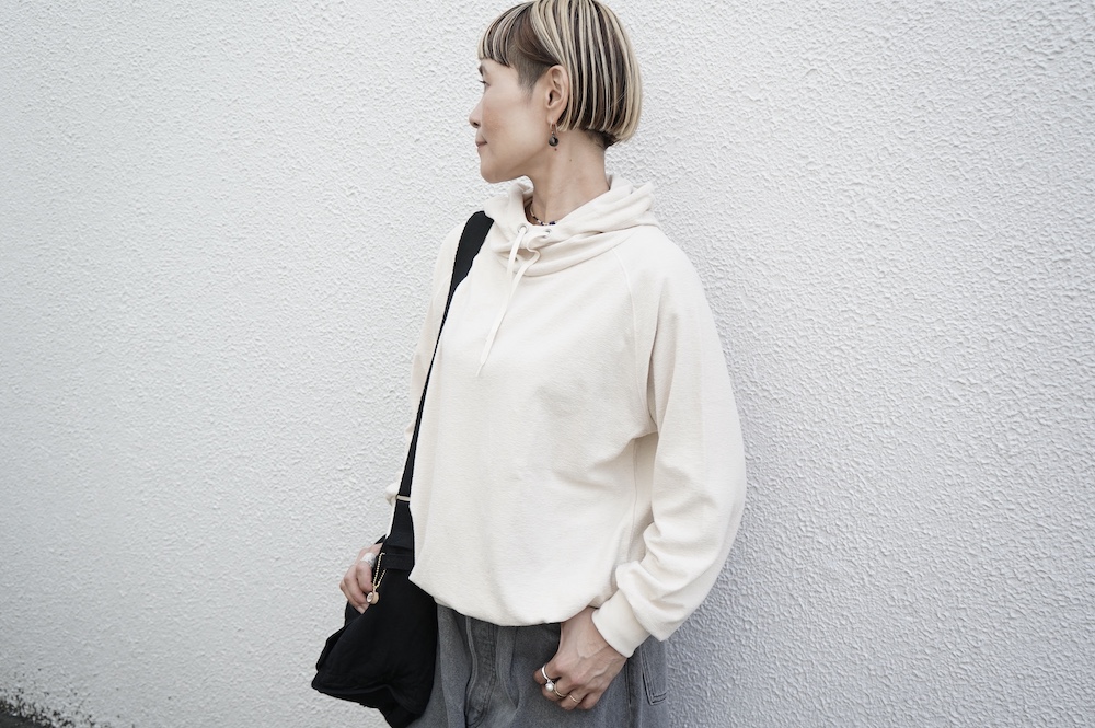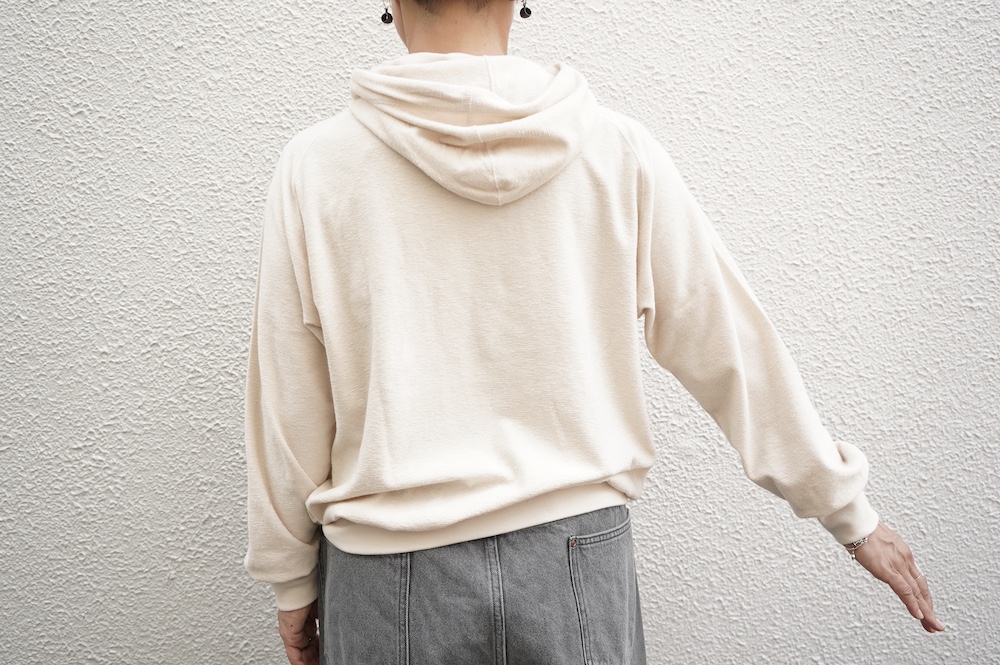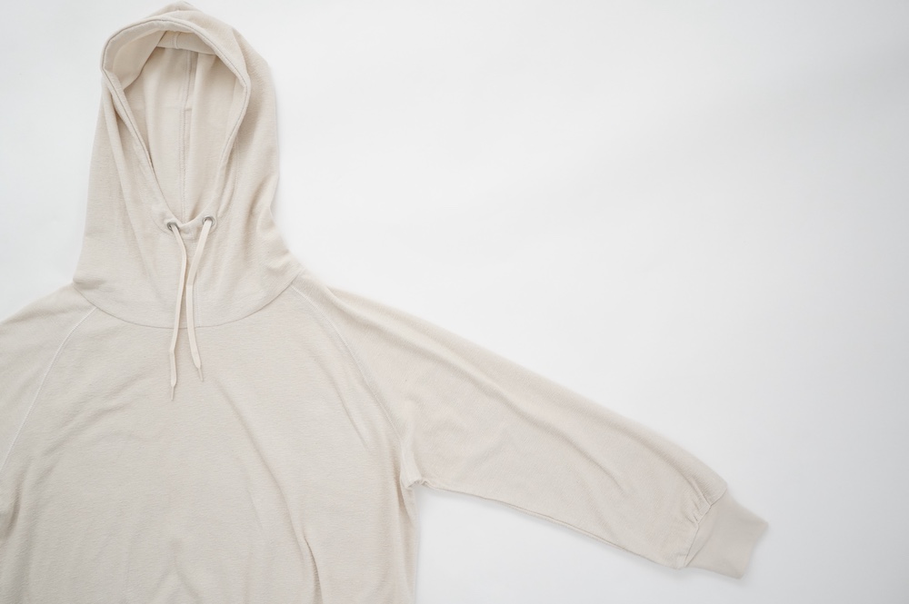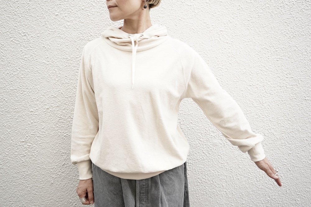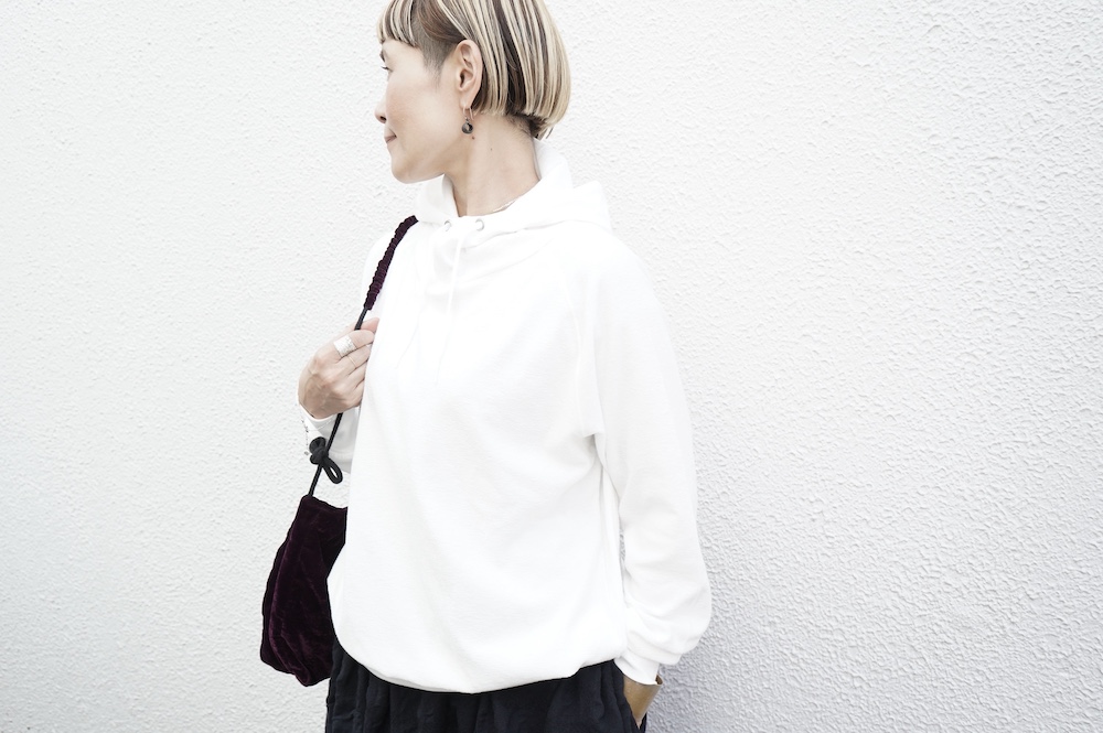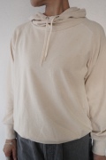シンプルなデザインのプルオーバーフーディ。ネック部分のクシュっとした弛みが可愛いらしい。ポケットなどの装飾はあえて無くして、潔い大人なフーディです。薄手の生地なので、上にジャケットやカーディガン等を羽織っても着て頂きやすく、またフード付きなのに軽い着心地も魅力です。