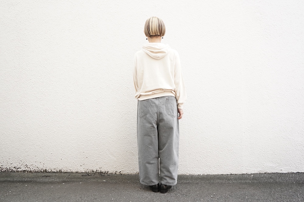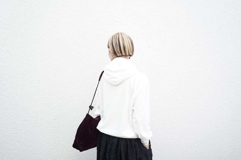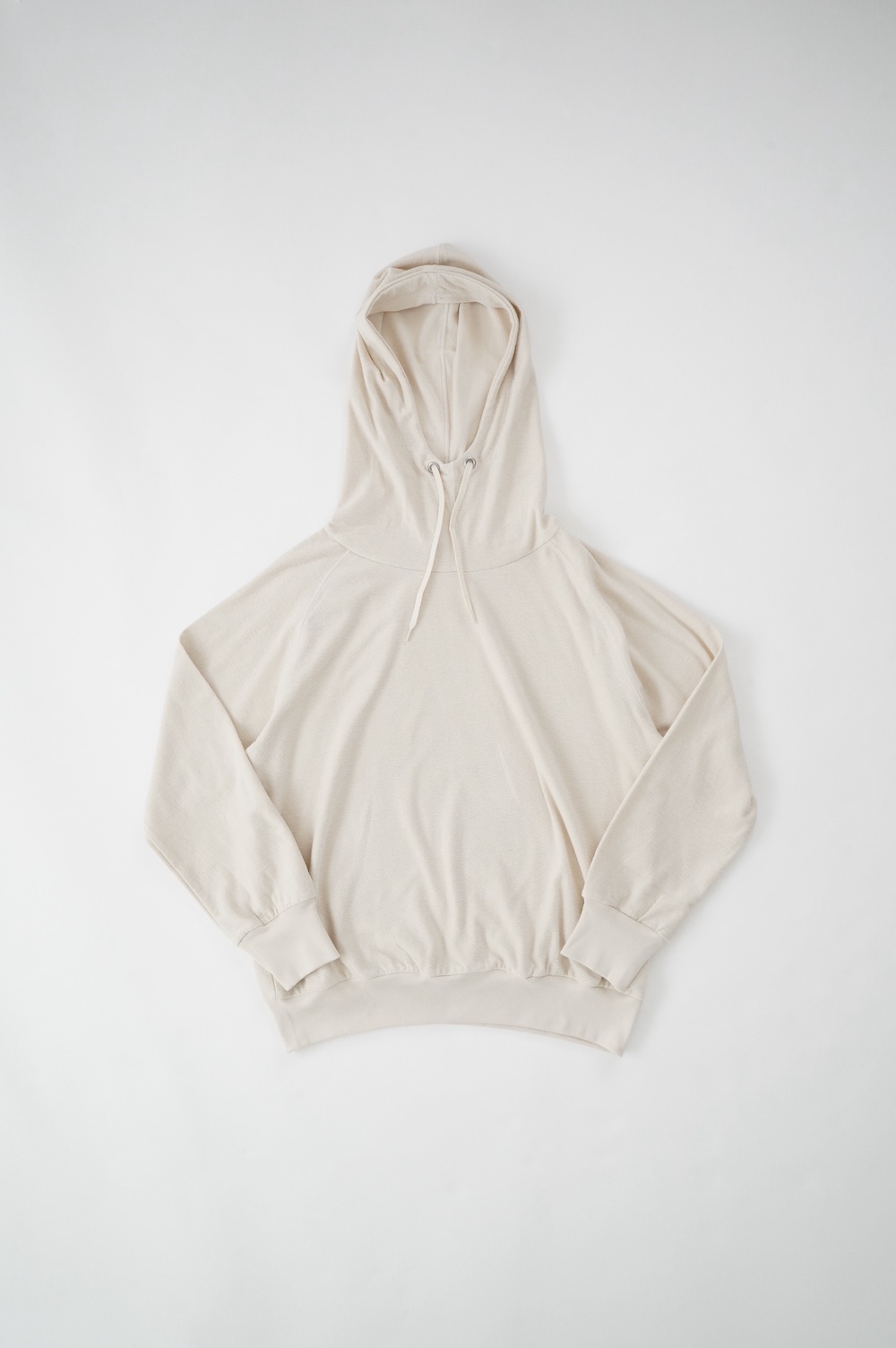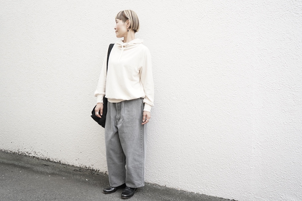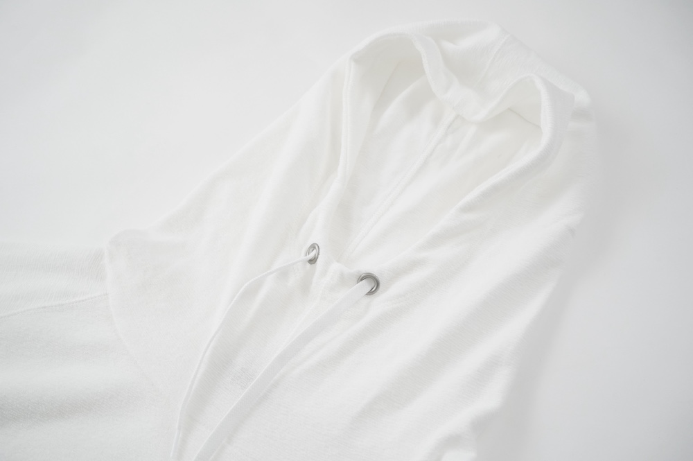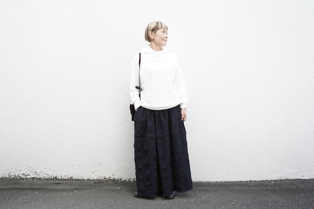 シンプルなデザインのプルオーバーフーディ。ネック部分のクシュっとした弛みが可愛いらしい。ポケットなどの装飾はあえて無くして、潔い大人なフーディです。薄手の生地なので、上にジャケットやカーディガン等を羽織っても着て頂きやすく、またフード付きなのに軽い着心地も魅力です。