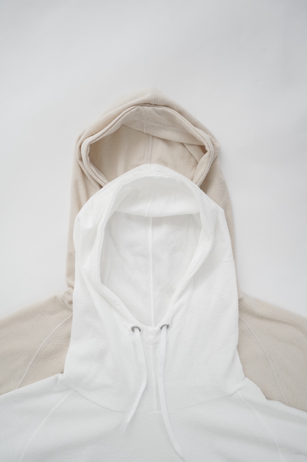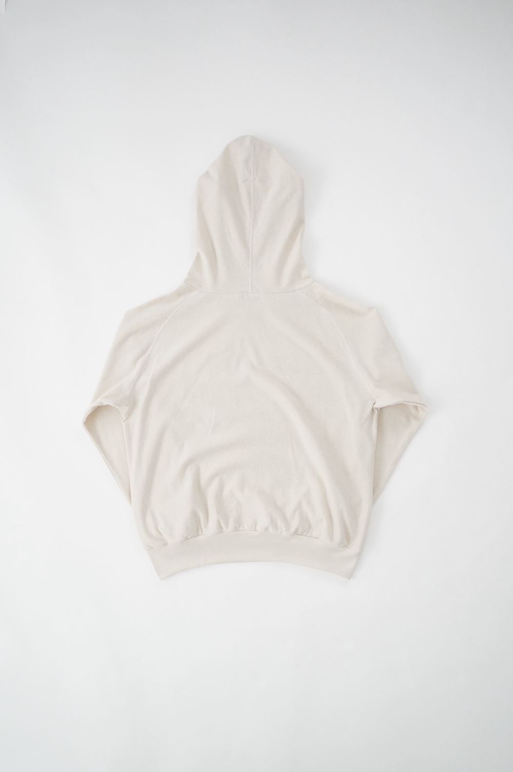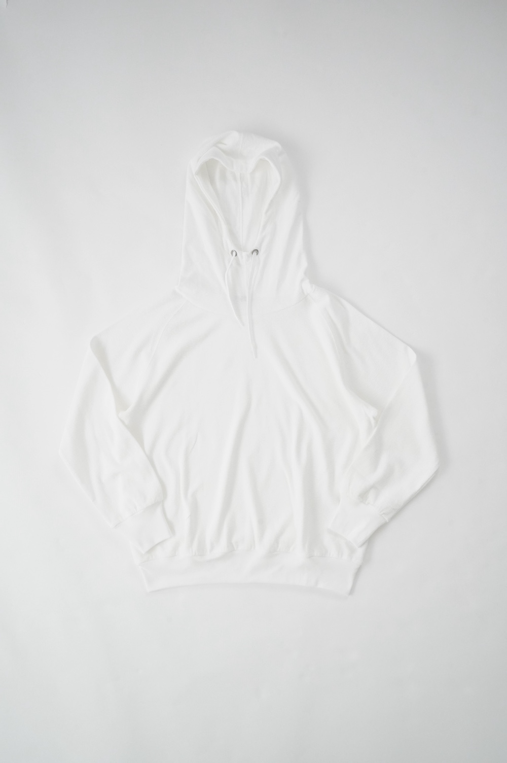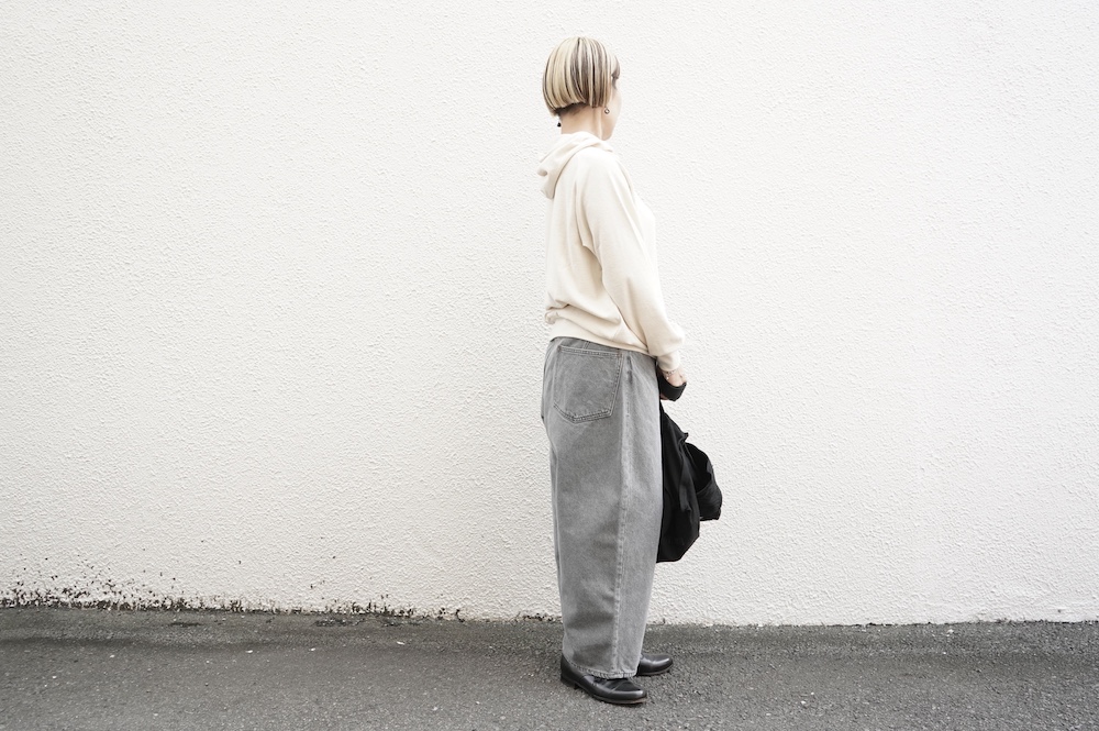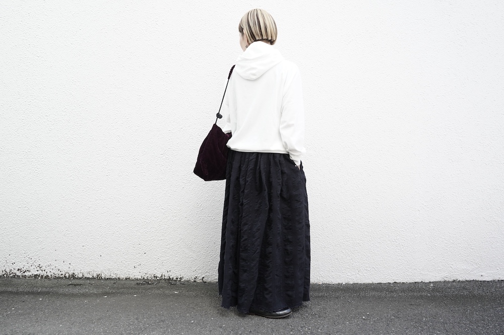 シンプルなデザインのプルオーバーフーディ。ネック部分のクシュっとした弛みが可愛いらしい。ポケットなどの装飾はあえて無くして、潔い大人なフーディです。薄手の生地なので、上にジャケットやカーディガン等を羽織っても着て頂きやすく、またフード付きなのに軽い着心地も魅力です。