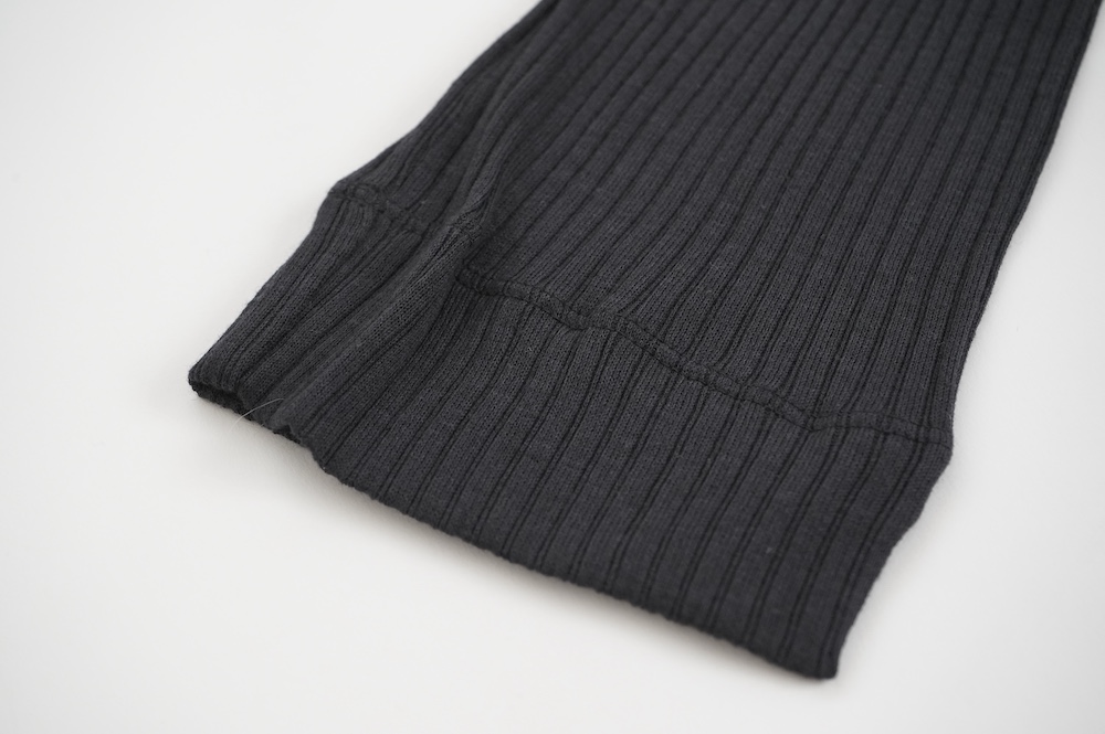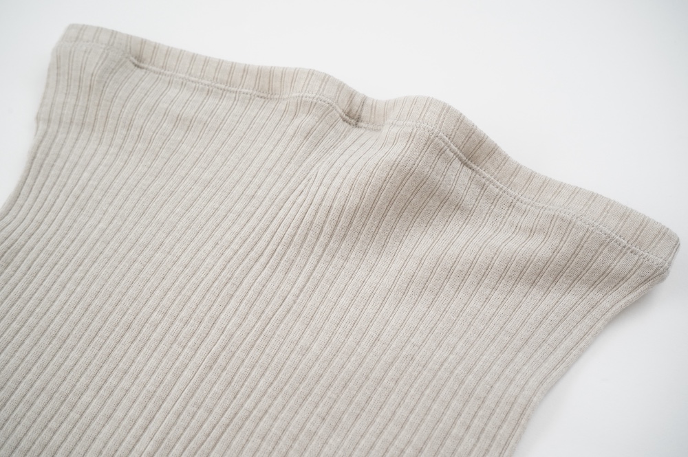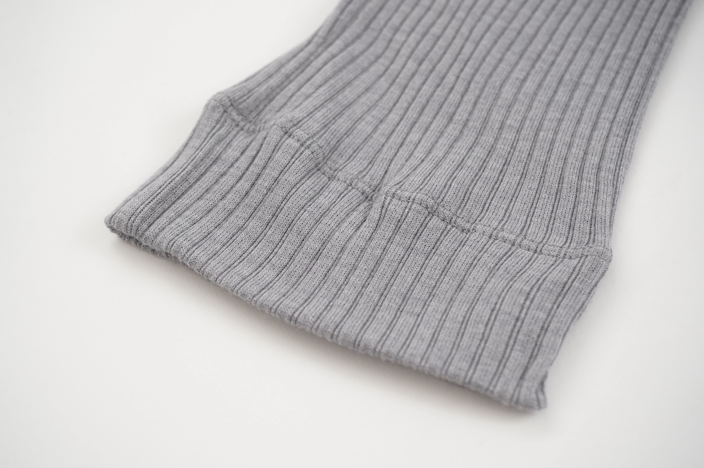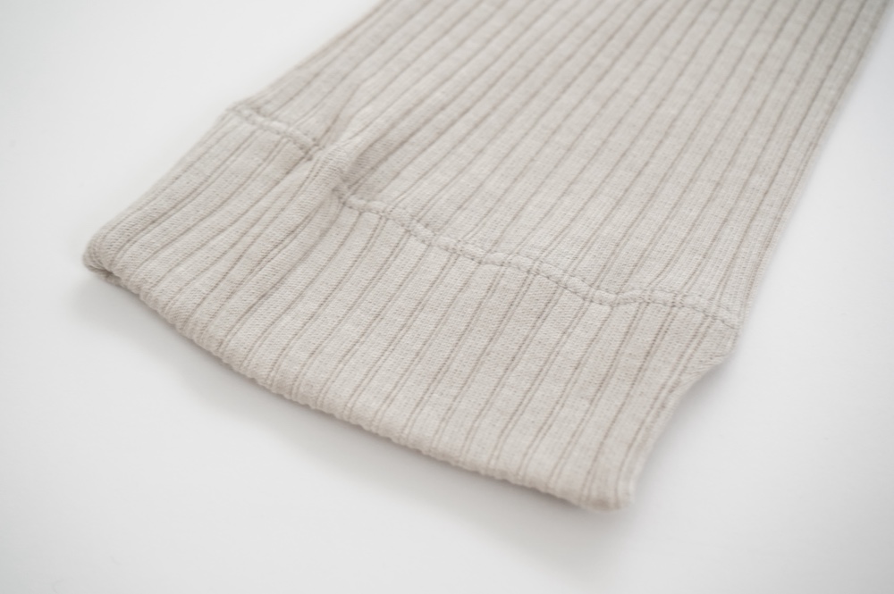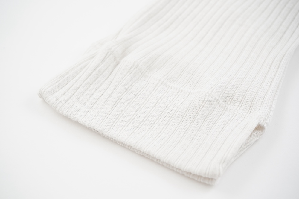 ウォッシャブルな優しいシルクを20%混紡することで、最高の肌触りを実現しています。変則的な凹凸を表現するテレコ素材は、旧式の編み機を用い、ゆっくりと時間をかけて編み立てることで原料に負荷をかけず、ふっくらとした編み上がりです。1日に30mしか編めない希少性の高い機械で編み立てているため、風合い、仕上がりの目面、雰囲気、着心地、どれをとっても申し分ない素晴らしいインナーです。