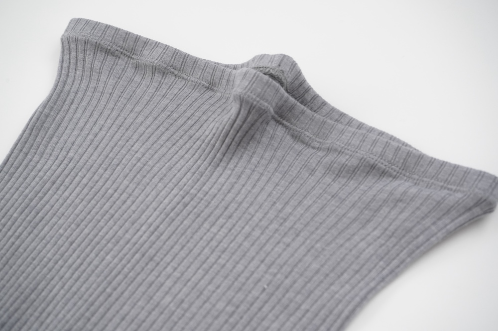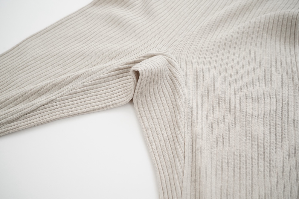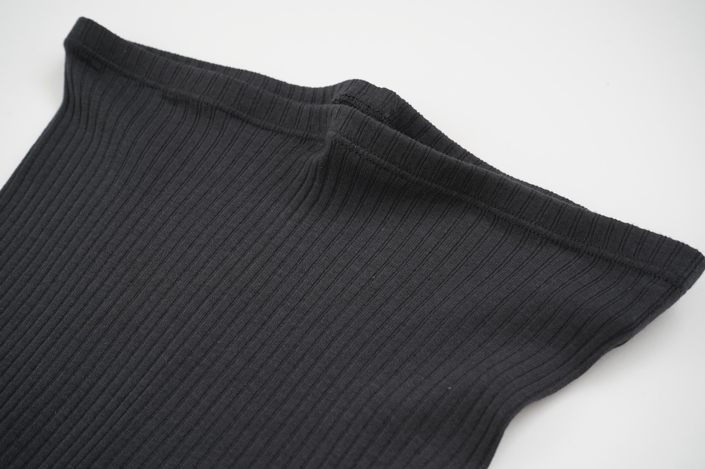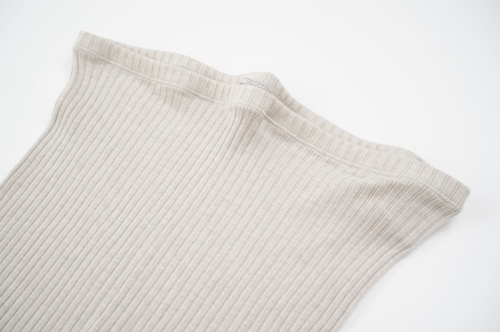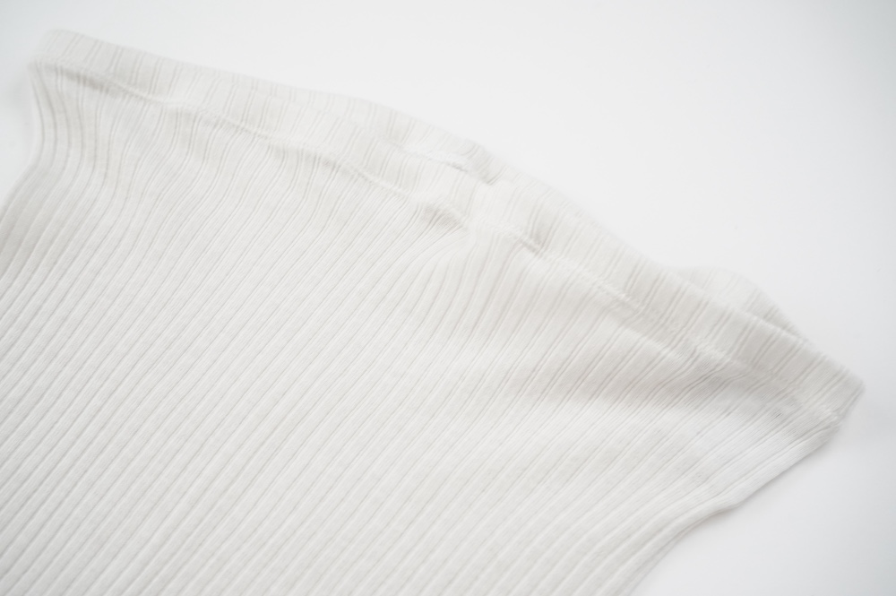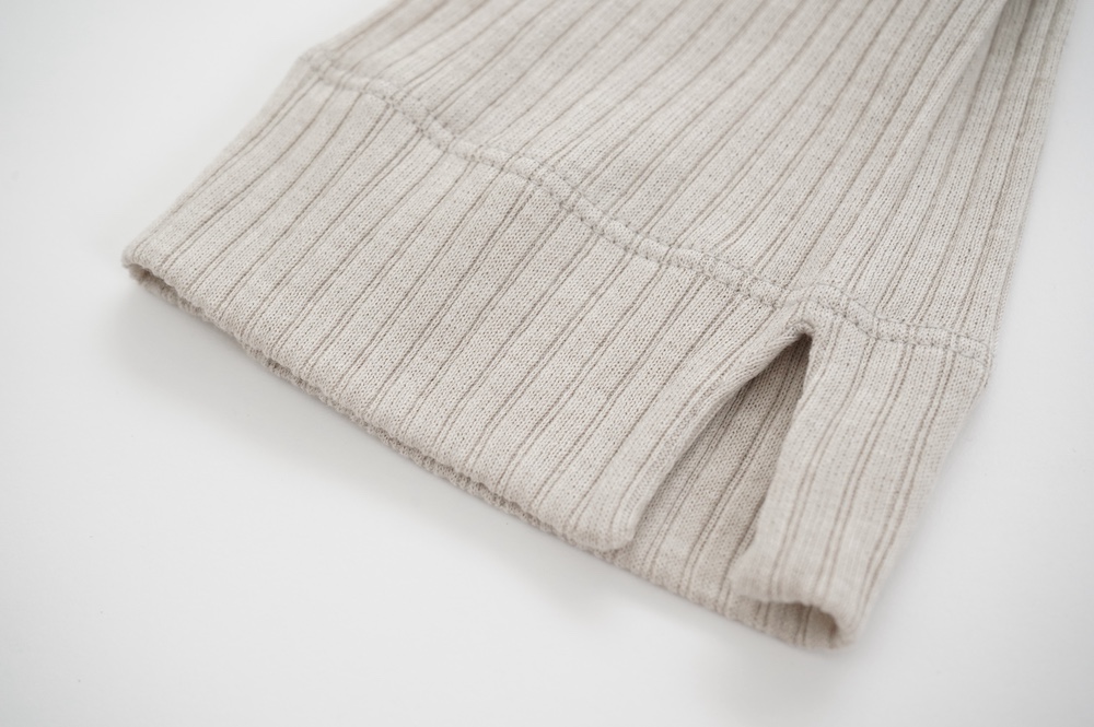 ウォッシャブルな優しいシルクを20%混紡することで、最高の肌触りを実現しています。変則的な凹凸を表現するテレコ素材は、旧式の編み機を用い、ゆっくりと時間をかけて編み立てることで原料に負荷をかけず、ふっくらとした編み上がりです。1日に30mしか編めない希少性の高い機械で編み立てているため、風合い、仕上がりの目面、雰囲気、着心地、どれをとっても申し分ない素晴らしいインナーです。