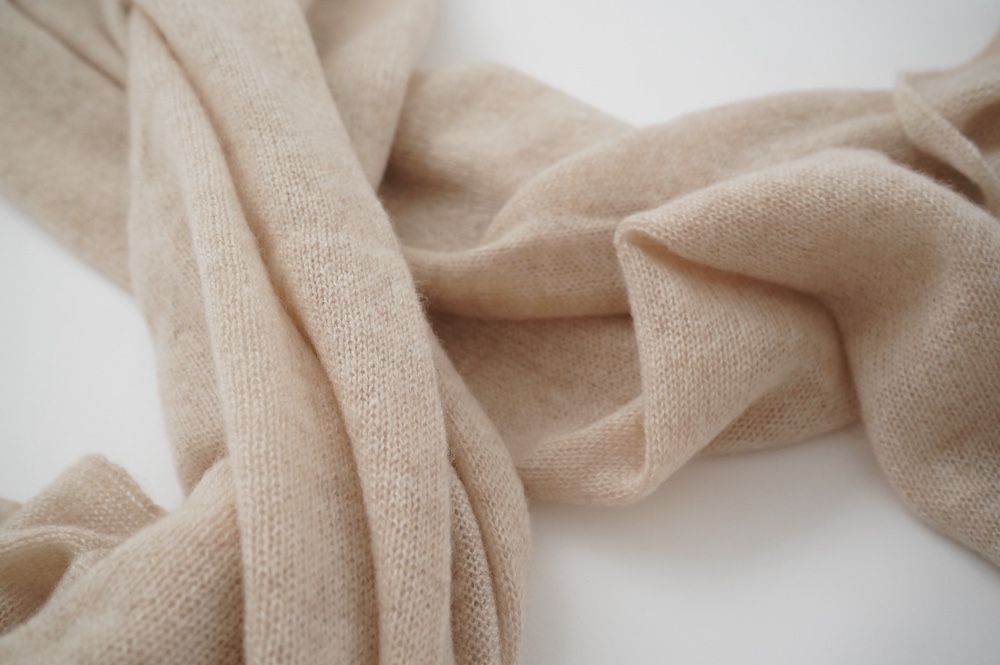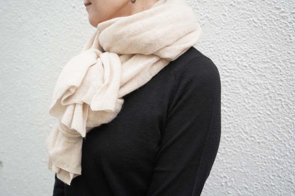 極細のカシミア糸でふんわりと甘く編み立てられたストール。ゆる編みという名前の通り、首に巻くとホワッと優しく包まれる、とても軽い巻き心地です。ニットなので肩からショールのようにかけるだけで暖かく、アウター選びが難しい季節にもとても心強いアイテムです。チクチクが苦手というお肌が敏感な方にもぜひ肌で感じていただきたい、特に首元は肌触りを重視される方にお勧めなストールです。