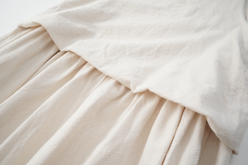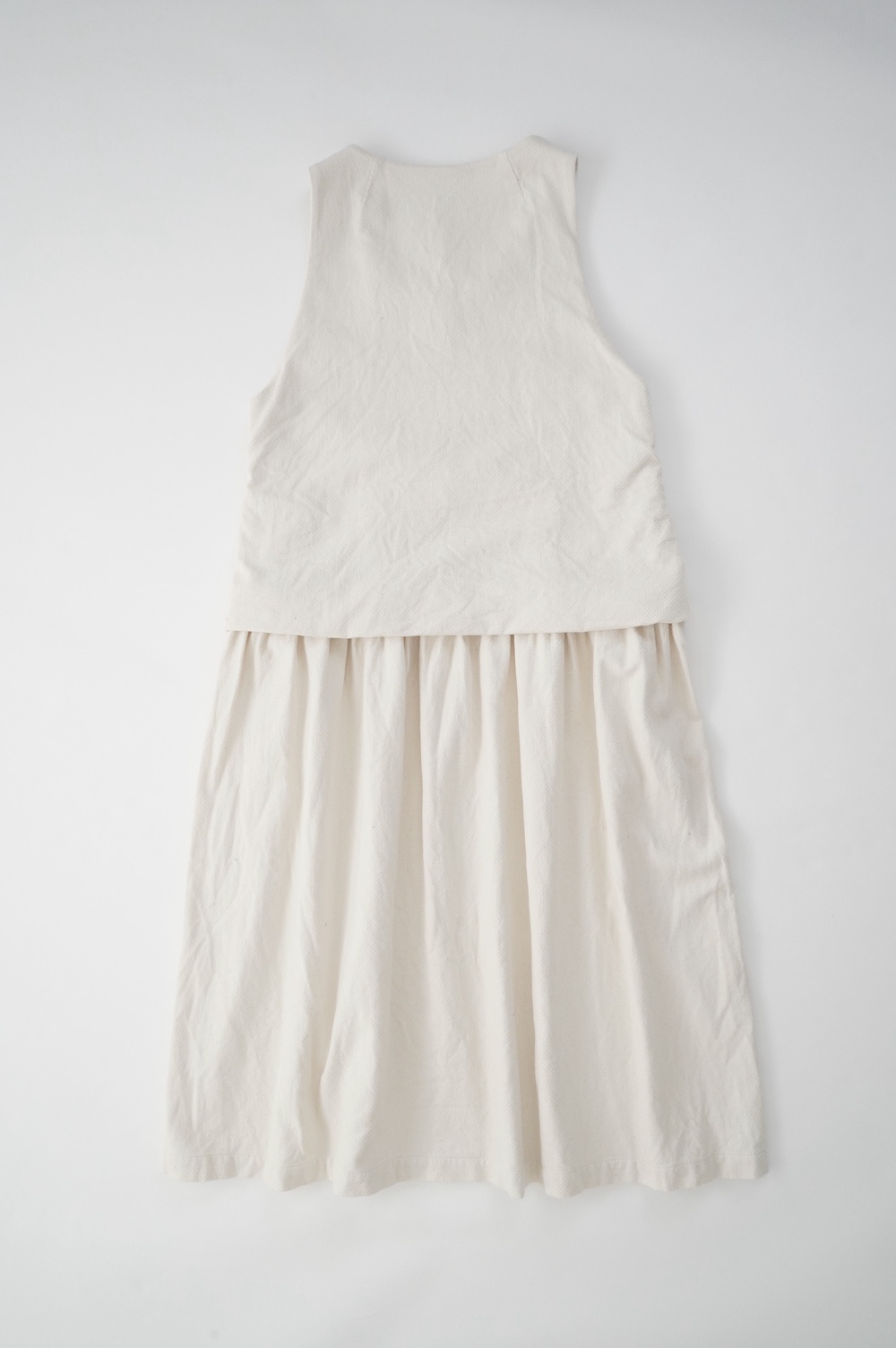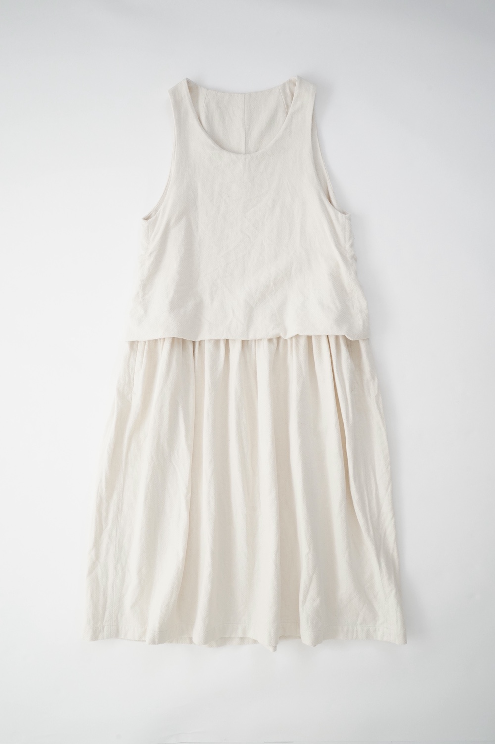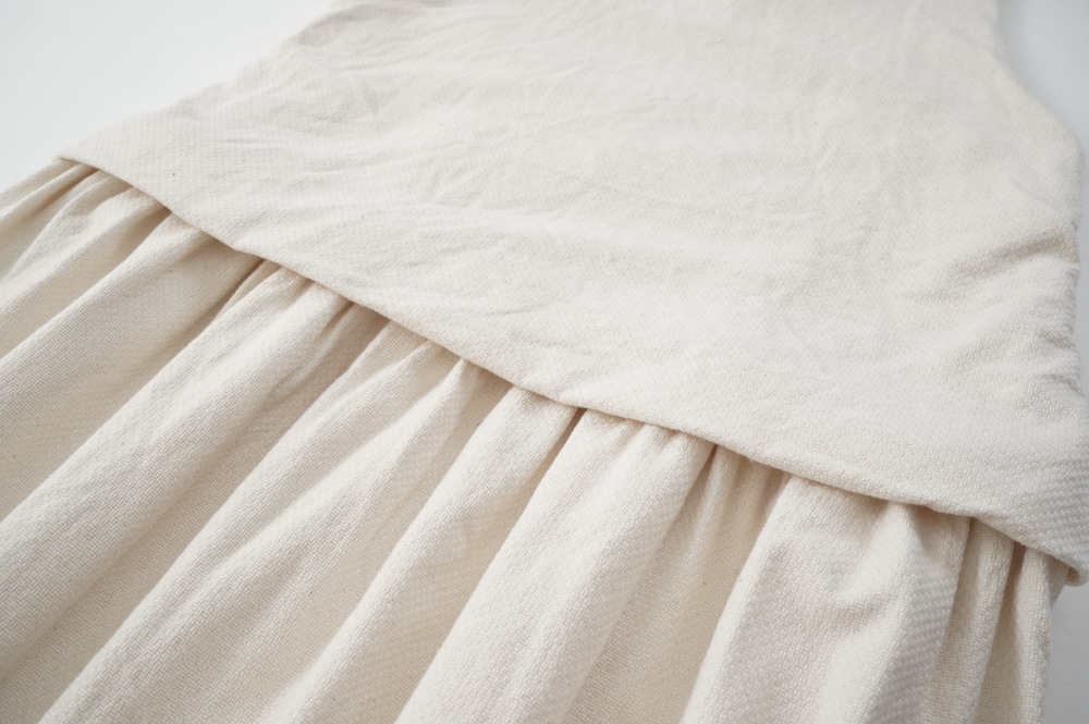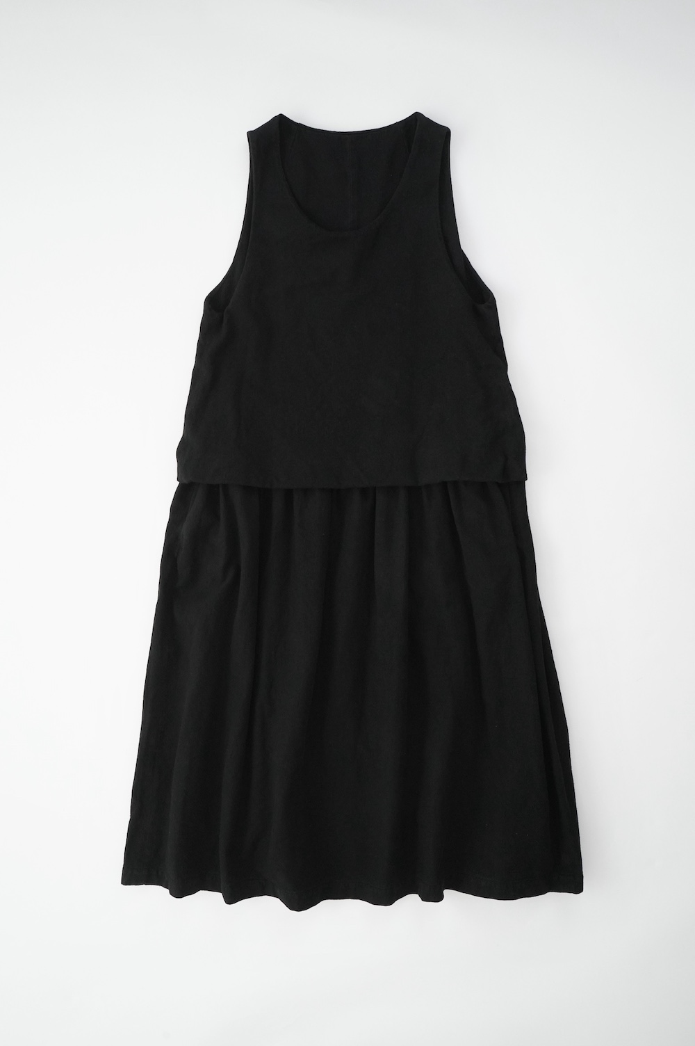 デザインはレイヤードが楽しめるノースリーブワンピース。大きめのアームホールで、ゆとりのあるサイズ感に仕上がっています。ウエストより下の腰あたりの位置でギャザー切り替えになっており、切り替え部分でふわっとブラウジングをしているようなデザインになっています。身頃はコットンの裏地付き、スカート部分は裏地なしです。シンプルにカットソーや、ブラウスやニットなどと組み合わせてレイヤードをお楽しみください。ライトベージュは未晒しで製品洗いのみ、ブラックは製品染めをしています。