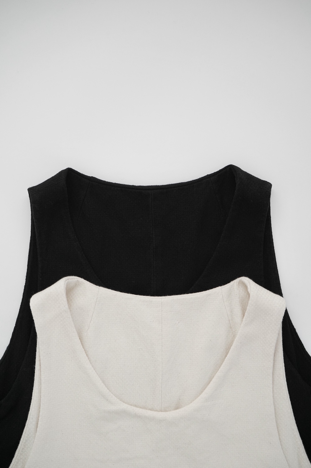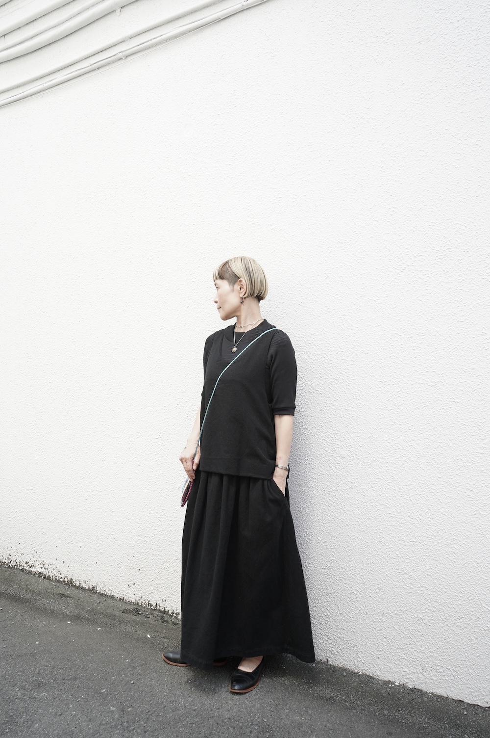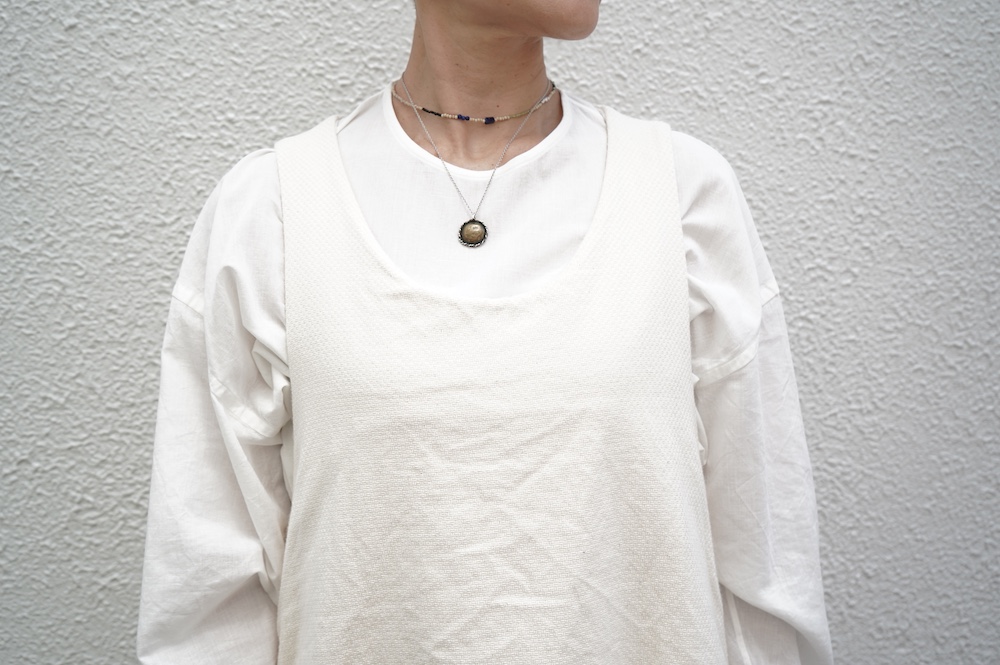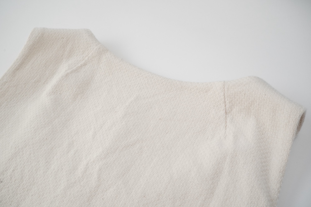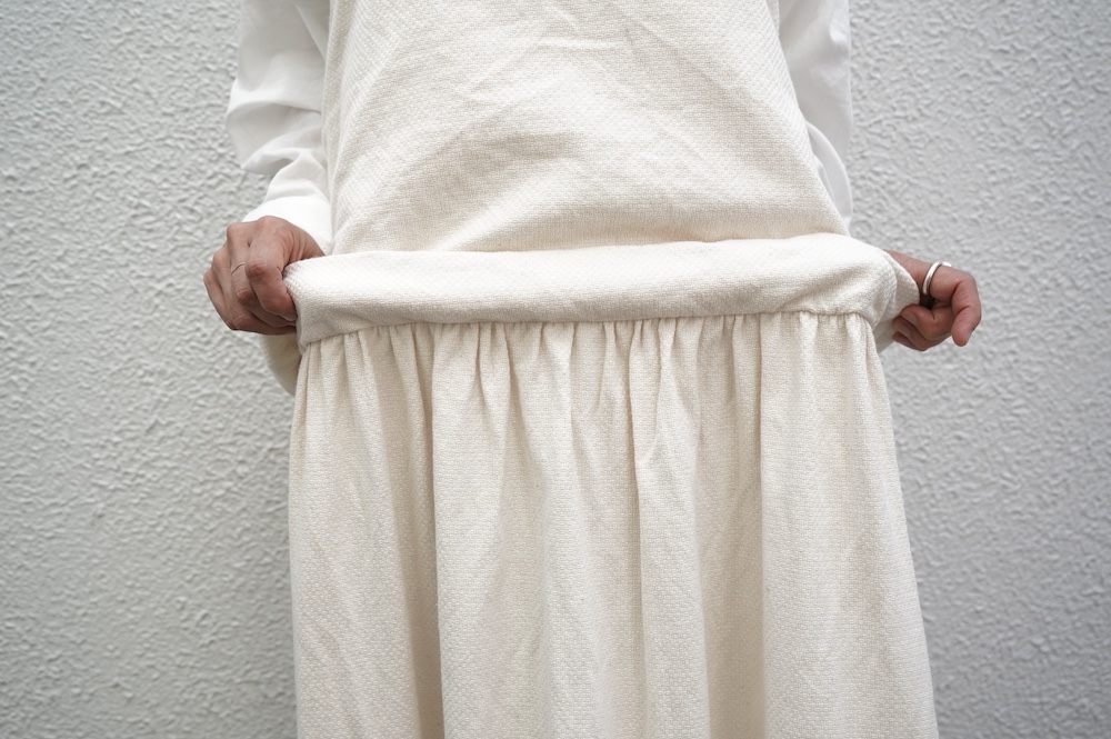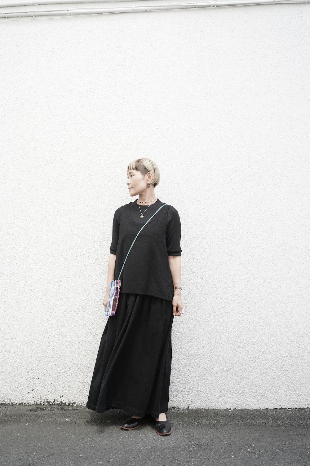 デザインはレイヤードが楽しめるノースリーブワンピース。大きめのアームホールで、ゆとりのあるサイズ感に仕上がっています。ウエストより下の腰あたりの位置でギャザー切り替えになっており、切り替え部分でふわっとブラウジングをしているようなデザインになっています。身頃はコットンの裏地付き、スカート部分は裏地なしです。シンプルにカットソーや、ブラウスやニットなどと組み合わせてレイヤードをお楽しみください。ライトベージュは未晒しで製品洗いのみ、ブラックは製品染めをしています。