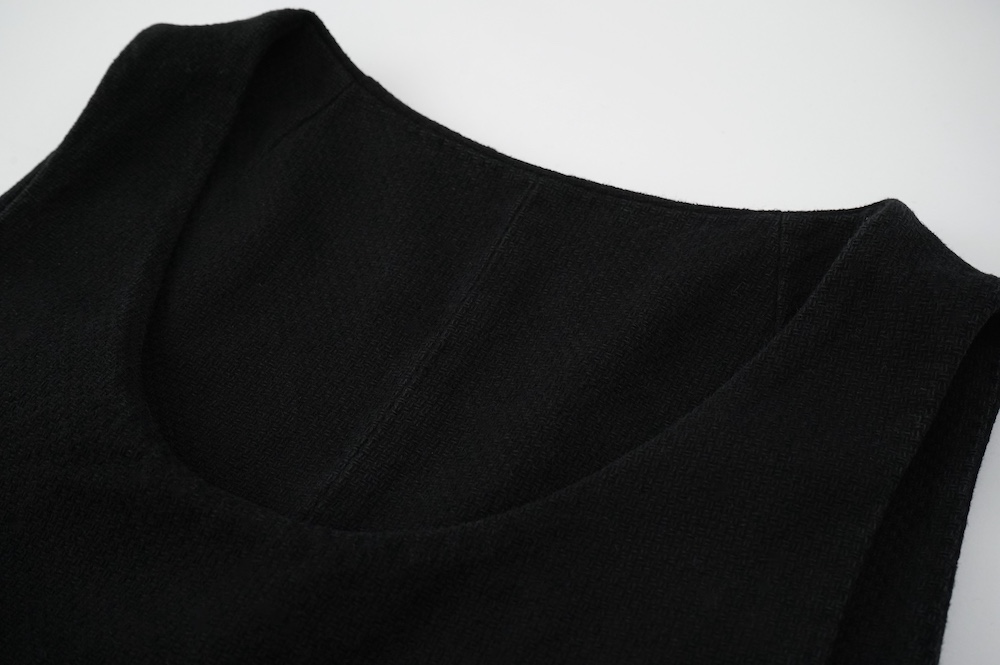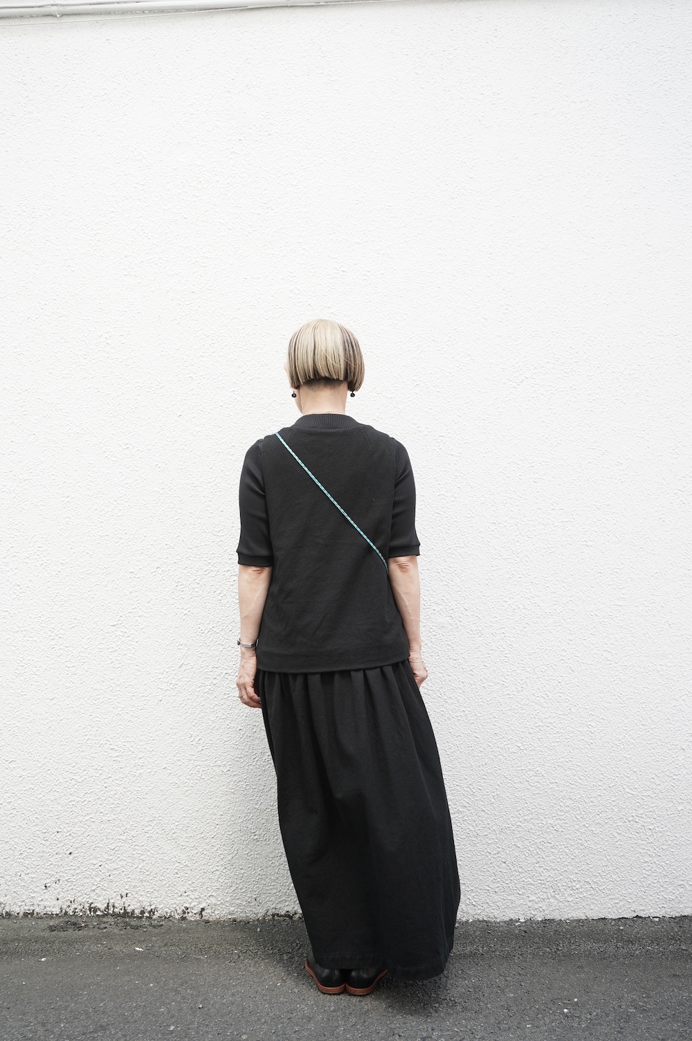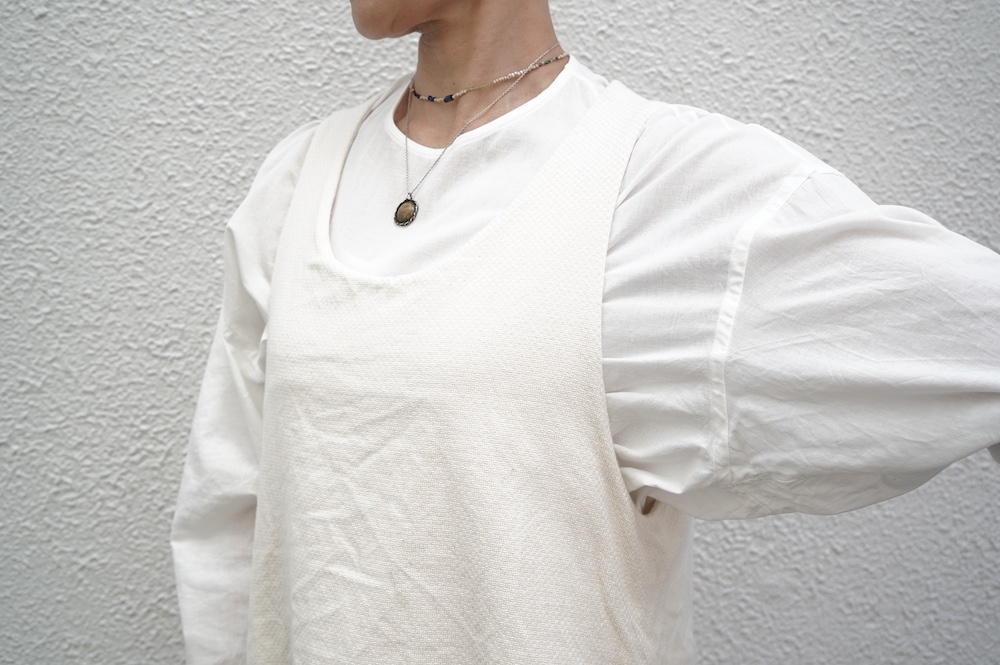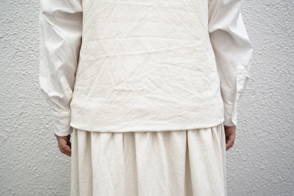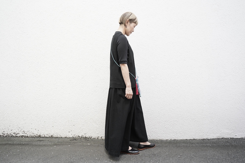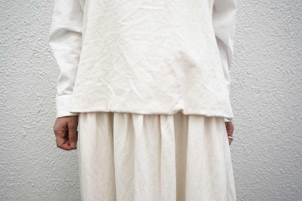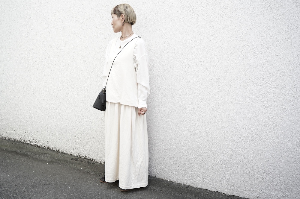 デザインはレイヤードが楽しめるノースリーブワンピース。大きめのアームホールで、ゆとりのあるサイズ感に仕上がっています。ウエストより下の腰あたりの位置でギャザー切り替えになっており、切り替え部分でふわっとブラウジングをしているようなデザインになっています。身頃はコットンの裏地付き、スカート部分は裏地なしです。シンプルにカットソーや、ブラウスやニットなどと組み合わせてレイヤードをお楽しみください。ライトベージュは未晒しで製品洗いのみ、ブラックは製品染めをしています。
