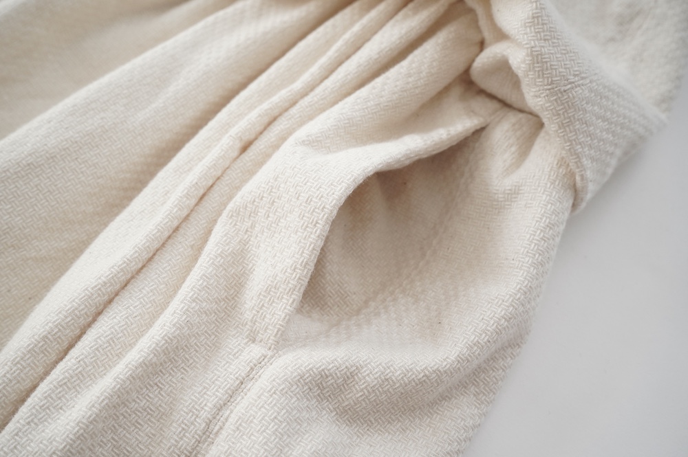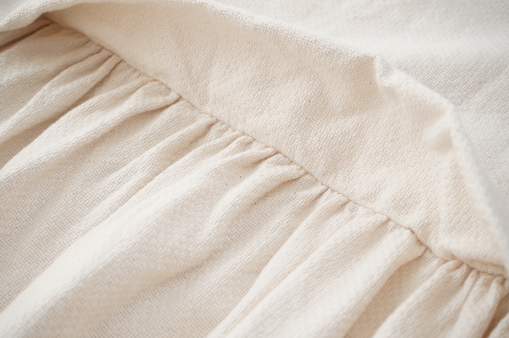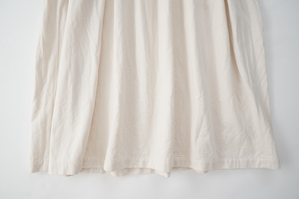 "ゴーシュ"のワンピース。経糸と緯糸で撚りが異なる綿糸で織り上げたコットンドビー生地を使用。凹凸のある織柄が表情豊かで、また柔らかな綿糸を使用しているのでふっくらとしたやわらかな肌触りに仕上がっています。とってもソフトな着心地です。