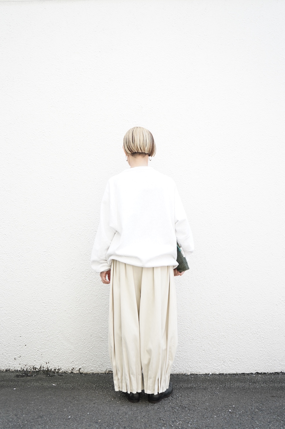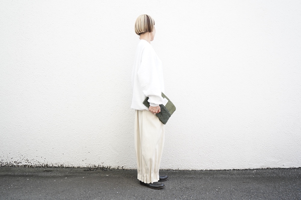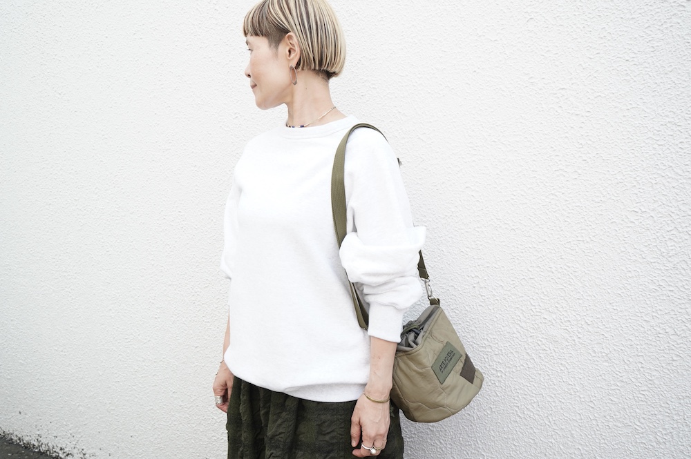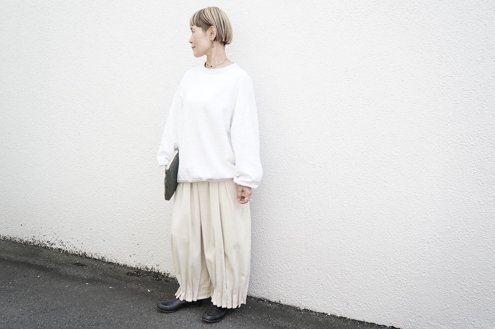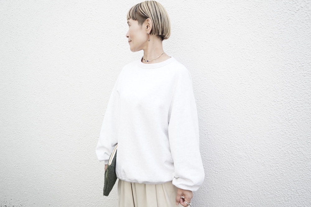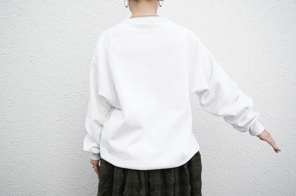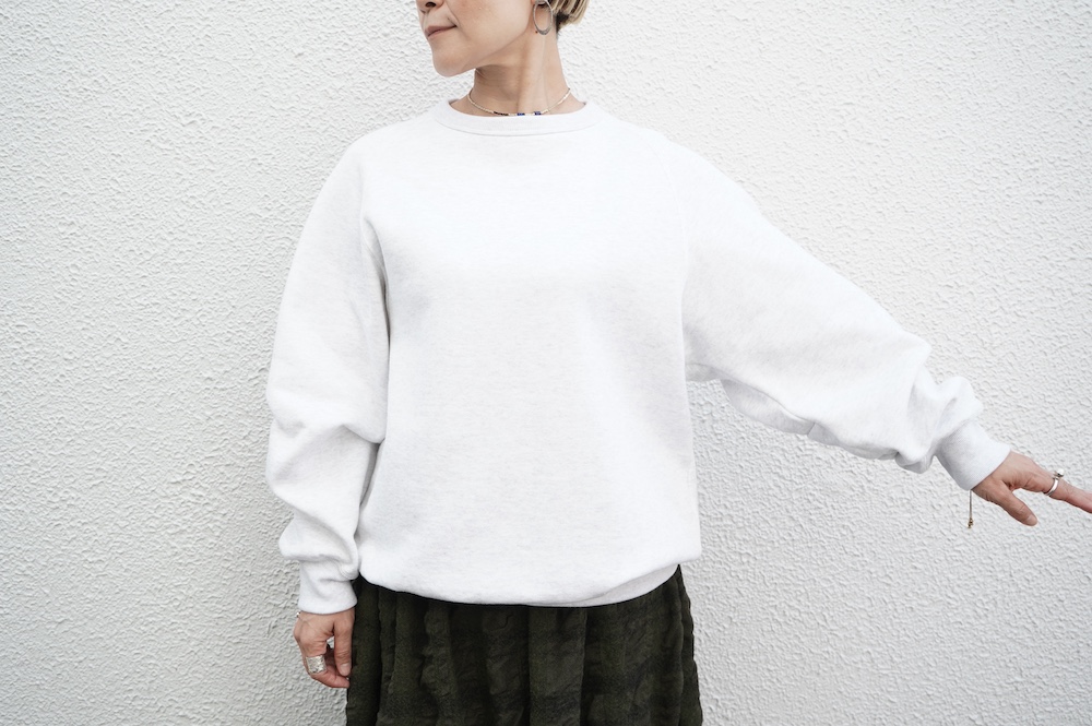 "ゴーシュ"のスウェット。ゴーシュ らしい上質な日常着。昔ながらの吊り編み機でゆっくりと編み立てられた裏毛生地は空気を含んだように柔らかく、膨らみのある風合いが魅力です。軽く起毛させることでしっとりとした肌触りと、温かい風合いに。デザインは身幅と着丈がゆったりとしたオーバーサイズ。シンプルなデザインながら、程よい首の開きや腕周りの動きやすさなど計算され尽くした大人なスウェットです。