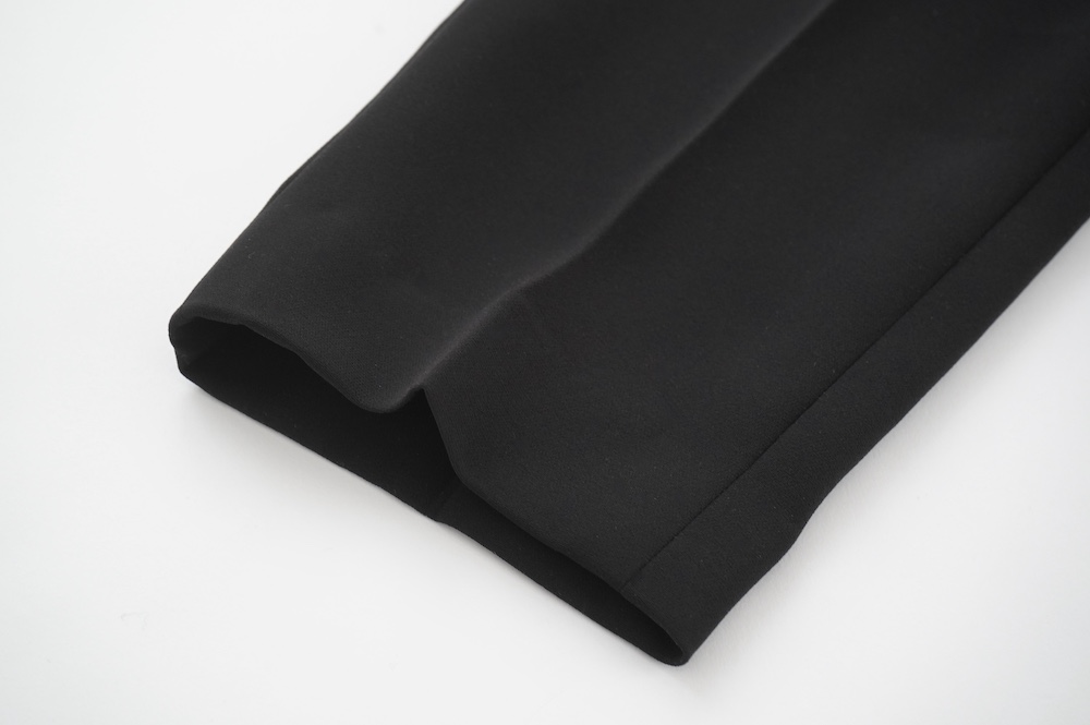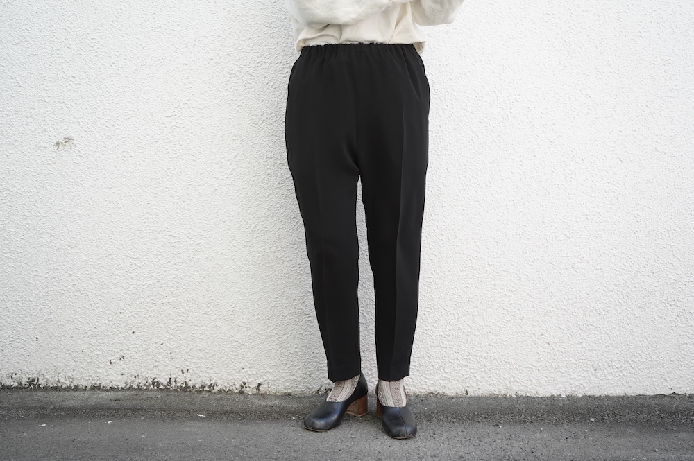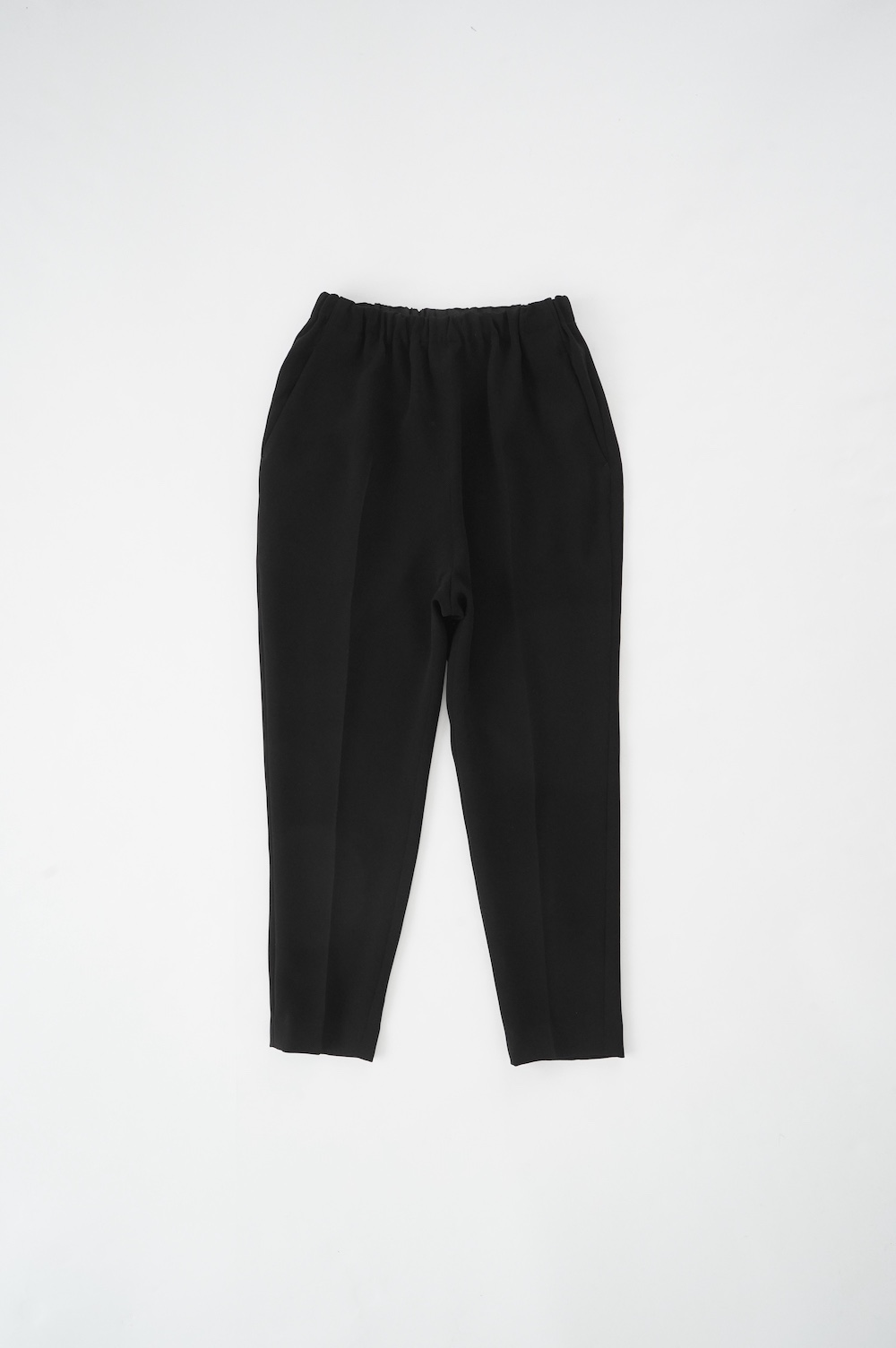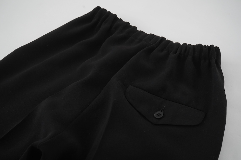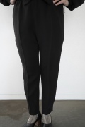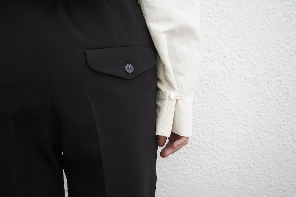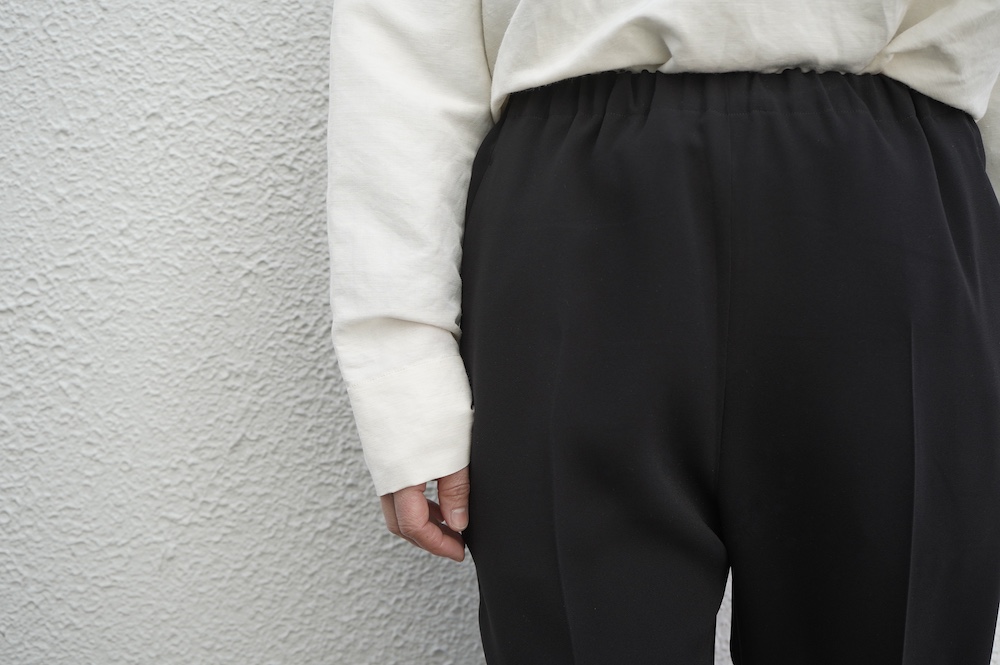 フォーマルでも使用できるストレッチの効いたアセテート&ポリエステル素材を使用。光沢感ととろみのある上品な素材で、シワになりづらいのもポイントです。パンツのシルエットは細身でスッキリとしたテーパード。センタープレスが施されているので、縦のラインが美しく際立ちます。着丈は少し短めの9分丈です。フォーマルシーンだけではなくお仕事やお食事などのちょっとした場面でも着ていただきやすく、また細身ながら少しストレッチ性のある素材なので着心地も窮屈感がありません。同素材のジャケットと合わせてセットアップがお勧めです。