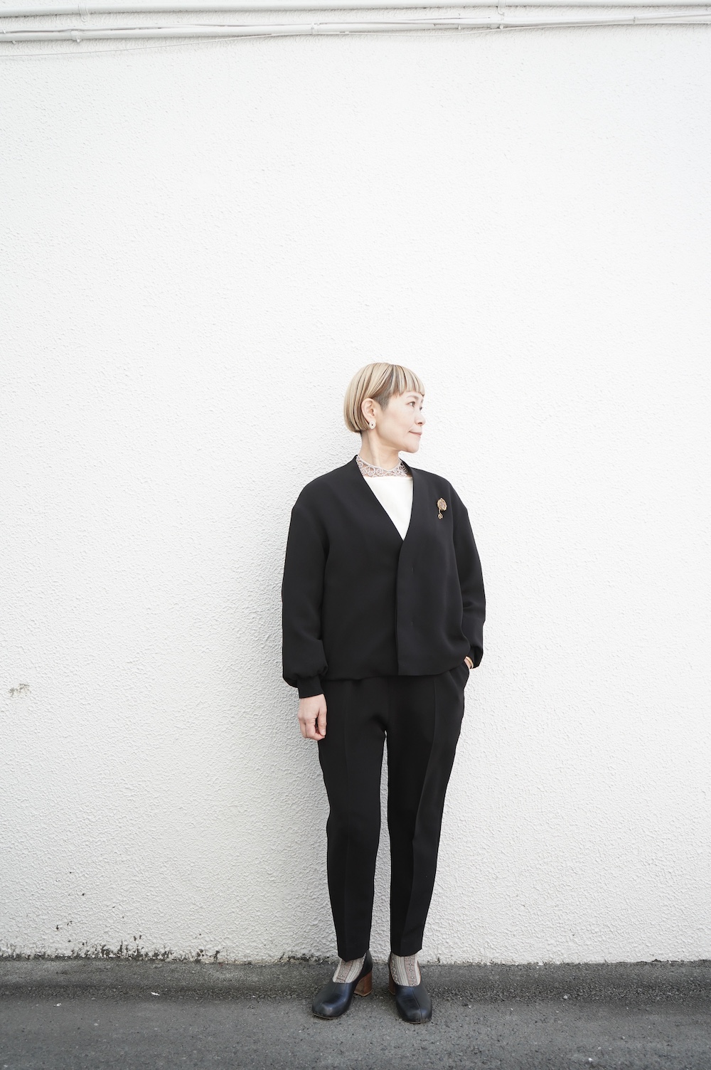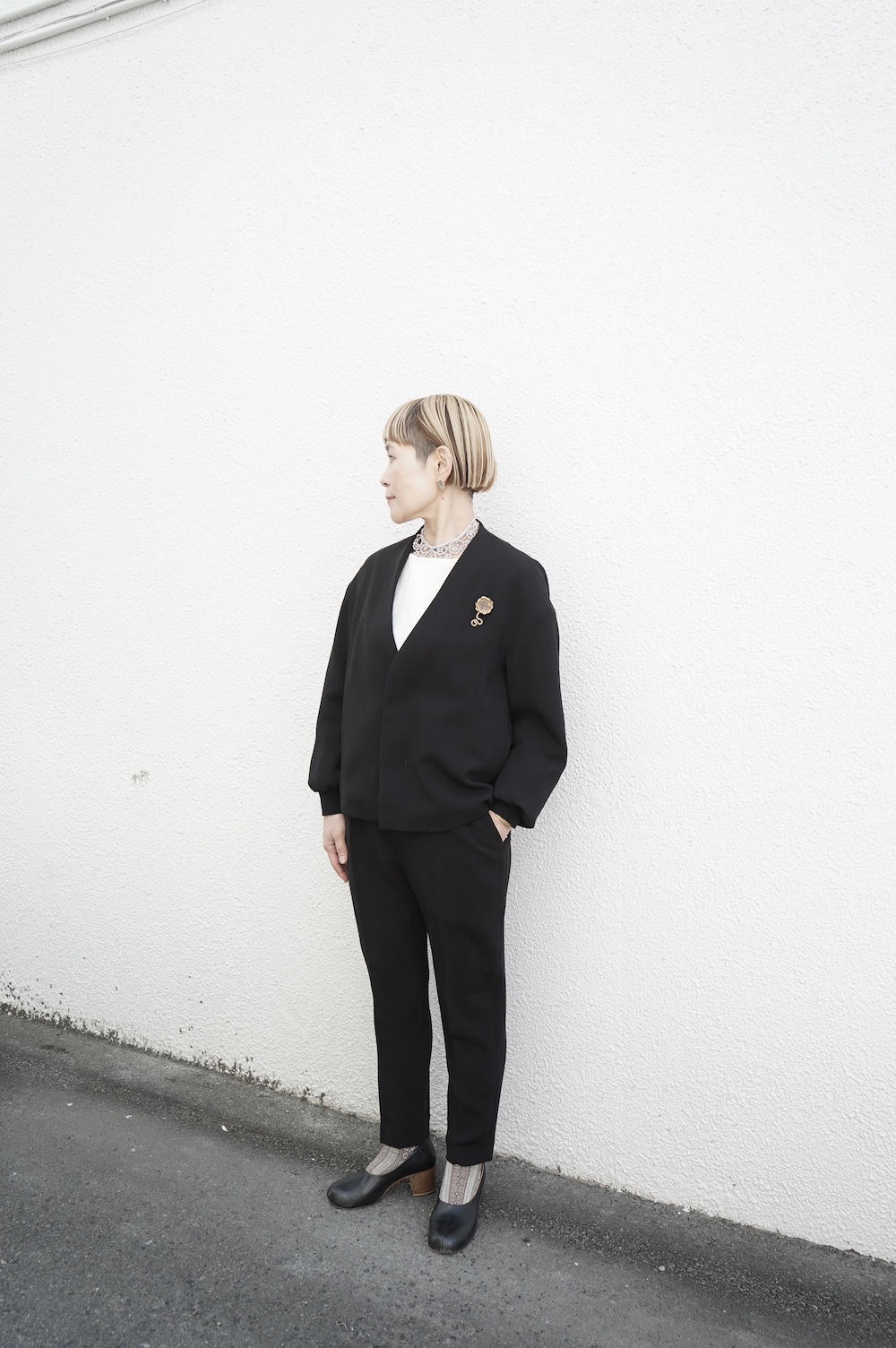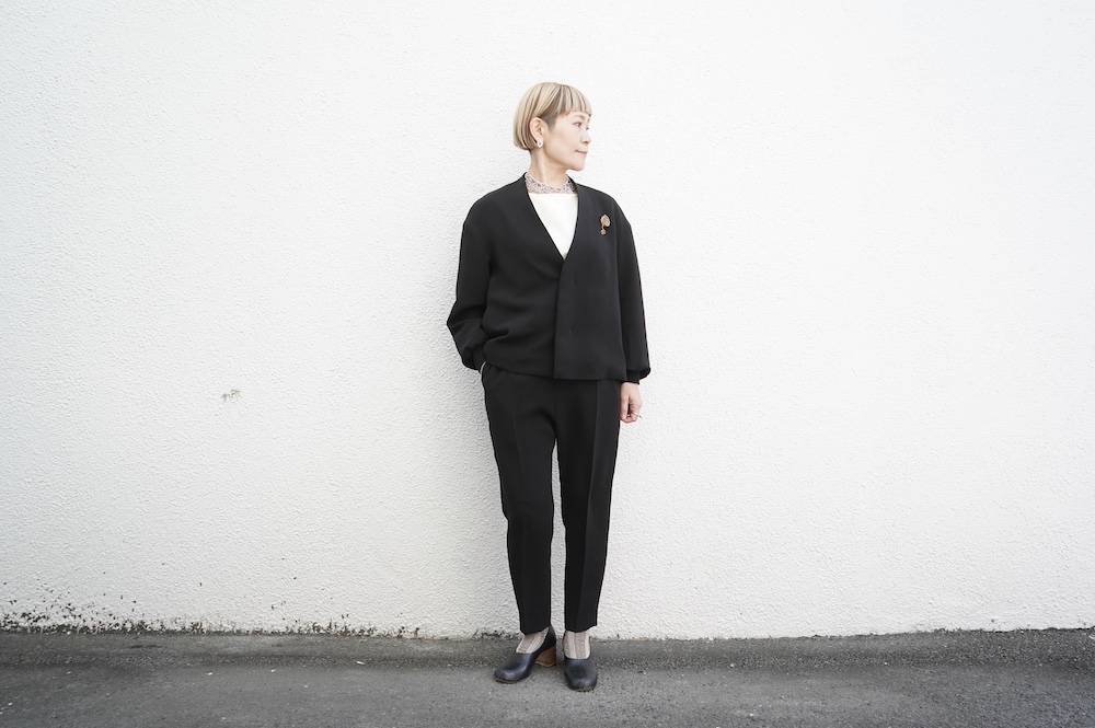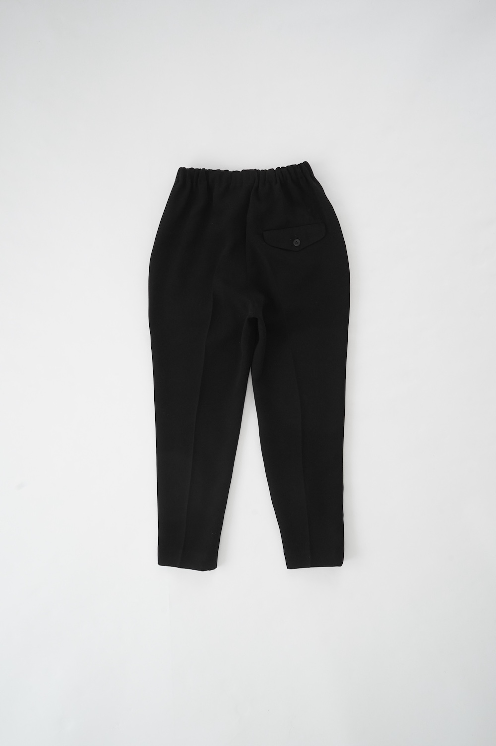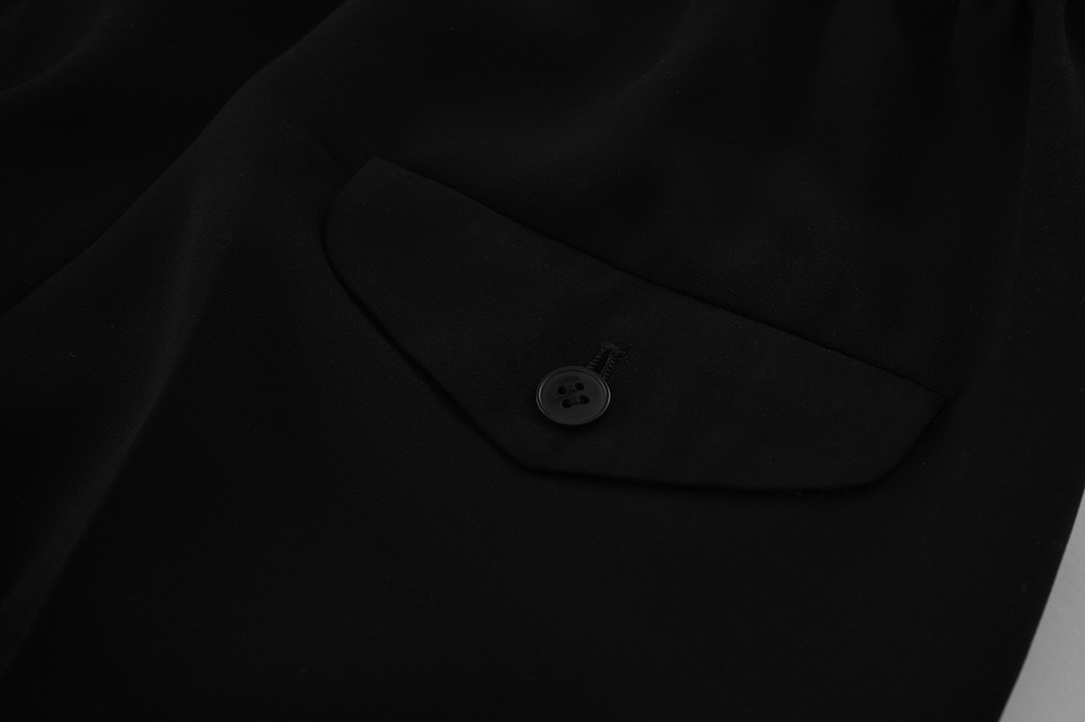 フォーマルでも使用できるストレッチの効いたアセテート&ポリエステル素材を使用。光沢感ととろみのある上品な素材で、シワになりづらいのもポイントです。パンツのシルエットは細身でスッキリとしたテーパード。センタープレスが施されているので、縦のラインが美しく際立ちます。着丈は少し短めの9分丈です。フォーマルシーンだけではなくお仕事やお食事などのちょっとした場面でも着ていただきやすく、また細身ながら少しストレッチ性のある素材なので着心地も窮屈感がありません。同素材のジャケットと合わせてセットアップがお勧めです。