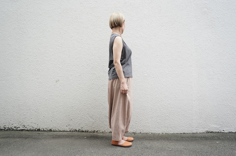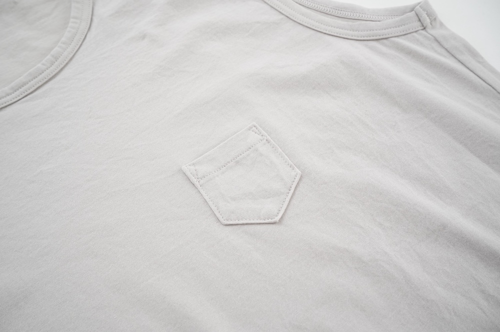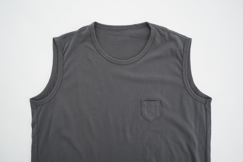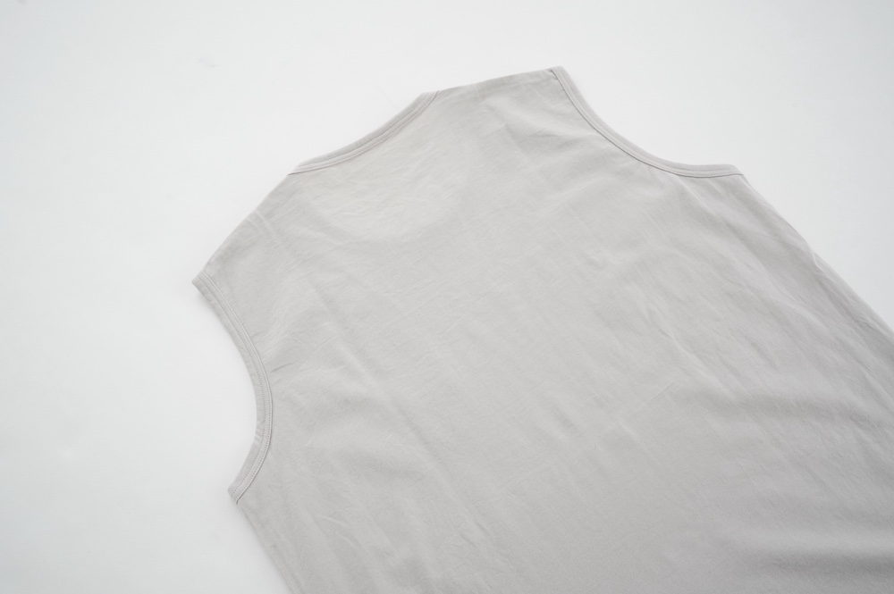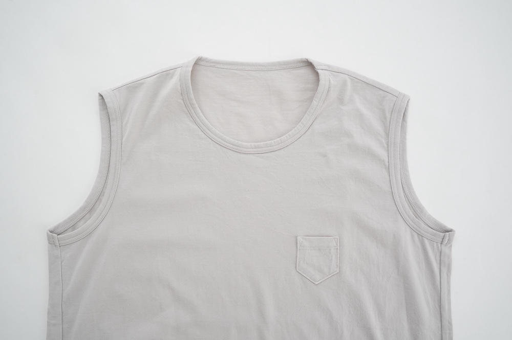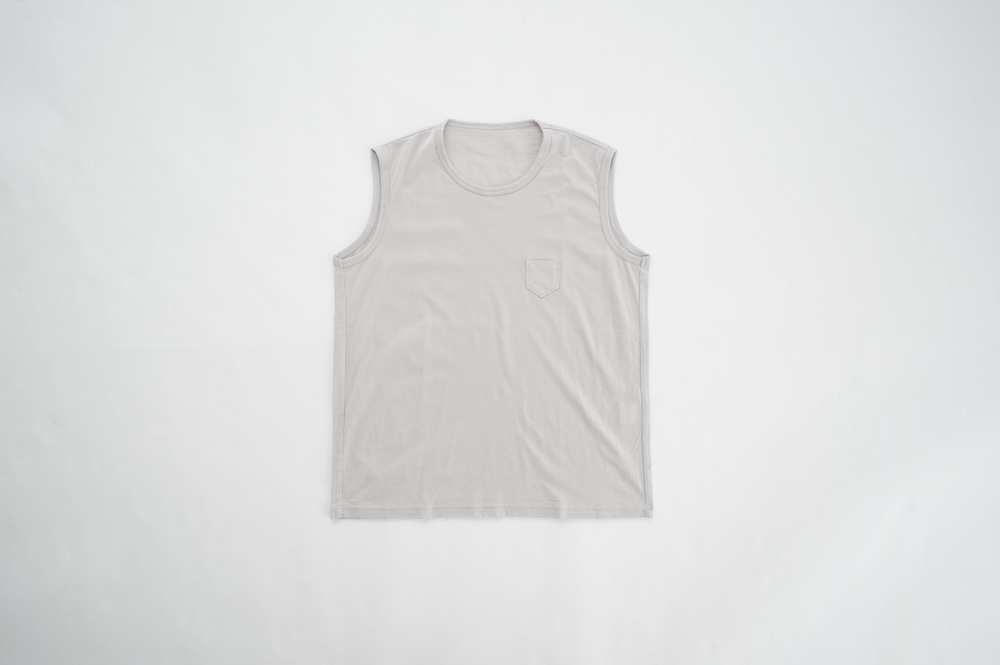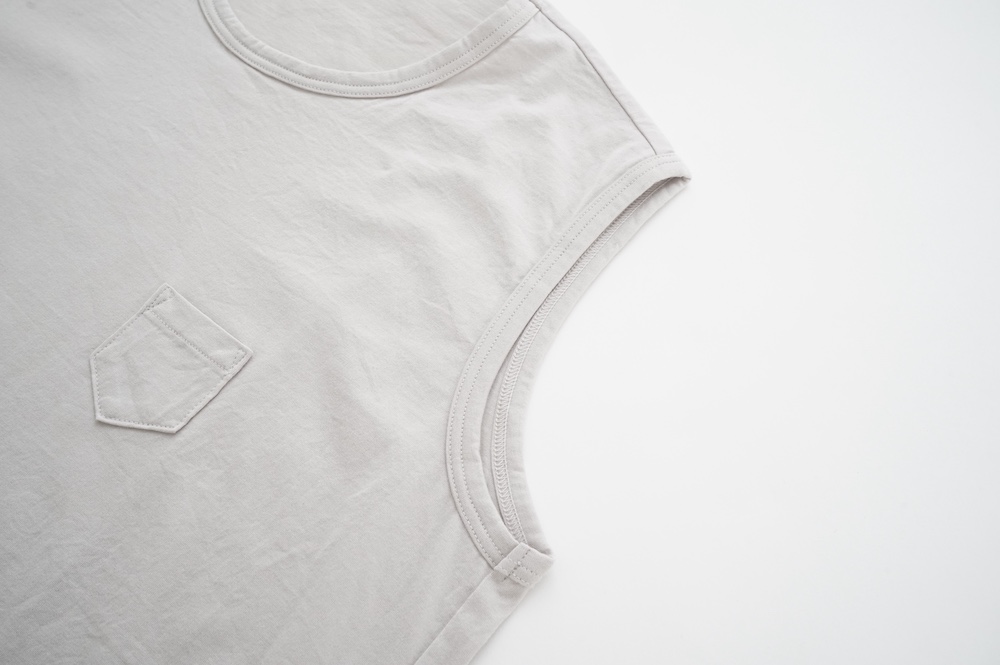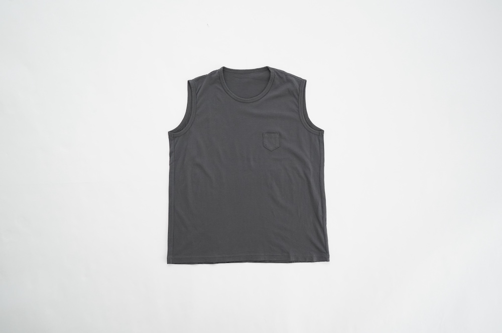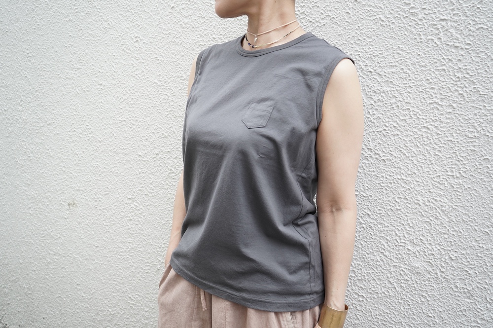 デザインは小さなポケットが胸元に光るシンプルなタンクトップ。肩幅がしっかりあるのと、アームホールが小さくなっているので一枚でも安心して着用できます。カットソーも自ら型紙を作り上げるゴーシュのTシャツは、驚くほど立体的で心地のいい仕上がりです。また、オリジナリティーあるカラーを表現するため、製品染しています。昨年のタンクトップに比べて身幅にゆとりを持たせているので、身体のラインが出にくいのがポイント。シンプルに一枚でも、カーディガンや羽織の下に合わせるトップスとしてもお使いいただきやすいタンクトップです。