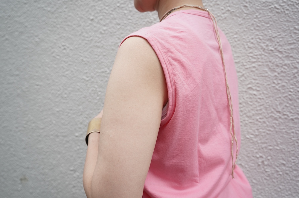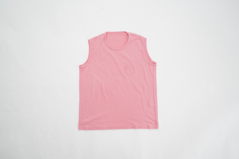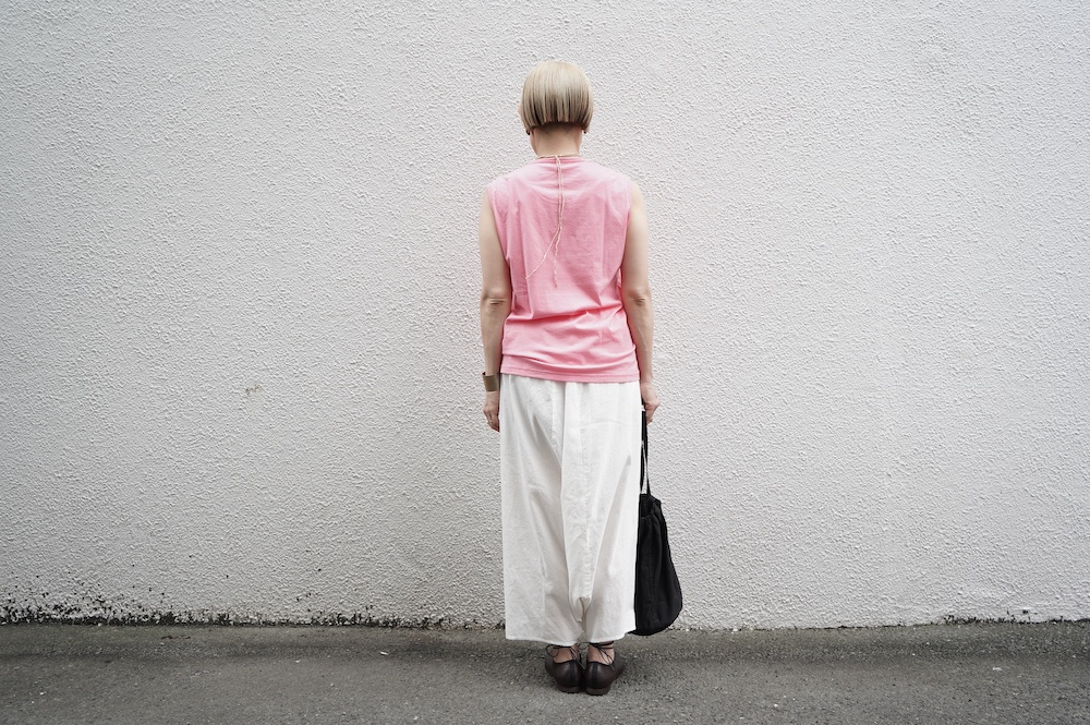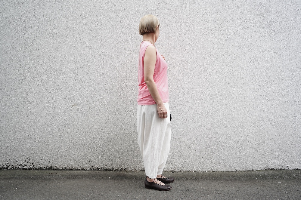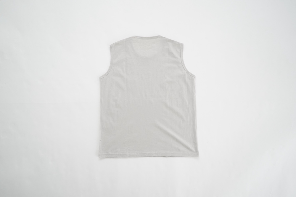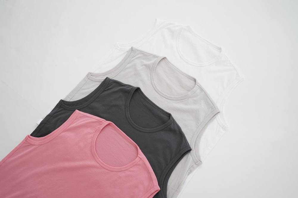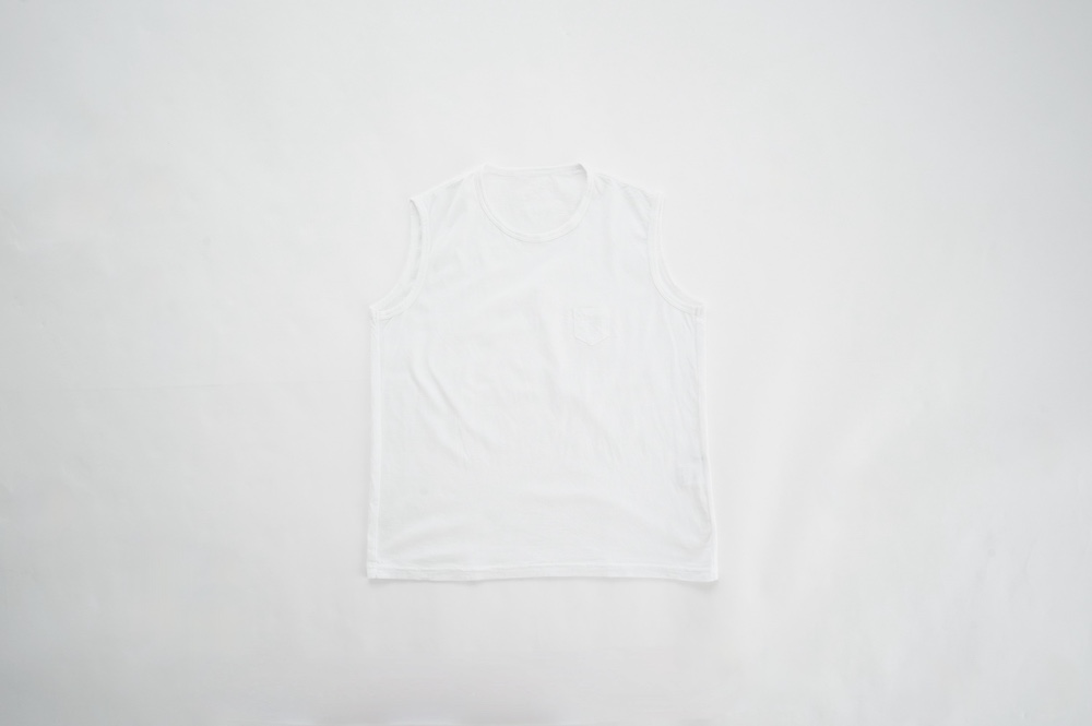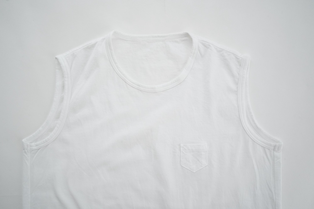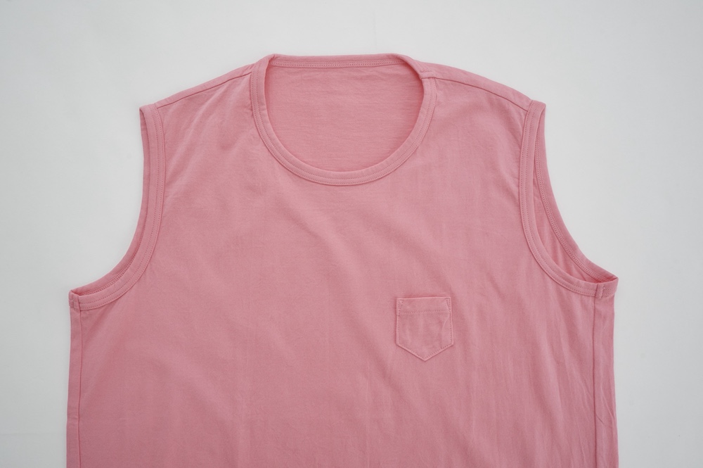 デザインは小さなポケットが胸元に光るシンプルなタンクトップ。肩幅がしっかりあるのと、アームホールが小さくなっているので一枚でも安心して着用できます。カットソーも自ら型紙を作り上げるゴーシュのTシャツは、驚くほど立体的で心地のいい仕上がりです。また、オリジナリティーあるカラーを表現するため、製品染しています。昨年のタンクトップに比べて身幅にゆとりを持たせているので、身体のラインが出にくいのがポイント。シンプルに一枚でも、カーディガンや羽織の下に合わせるトップスとしてもお使いいただきやすいタンクトップです。