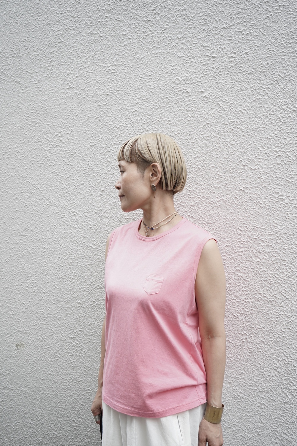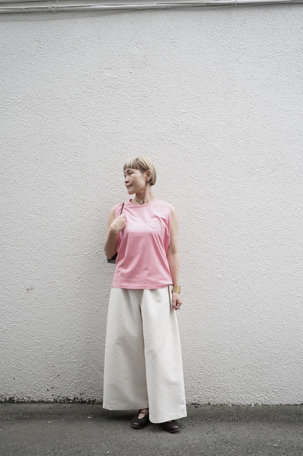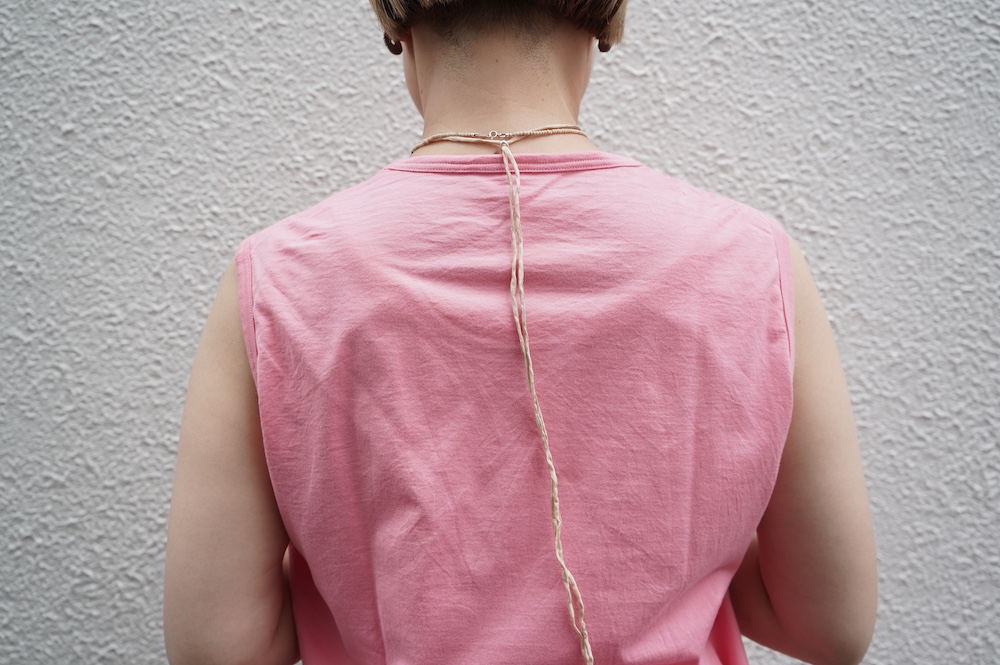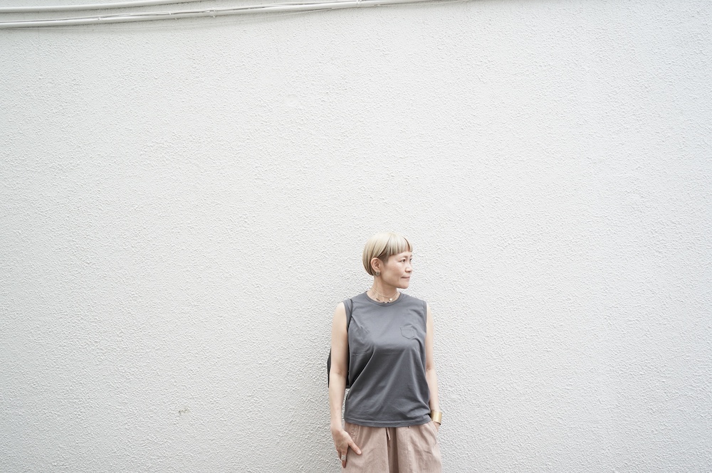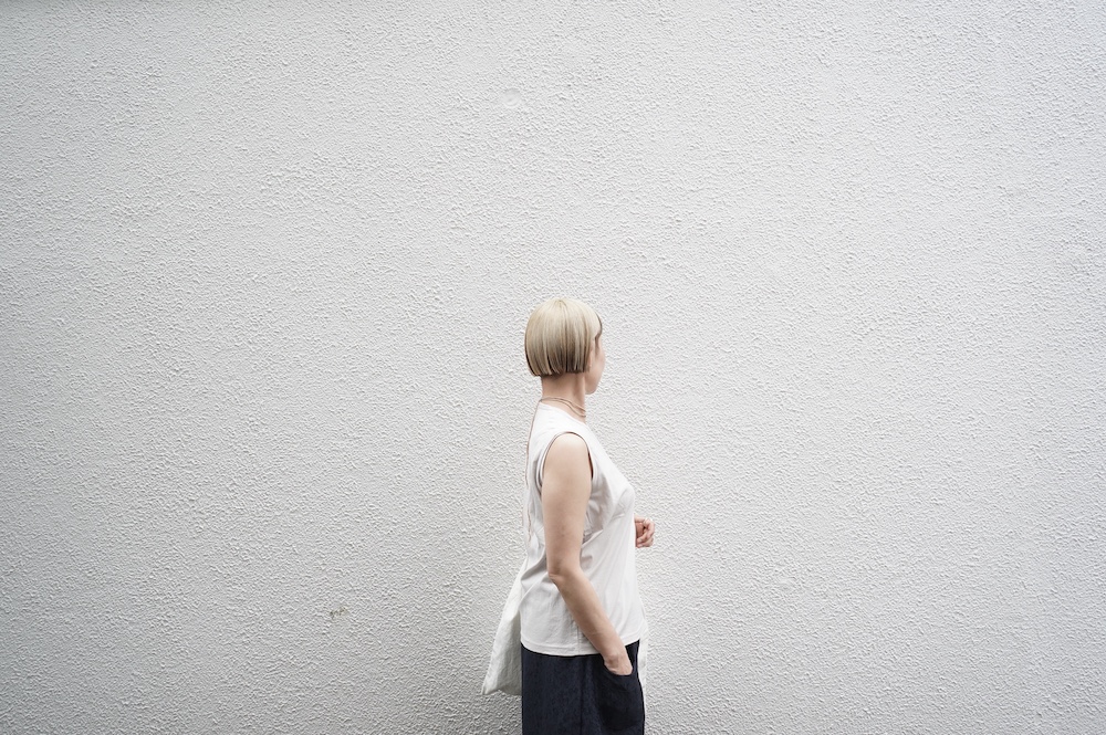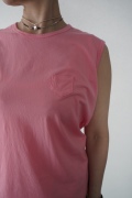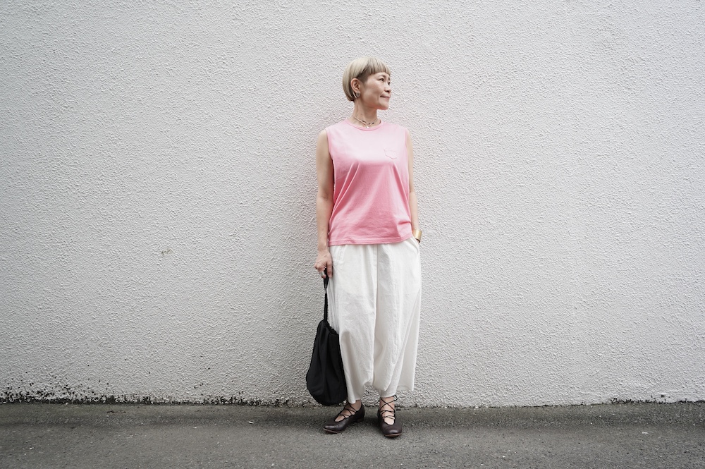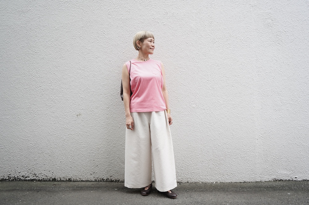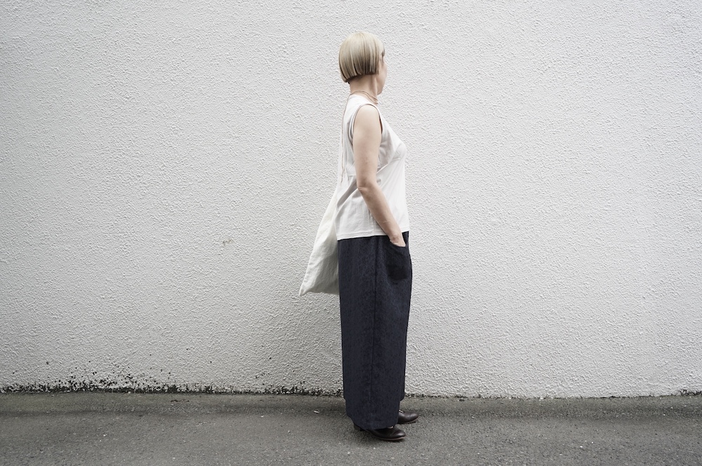 デザインは小さなポケットが胸元に光るシンプルなタンクトップ。肩幅がしっかりあるのと、アームホールが小さくなっているので一枚でも安心して着用できます。カットソーも自ら型紙を作り上げるゴーシュのTシャツは、驚くほど立体的で心地のいい仕上がりです。また、オリジナリティーあるカラーを表現するため、製品染しています。昨年のタンクトップに比べて身幅にゆとりを持たせているので、身体のラインが出にくいのがポイント。シンプルに一枚でも、カーディガンや羽織の下に合わせるトップスとしてもお使いいただきやすいタンクトップです。