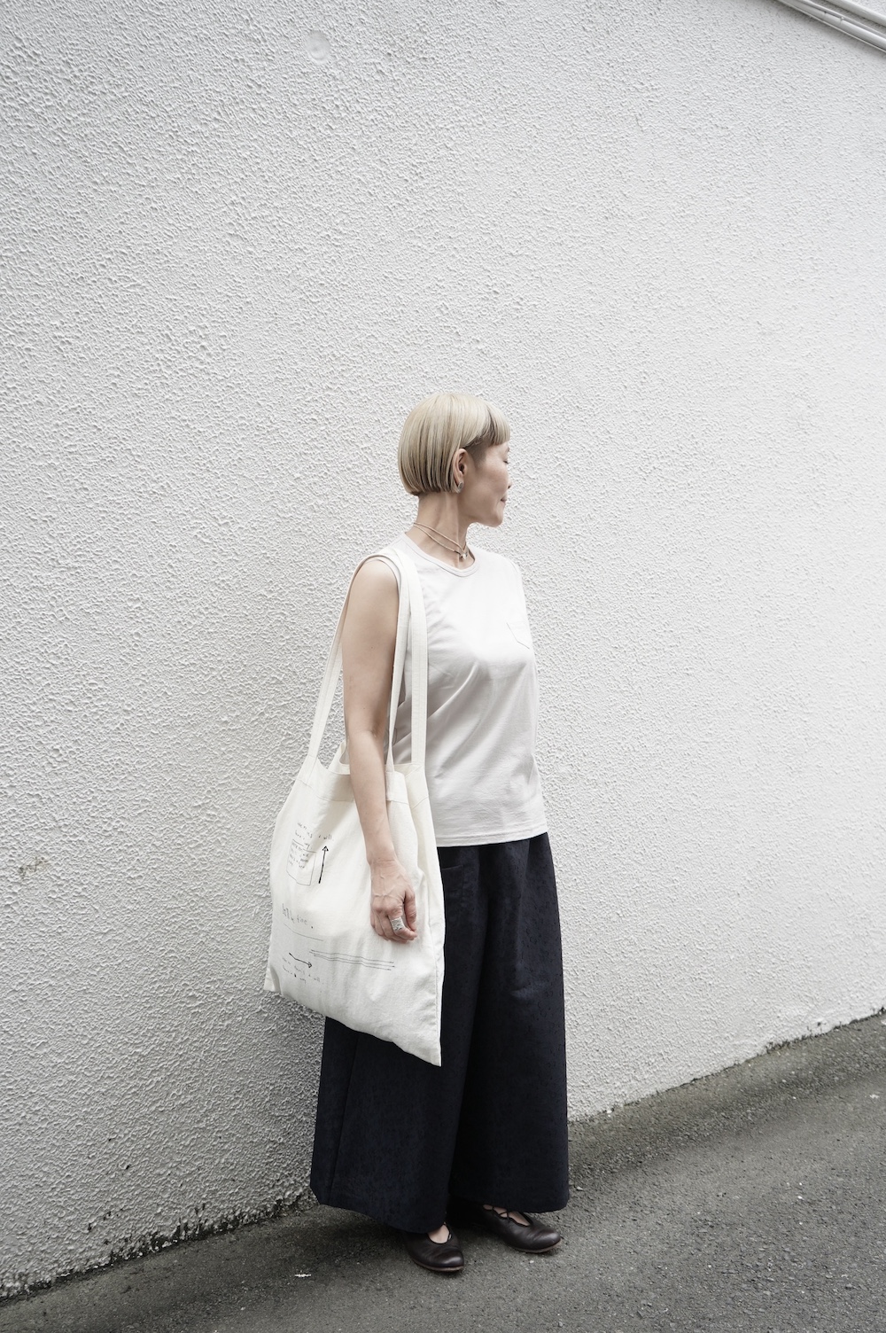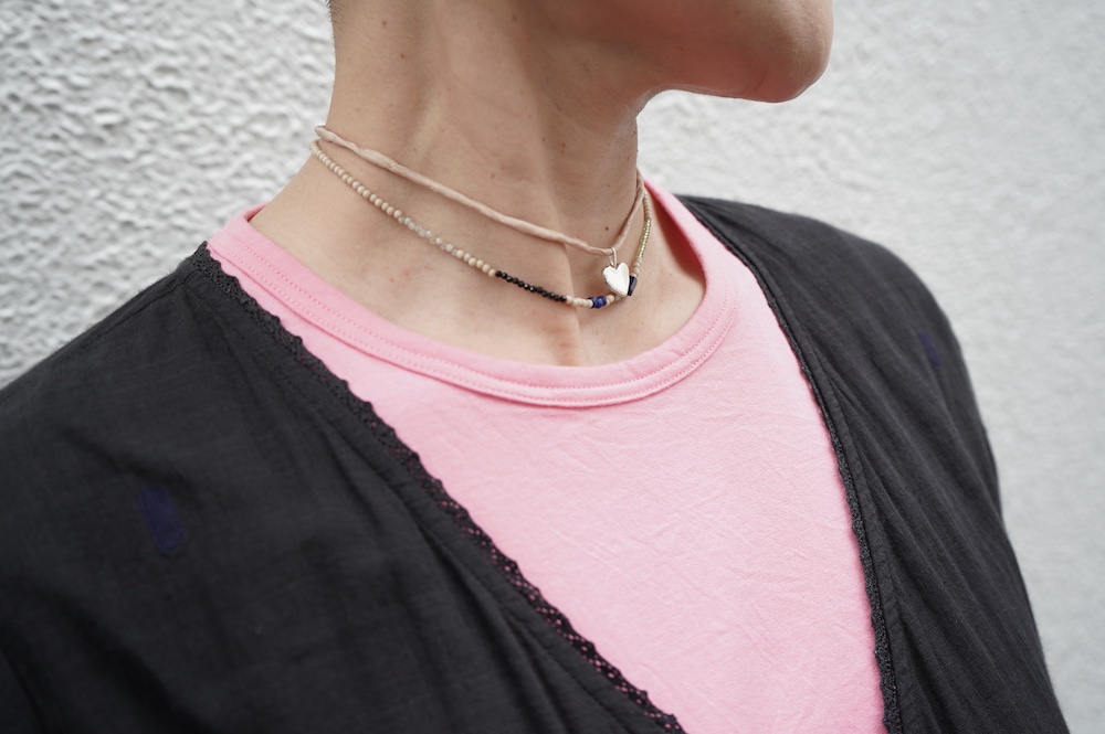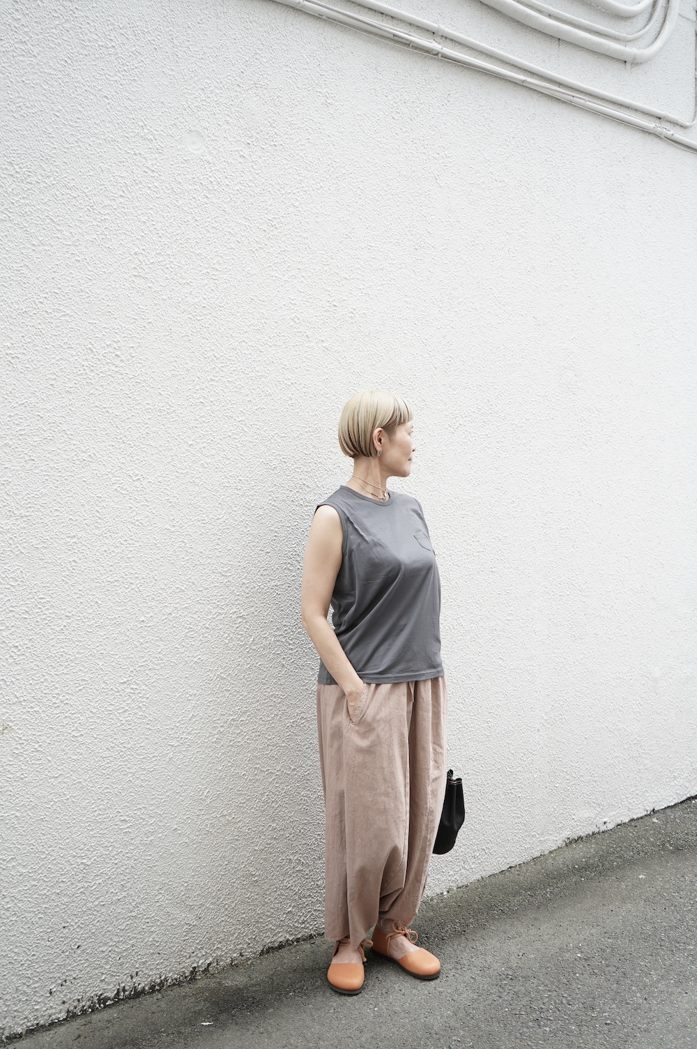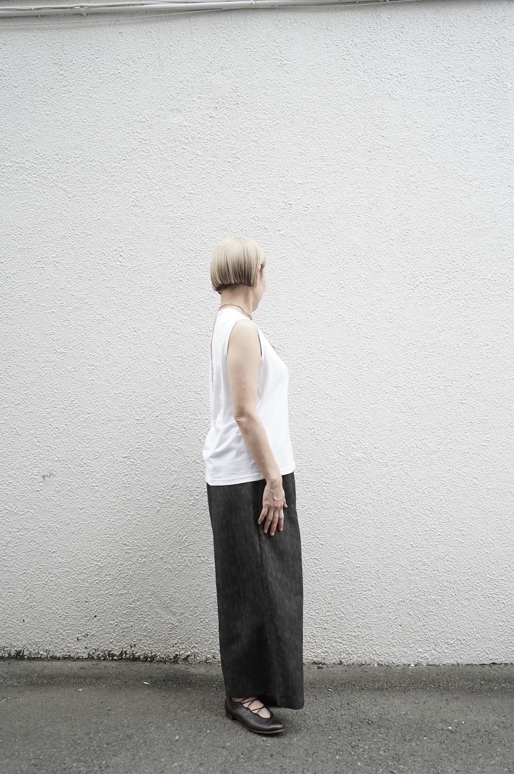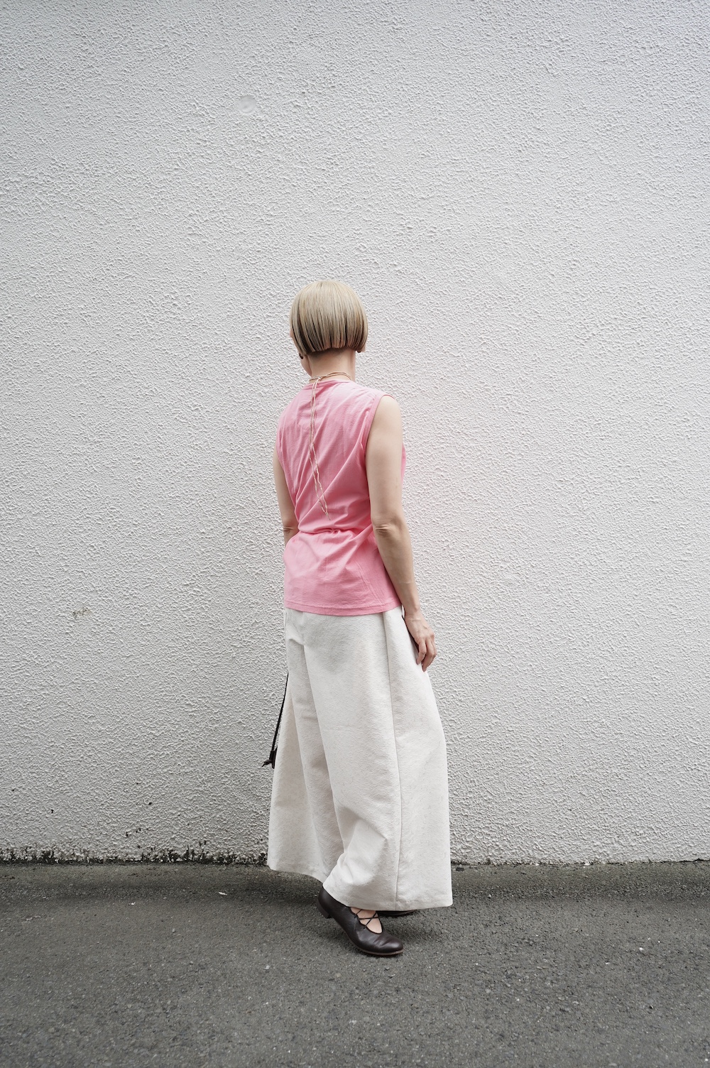 デザインは小さなポケットが胸元に光るシンプルなタンクトップ。肩幅がしっかりあるのと、アームホールが小さくなっているので一枚でも安心して着用できます。カットソーも自ら型紙を作り上げるゴーシュのTシャツは、驚くほど立体的で心地のいい仕上がりです。また、オリジナリティーあるカラーを表現するため、製品染しています。昨年のタンクトップに比べて身幅にゆとりを持たせているので、身体のラインが出にくいのがポイント。シンプルに一枚でも、カーディガンや羽織の下に合わせるトップスとしてもお使いいただきやすいタンクトップです。