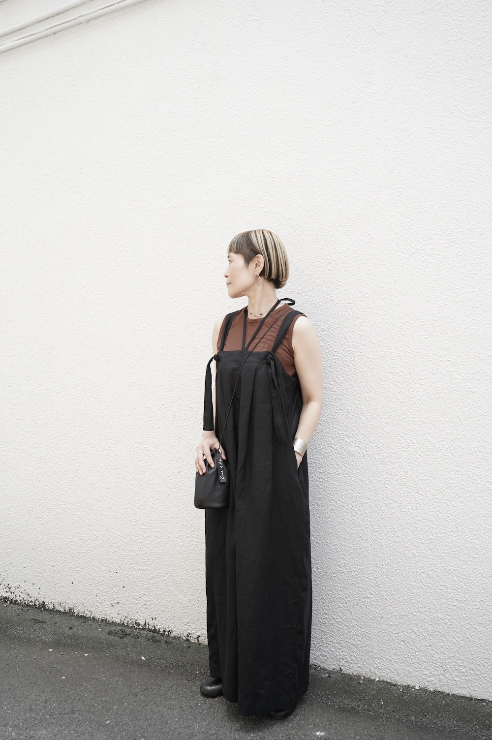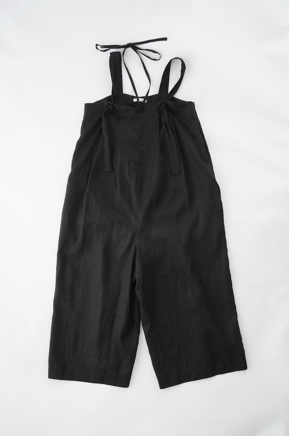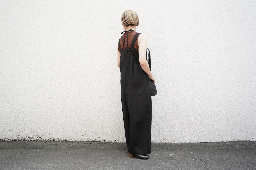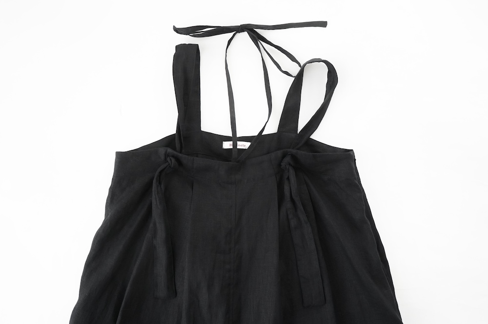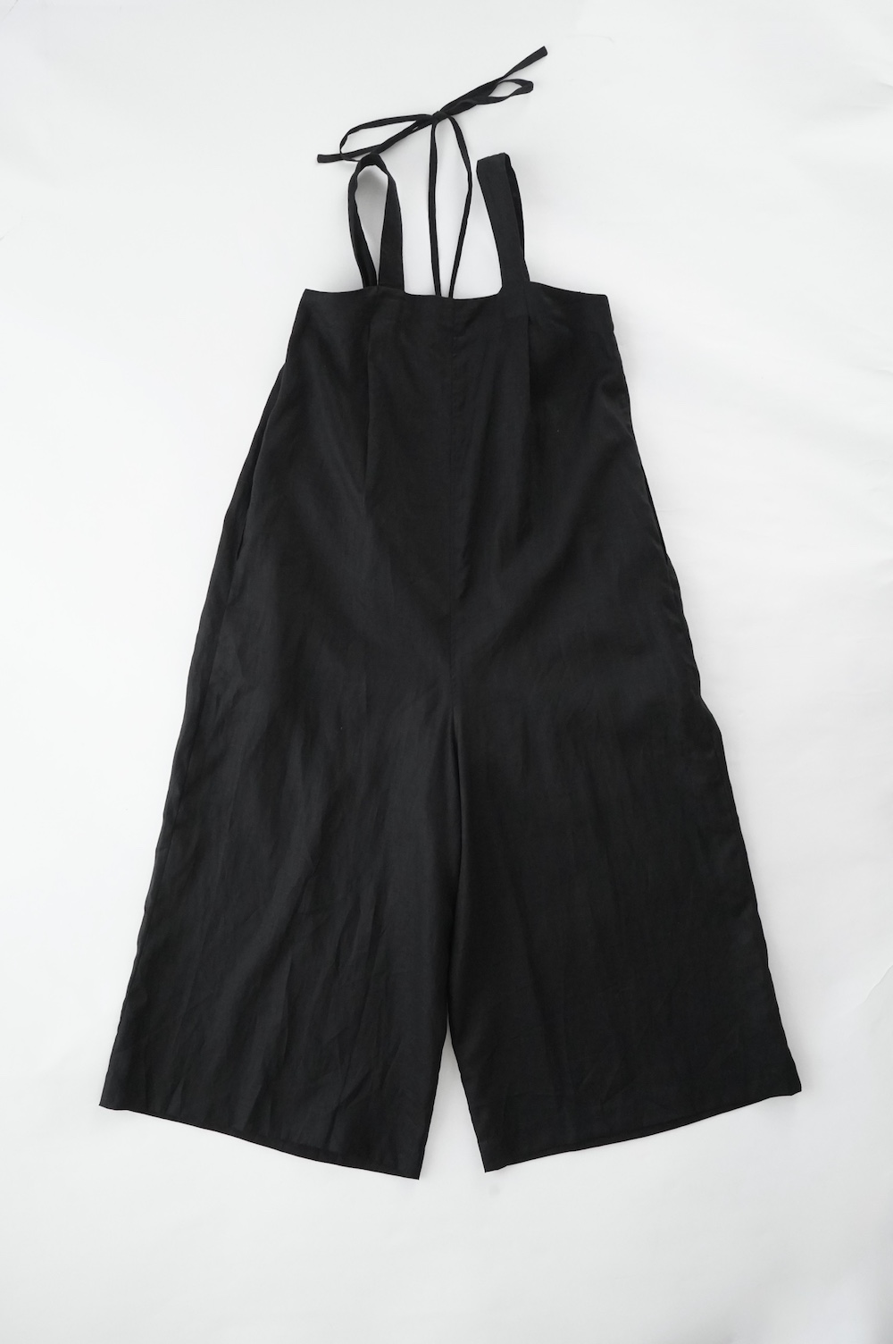 オネットのオーバーオール。ホルターネックのリネン素材のオーバーオールです。リネン素材は独特なしなやかさと光沢感があり、春夏はサラリと涼しく、インナー次第では秋口まで着ていただけます。胸元をスッキリ見せるホルターネックデザインに太めの肩紐で安定感があります。裾はワイド、フルレングスで歩く度に揺れる生地感が素敵です。両サイドには実用的なポケット付きです。シンプルだからこそTシャツやシャツ、ニットなど様々なトップスを合わせやすいアイテムです。肩紐を結んで長さを調節するタイプですのでかなり幅広い身長の方に着用していただけます。(ただし155cmのモデルは、紐を短くしてもギリギリ擦ってしまいそうな丈で、着用画像ではヒールを履いています。)