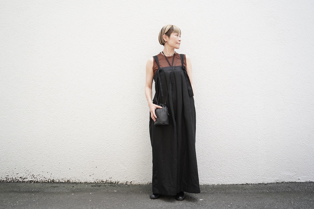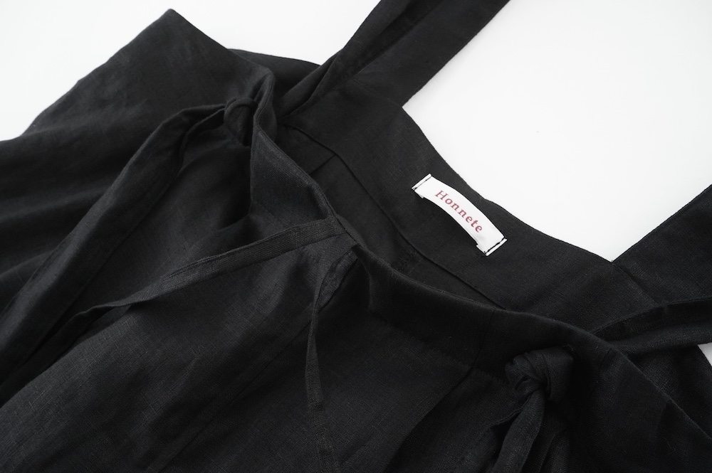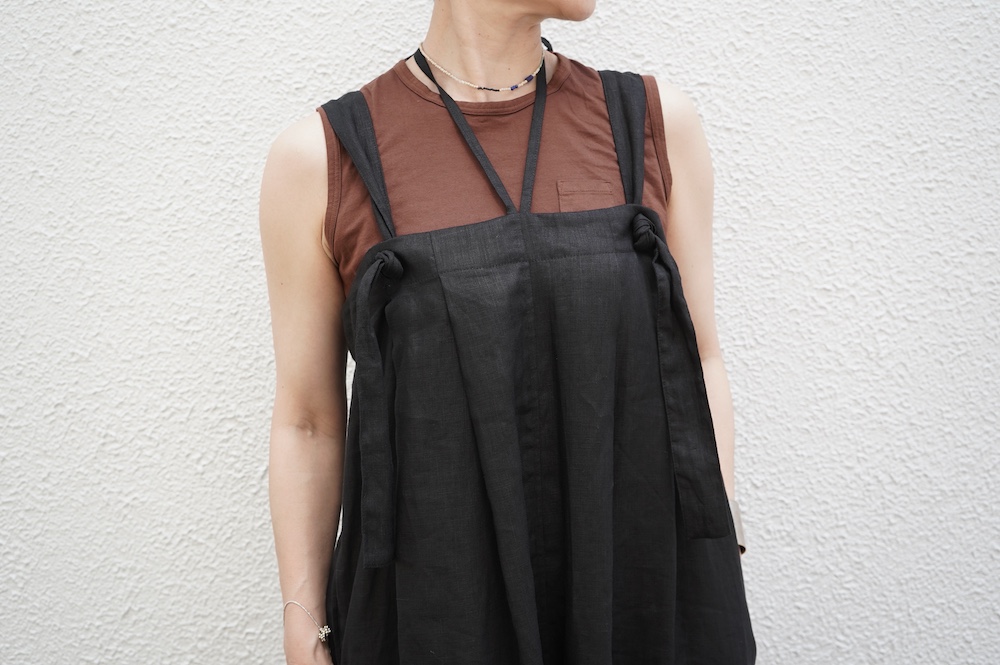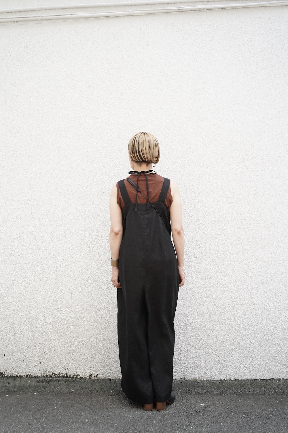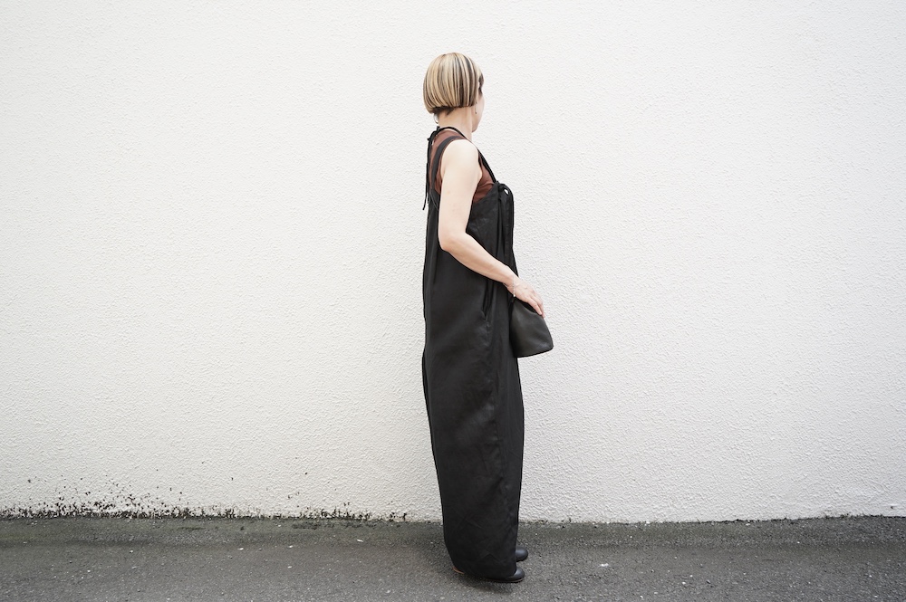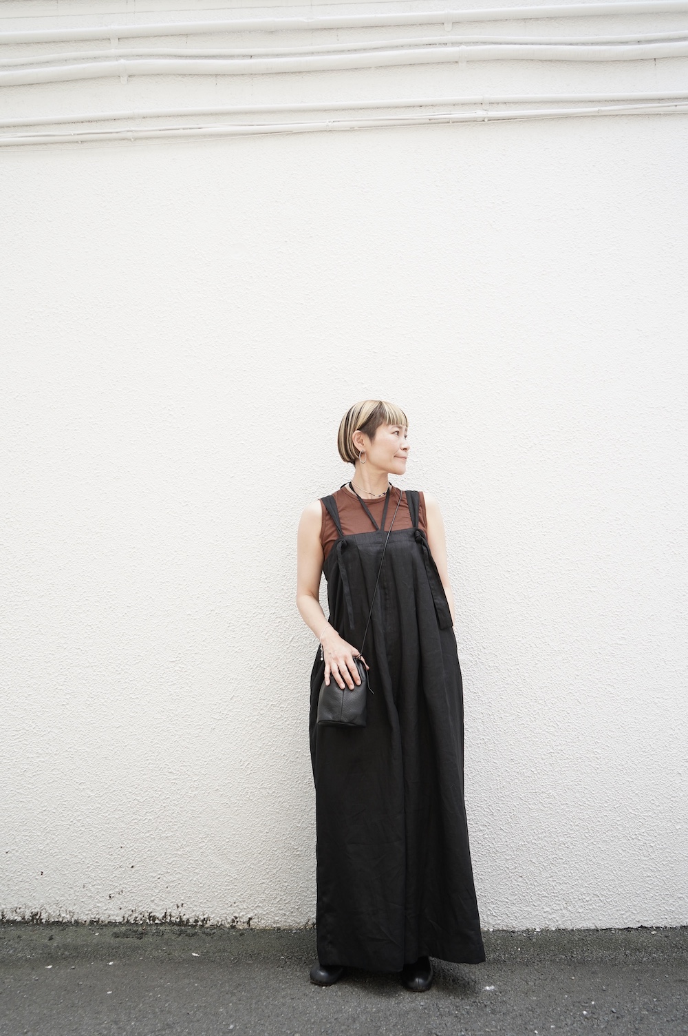 オネットのオーバーオール。ホルターネックのリネン素材のオーバーオールです。リネン素材は独特なしなやかさと光沢感があり、春夏はサラリと涼しく、インナー次第では秋口まで着ていただけます。胸元をスッキリ見せるホルターネックデザインに太めの肩紐で安定感があります。裾はワイド、フルレングスで歩く度に揺れる生地感が素敵です。両サイドには実用的なポケット付きです。シンプルだからこそTシャツやシャツ、ニットなど様々なトップスを合わせやすいアイテムです。肩紐を結んで長さを調節するタイプですのでかなり幅広い身長の方に着用していただけます。(ただし155cmのモデルは、紐を短くしてもギリギリ擦ってしまいそうな丈で、着用画像ではヒールを履いています。)
