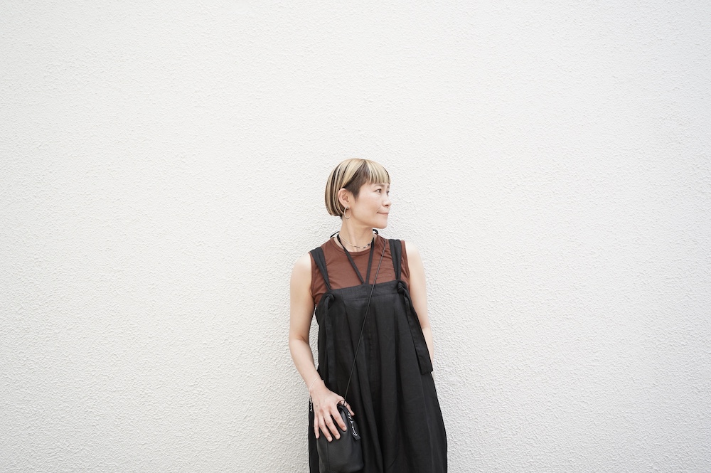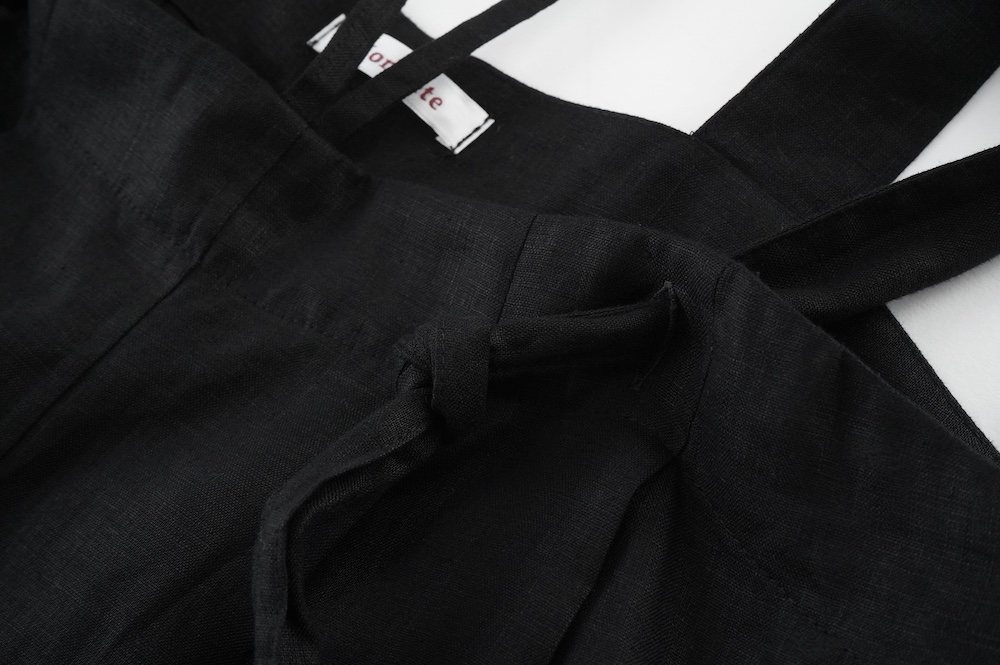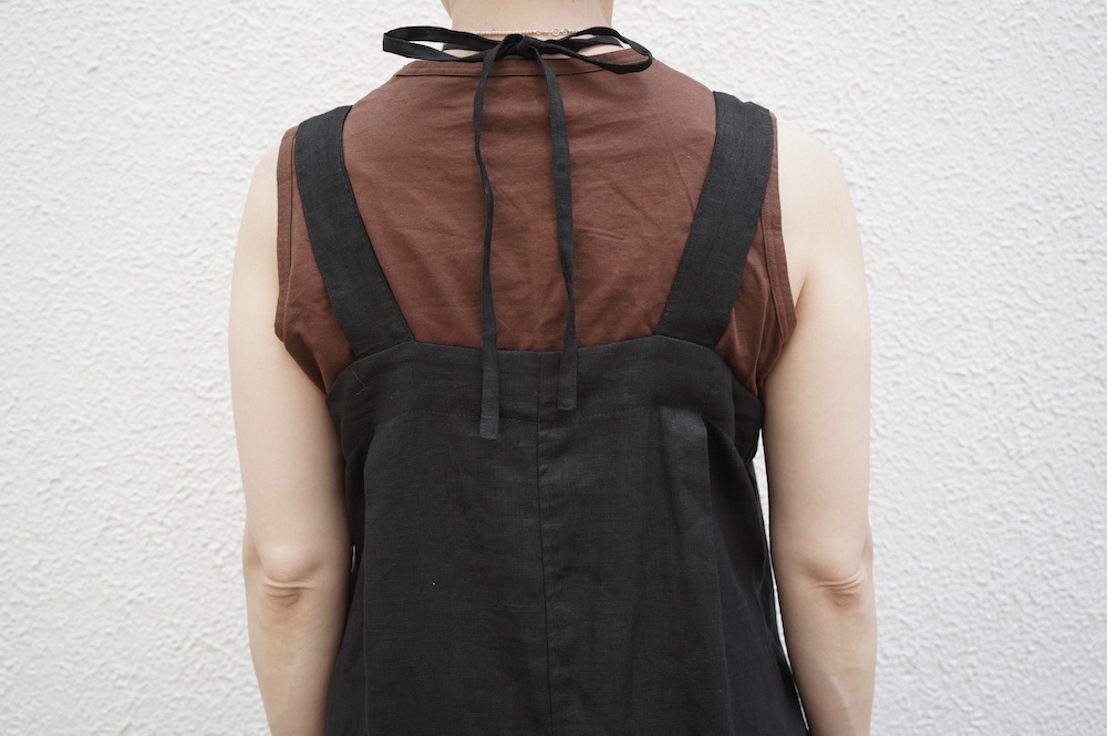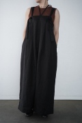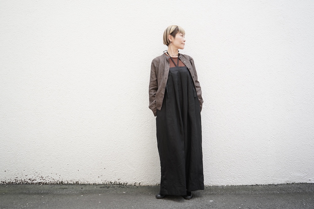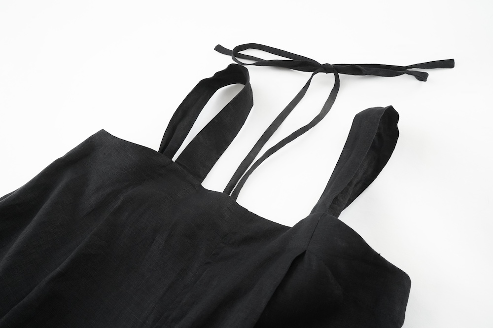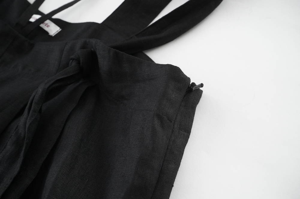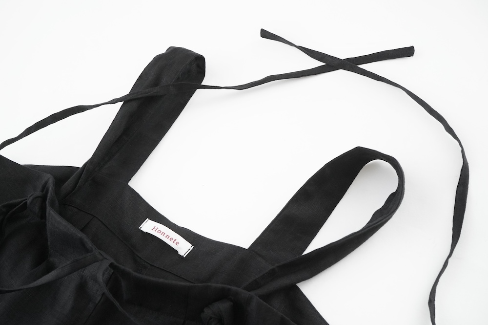 オネットのオーバーオール。ホルターネックのリネン素材のオーバーオールです。リネン素材は独特なしなやかさと光沢感があり、春夏はサラリと涼しく、インナー次第では秋口まで着ていただけます。胸元をスッキリ見せるホルターネックデザインに太めの肩紐で安定感があります。裾はワイド、フルレングスで歩く度に揺れる生地感が素敵です。両サイドには実用的なポケット付きです。シンプルだからこそTシャツやシャツ、ニットなど様々なトップスを合わせやすいアイテムです。肩紐を結んで長さを調節するタイプですのでかなり幅広い身長の方に着用していただけます。(ただし155cmのモデルは、紐を短くしてもギリギリ擦ってしまいそうな丈で、着用画像ではヒールを履いています。)