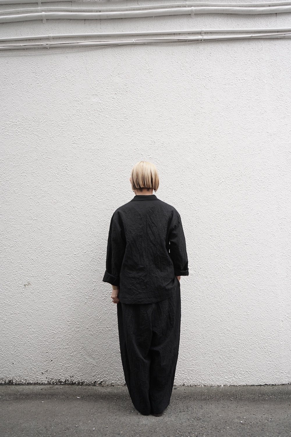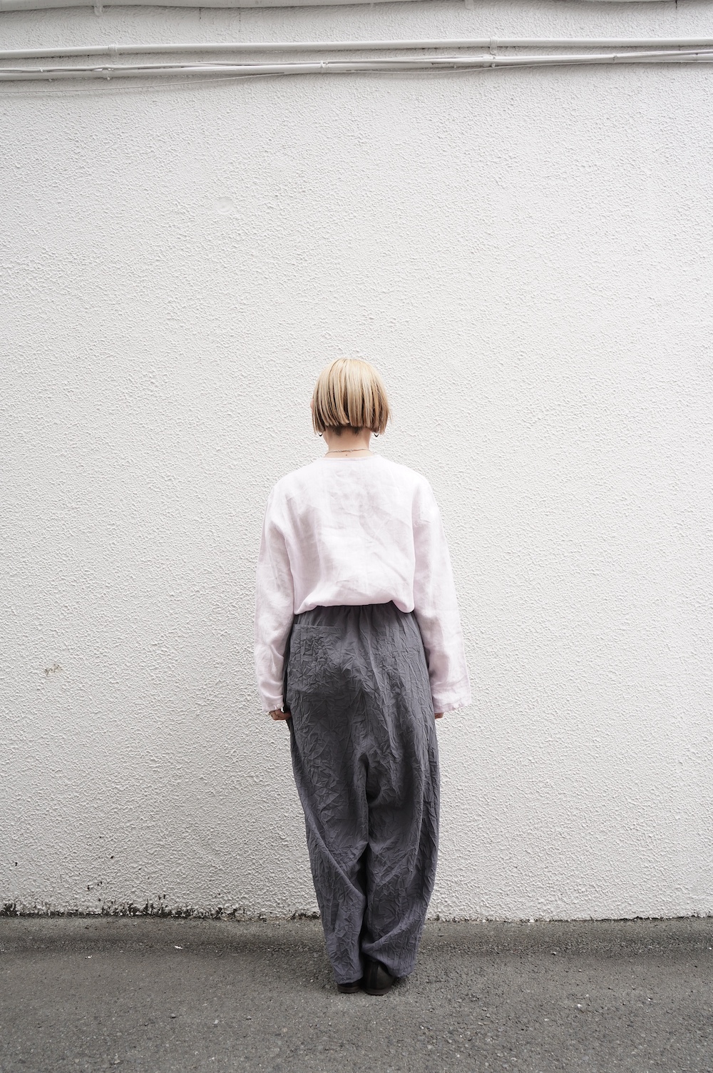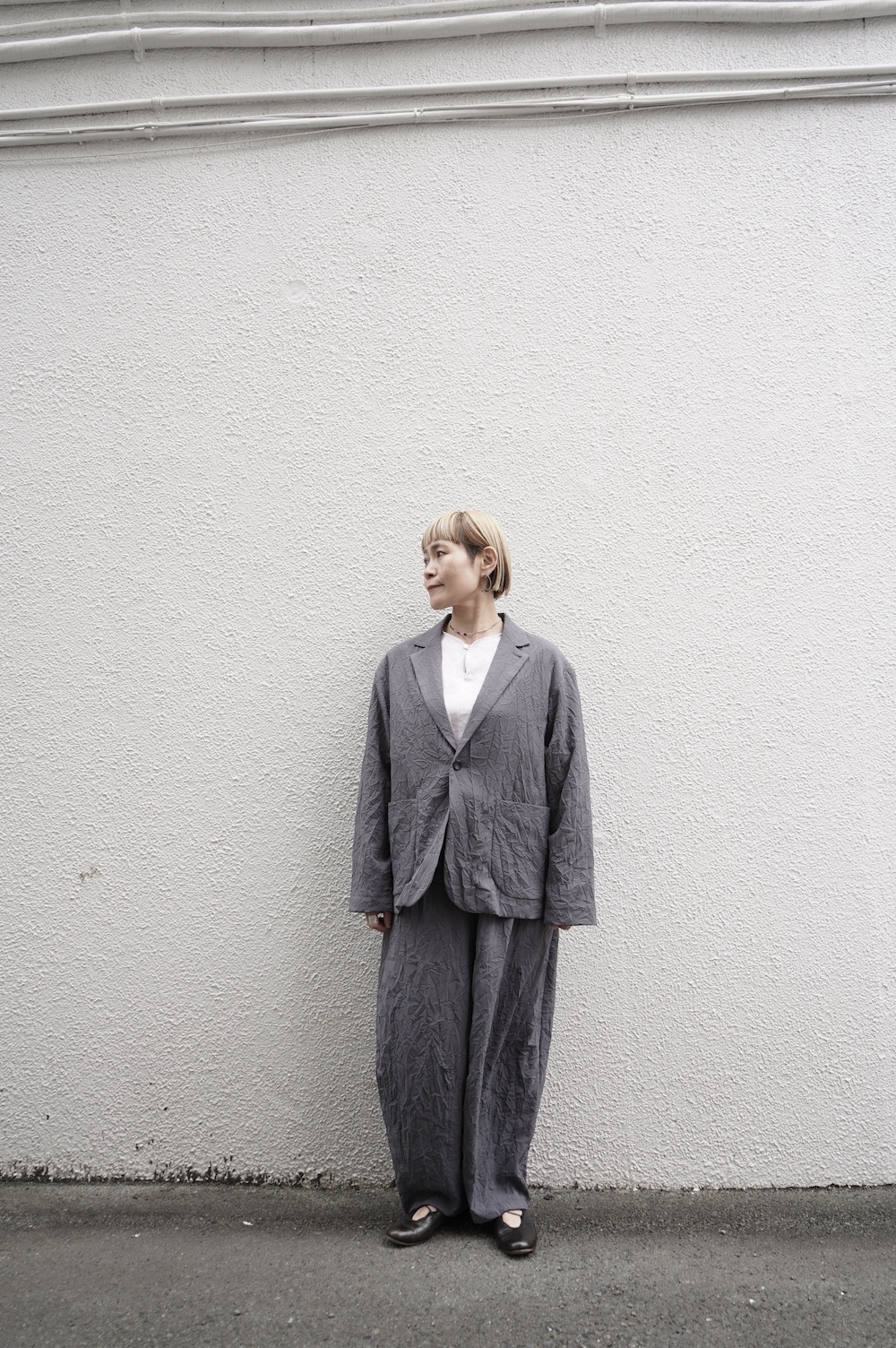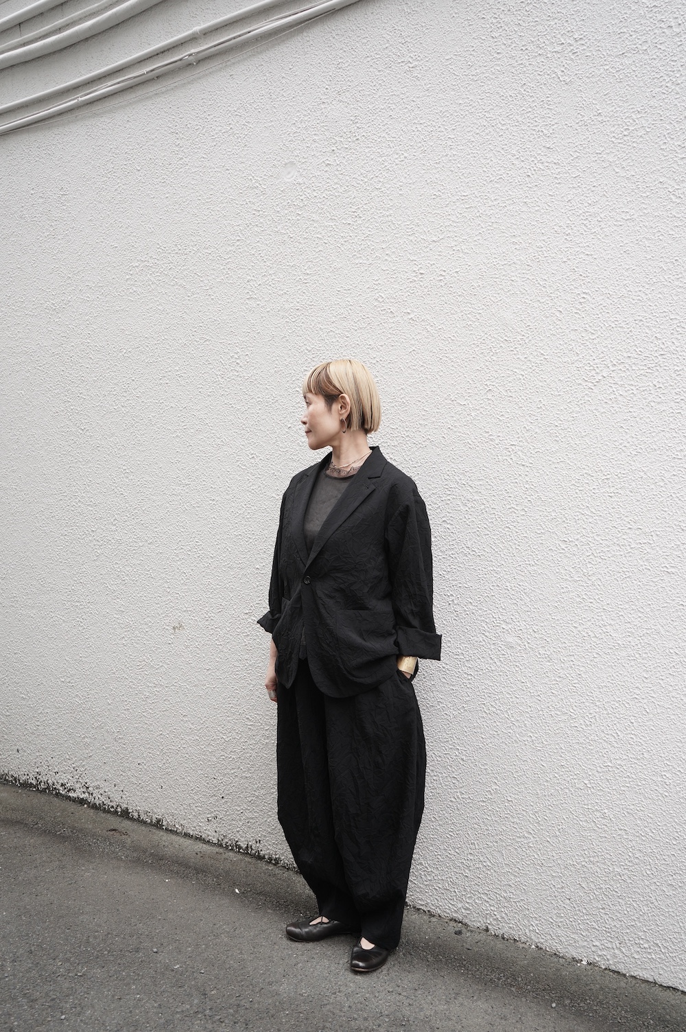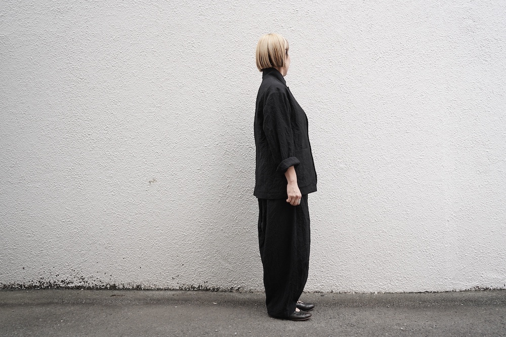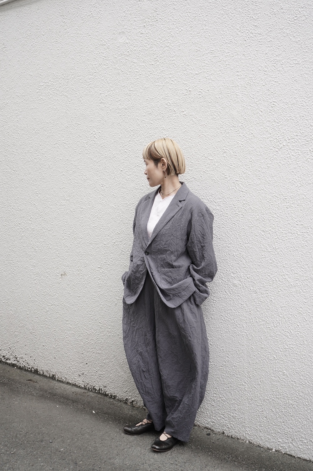 デザインはテーパードシルエットのゆったりとしたワイドパンツ。股上は深めで、裾にダーツが施されているので膝下から細くテーパードがかかったシルエットです。ウエストはゴムと紐。ボリュームは出過ぎず、ワイドながら落ち感のある生地なのですっきりと穿いていただけます。同素材のジャケットと合わせてセットアップも素敵です。季節も長く楽しめるイージーパンツです。
