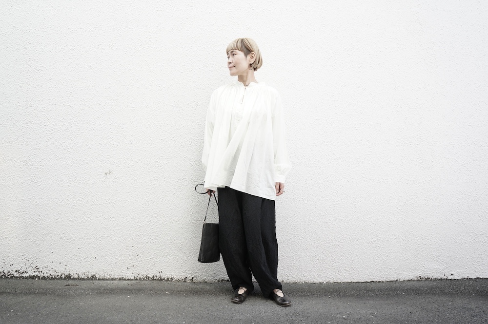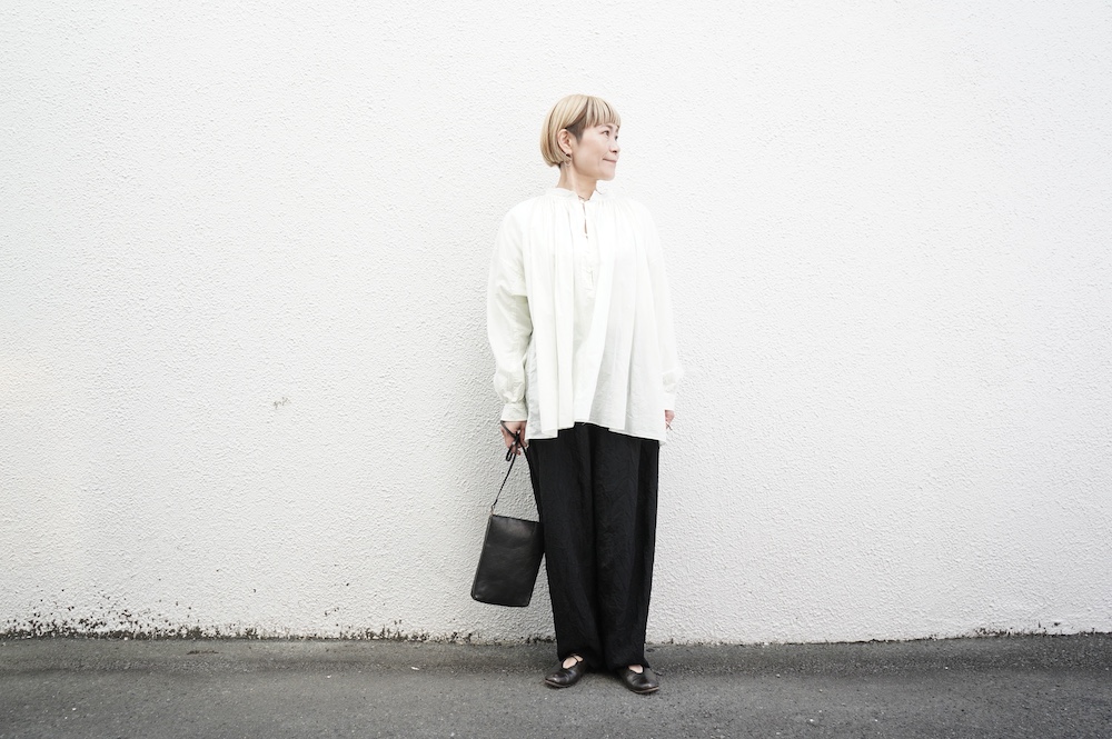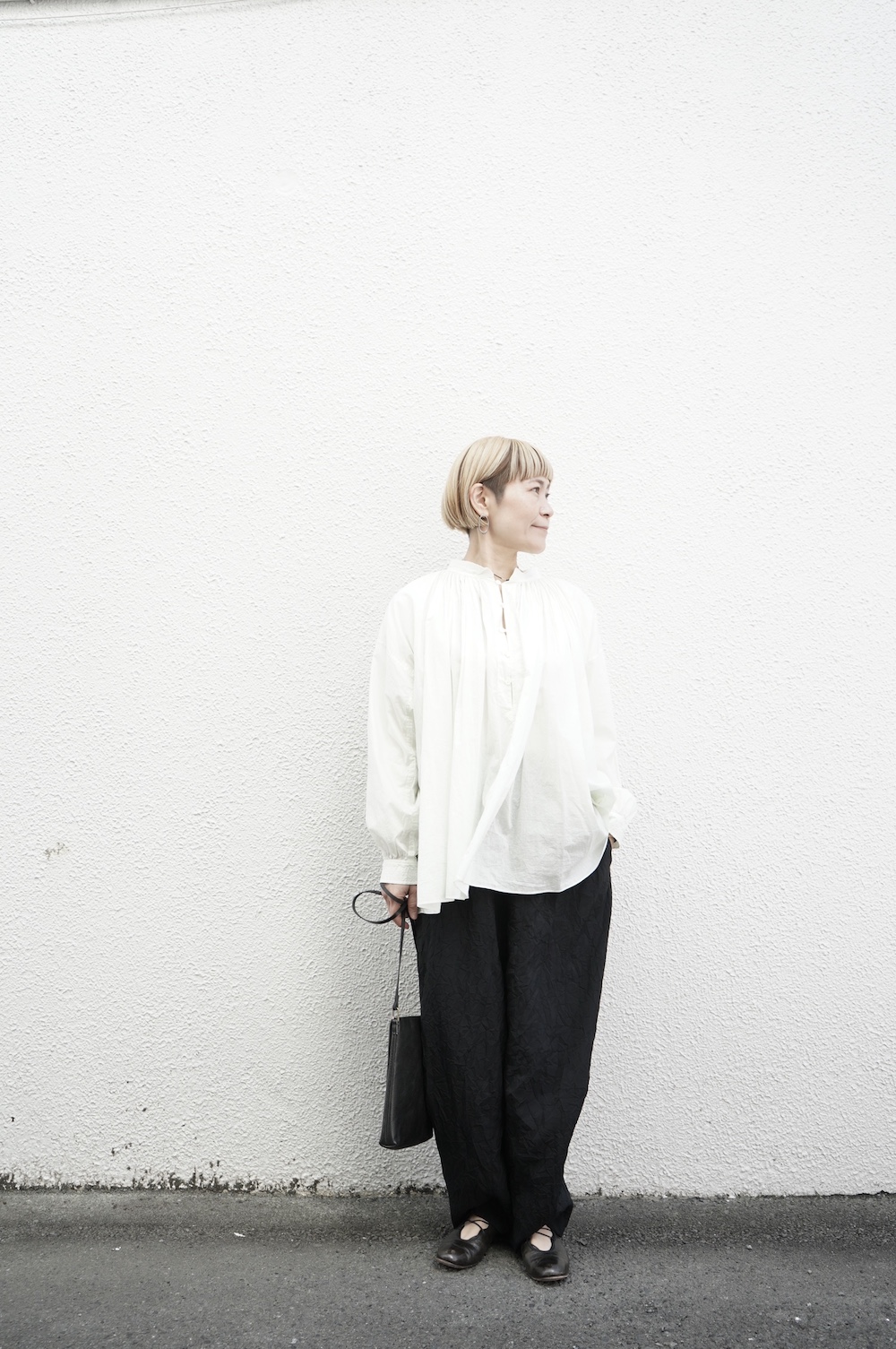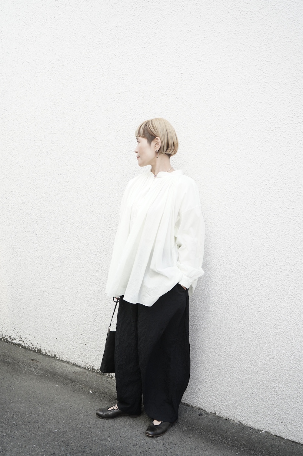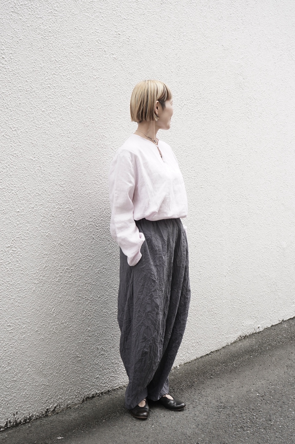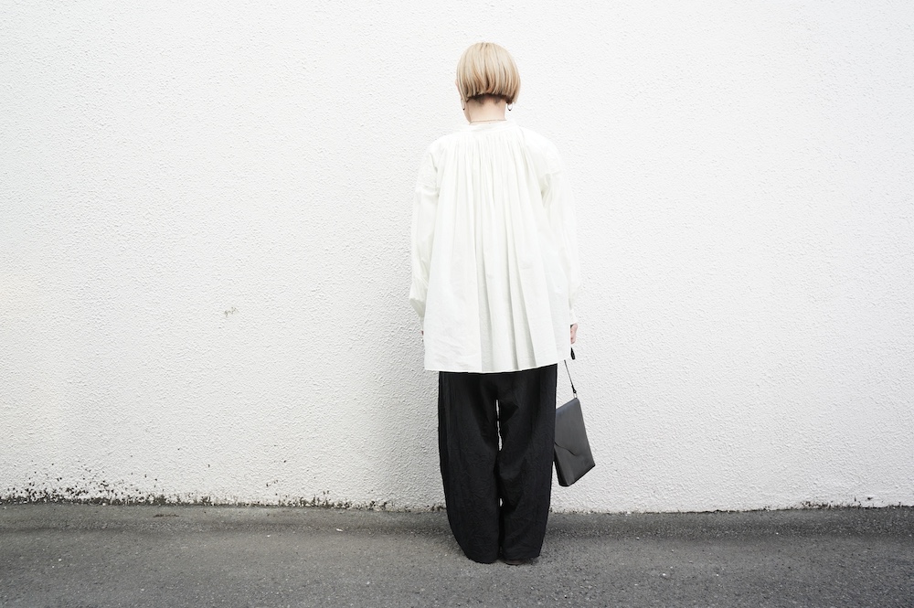 デザインはテーパードシルエットのゆったりとしたワイドパンツ。股上は深めで、裾にダーツが施されているので膝下から細くテーパードがかかったシルエットです。ウエストはゴムと紐。ボリュームは出過ぎず、ワイドながら落ち感のある生地なのですっきりと穿いていただけます。同素材のジャケットと合わせてセットアップも素敵です。季節も長く楽しめるイージーパンツです。