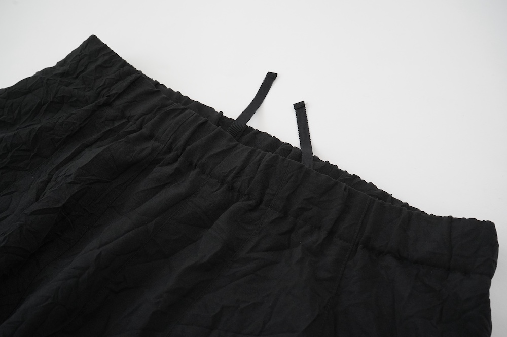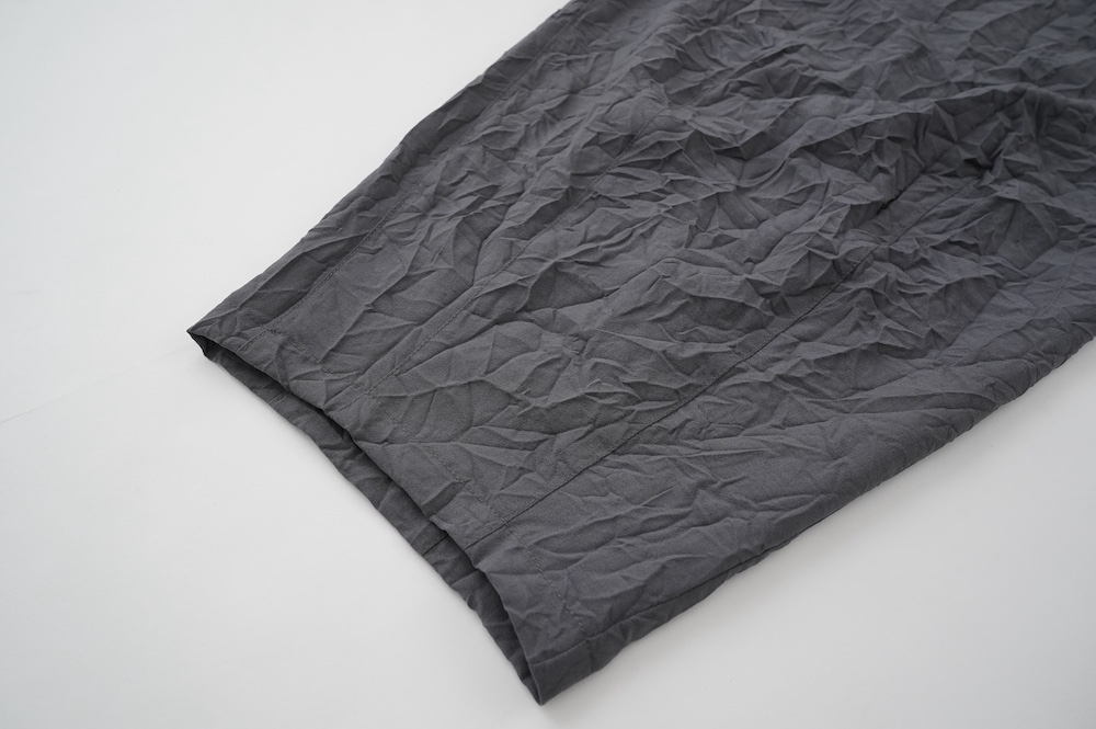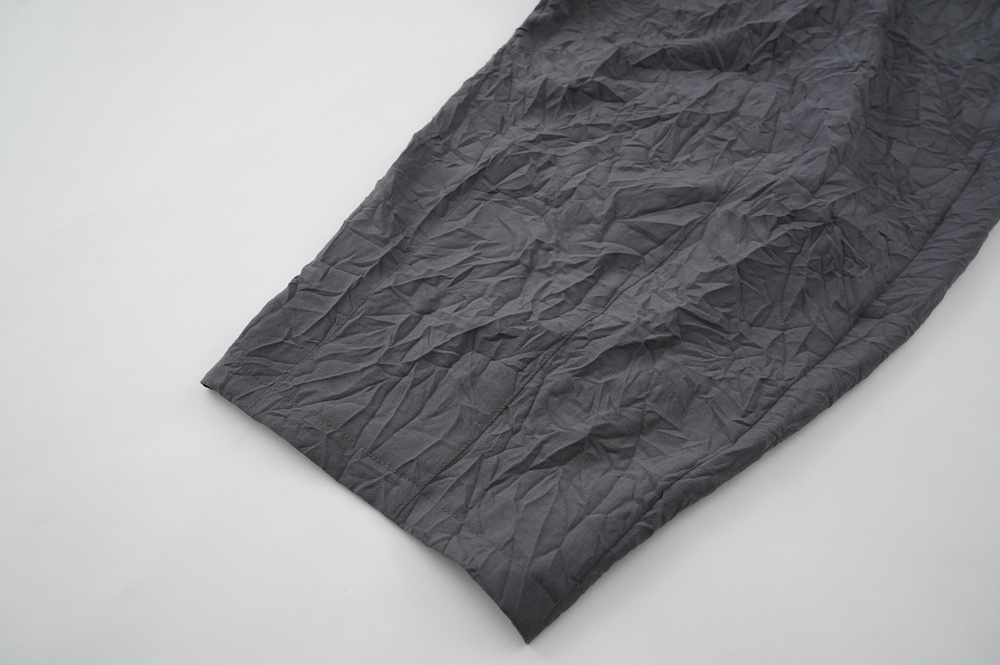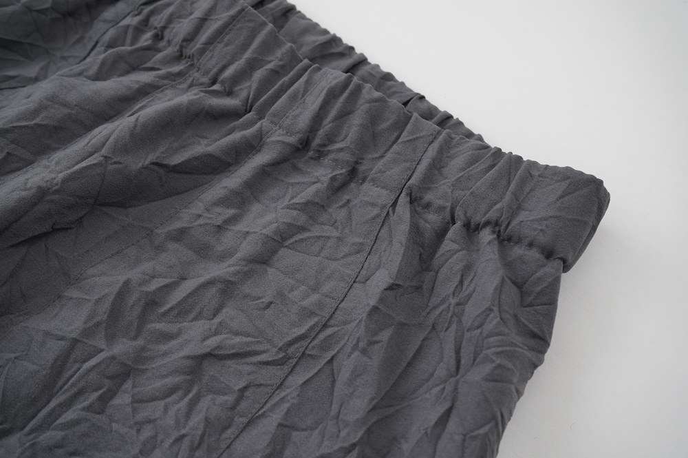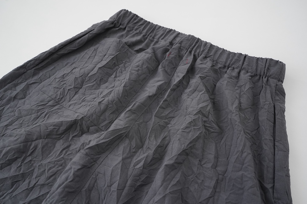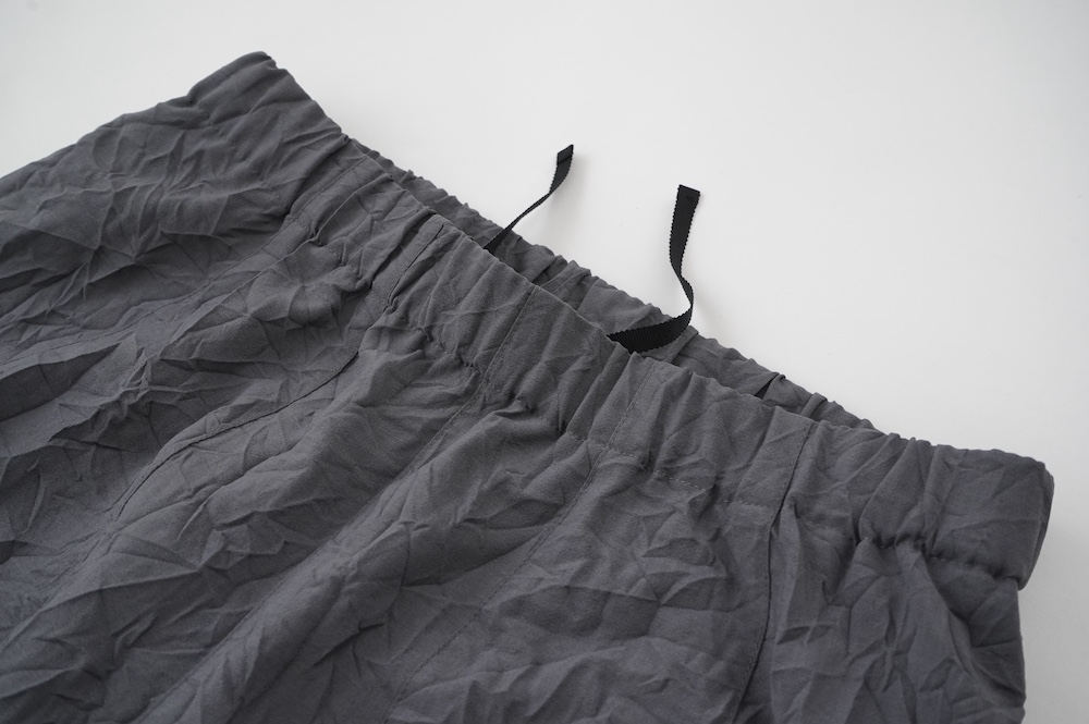 オネットのパンツ。シワ加工の入ったポリエステル生地を使用。とても軽く、サラサラとした肌触りで夏まで涼しく穿けそうな素材感です。お洗濯もご自宅で可能な扱いやすい素材です。