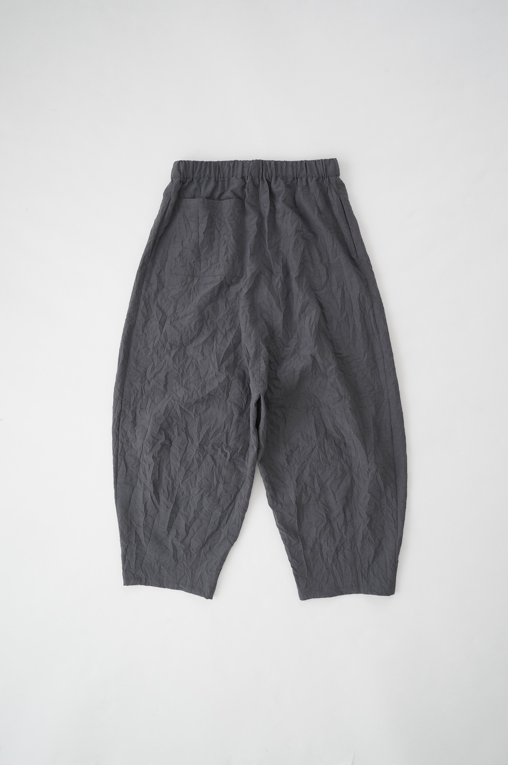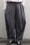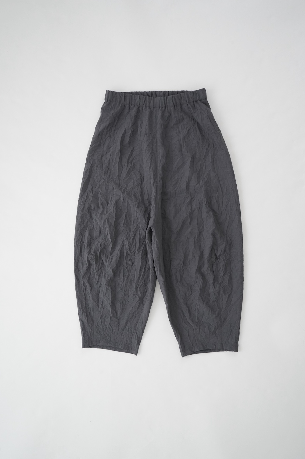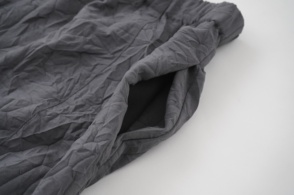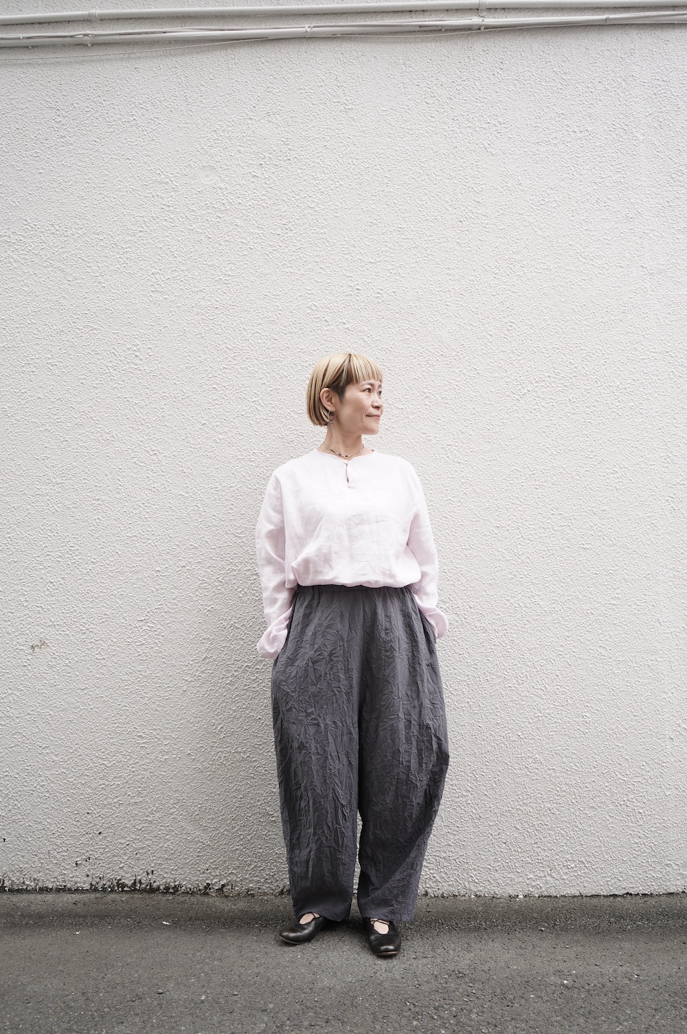 オネットのパンツ。シワ加工の入ったポリエステル生地を使用。とても軽く、サラサラとした肌触りで夏まで涼しく穿けそうな素材感です。お洗濯もご自宅で可能な扱いやすい素材です。