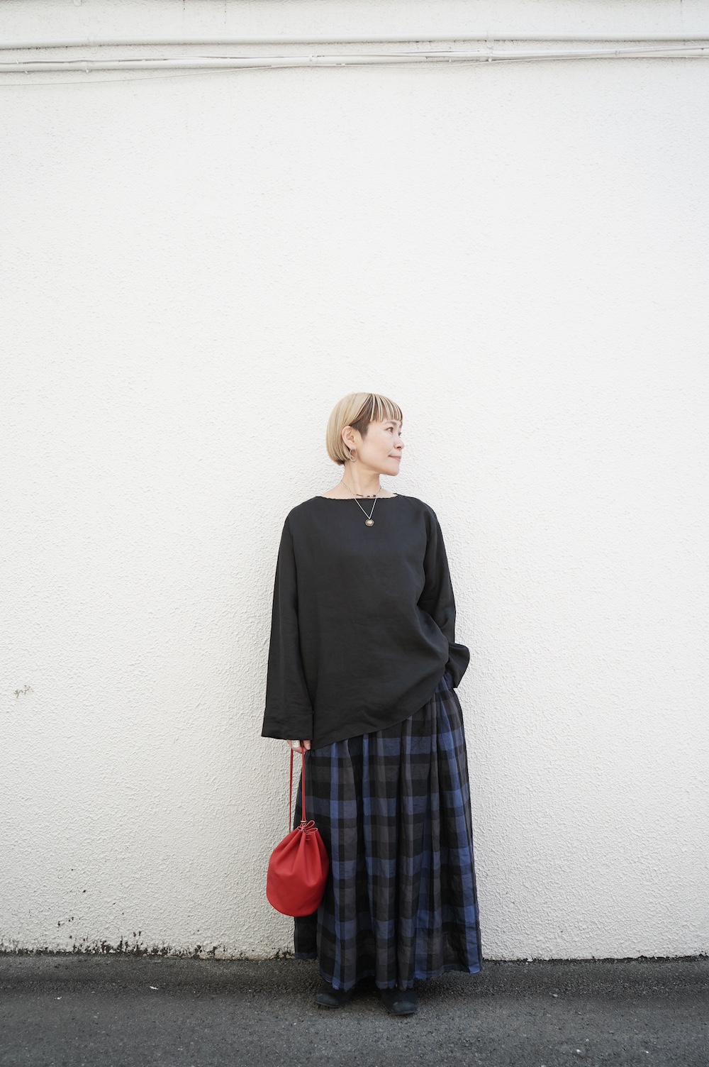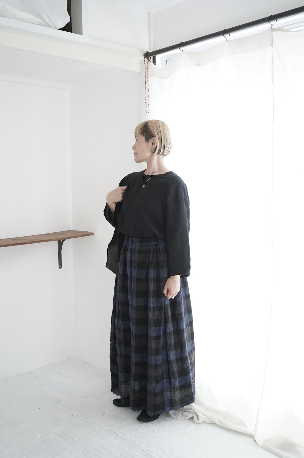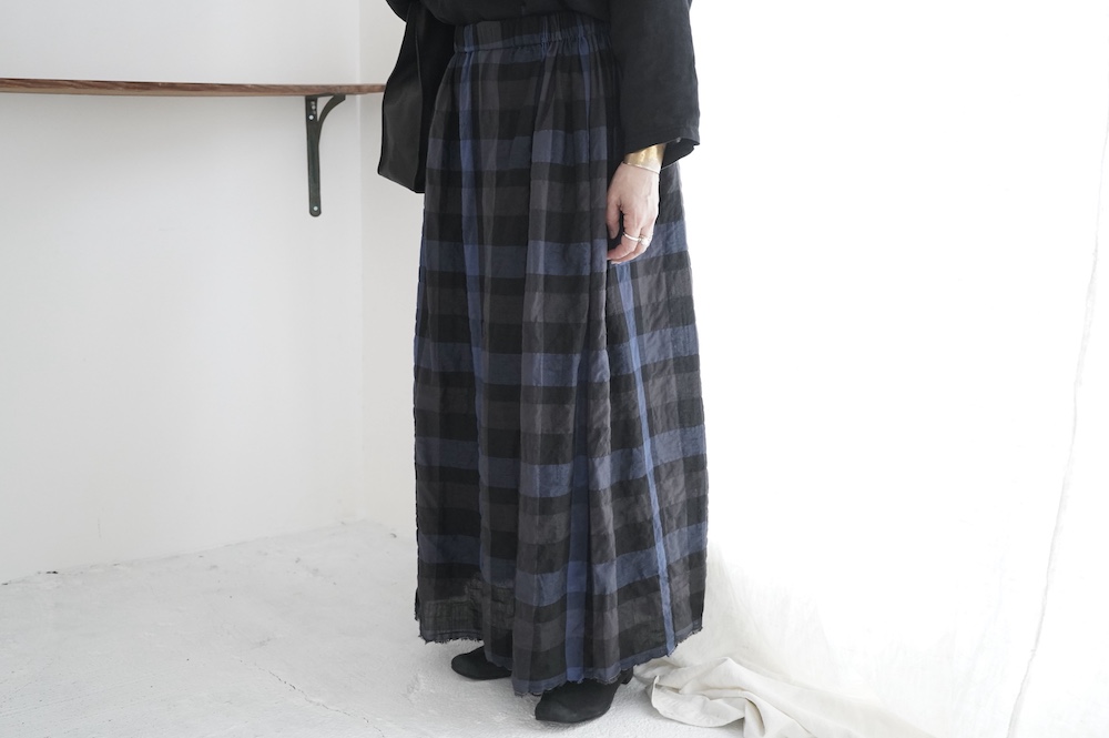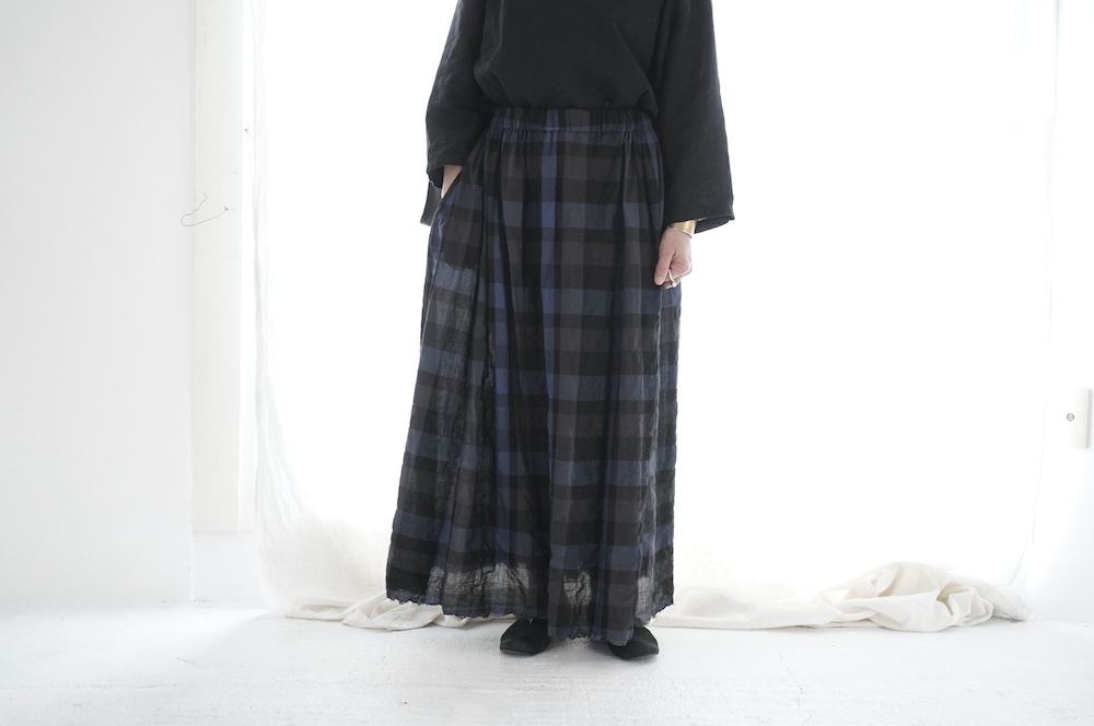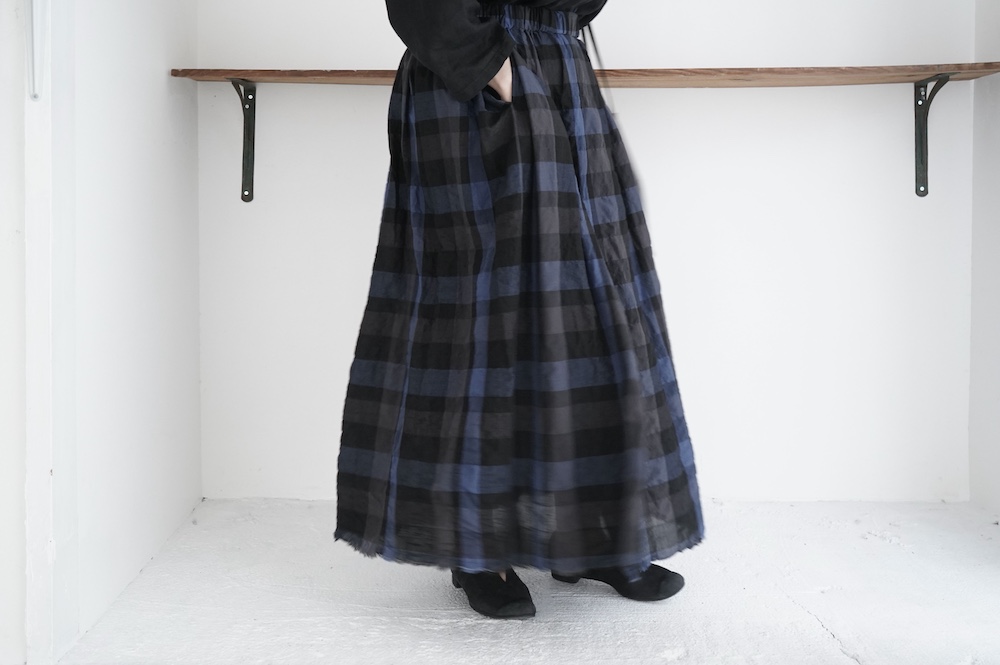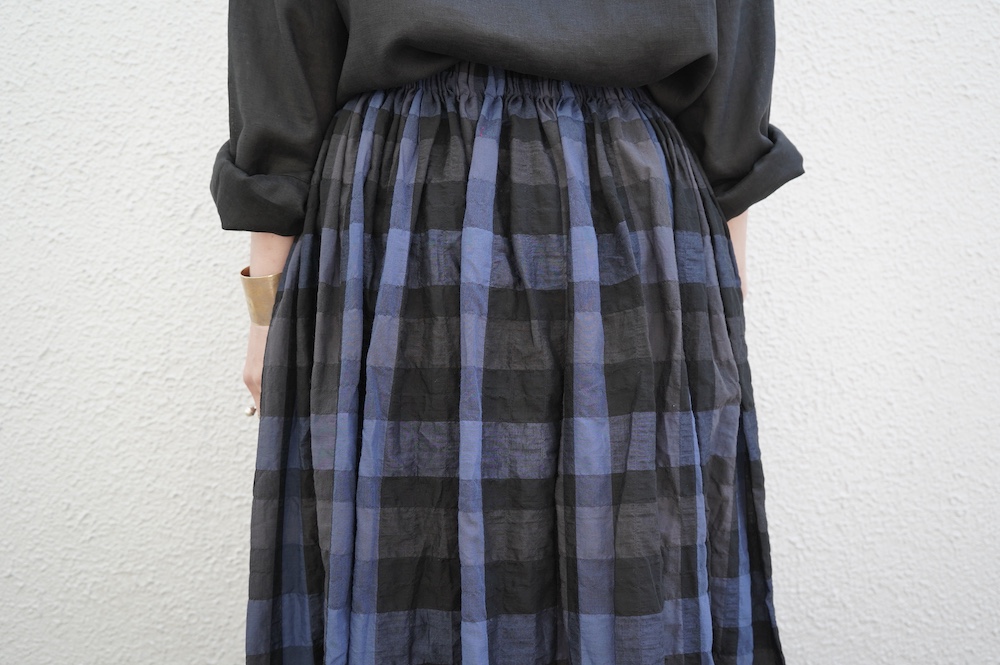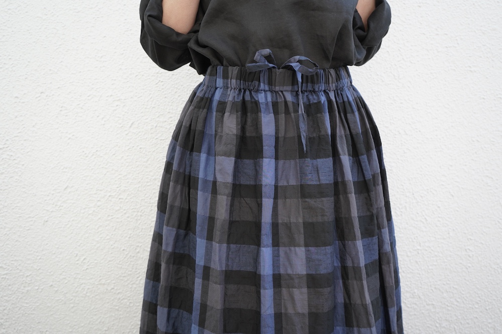 デザインはとてもシンプルで、膨らみすぎないシャーリングギャザーロングスカートです。ギャザーというよりは、ウェストのゴムによる伸縮性でシャーリングが出ているタイプで、実際にはギャザー分量はありません。ロング丈で、裾は耳づかいをしています。さりげないデザインで、様々なスタイリングに活用できそうです。トップスの変化で日々お楽しみください。