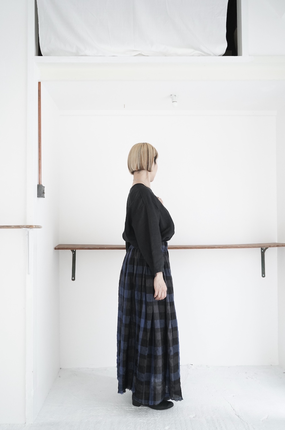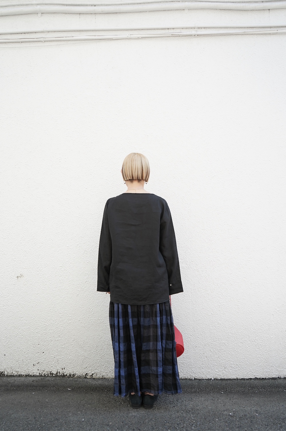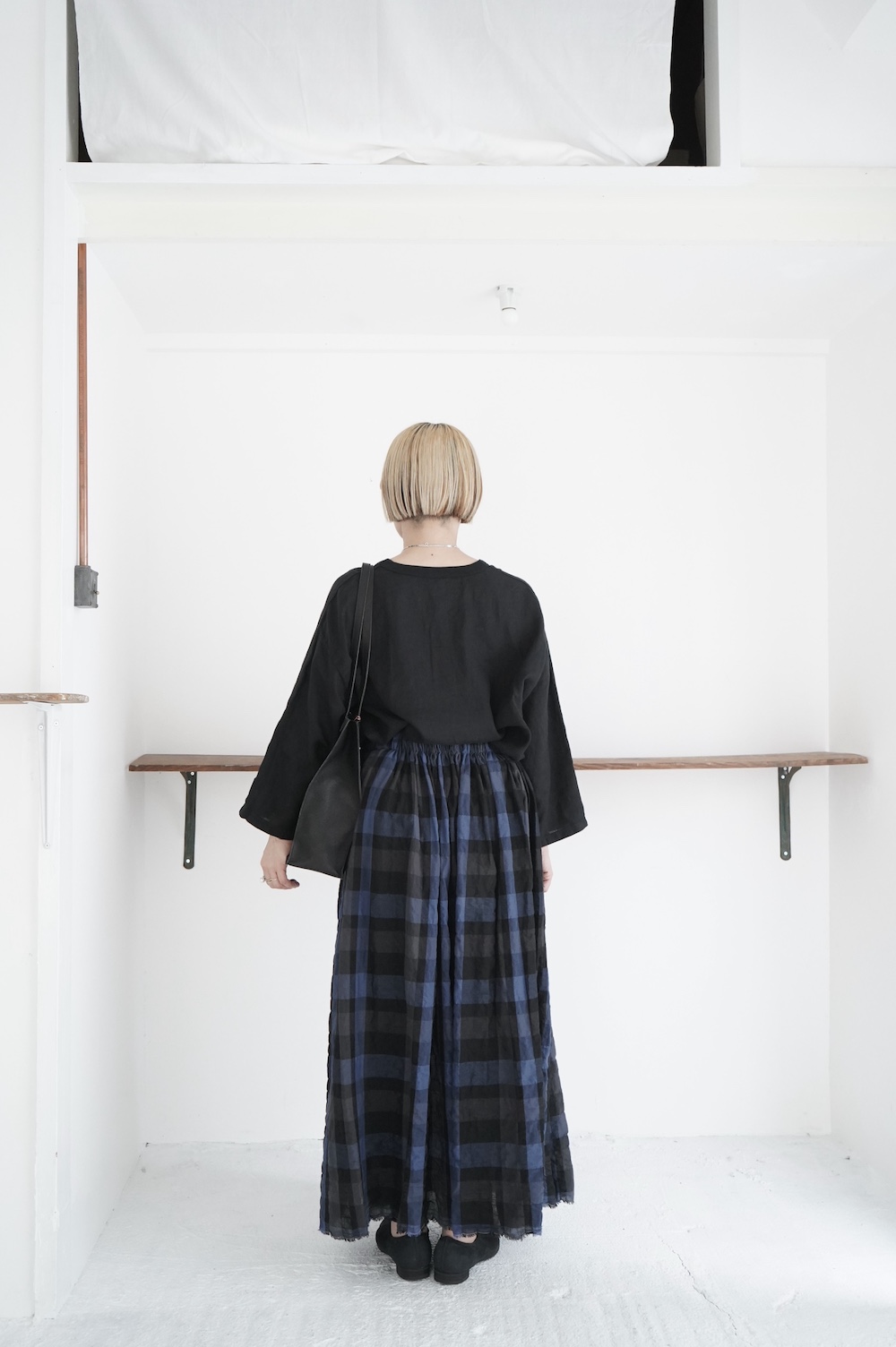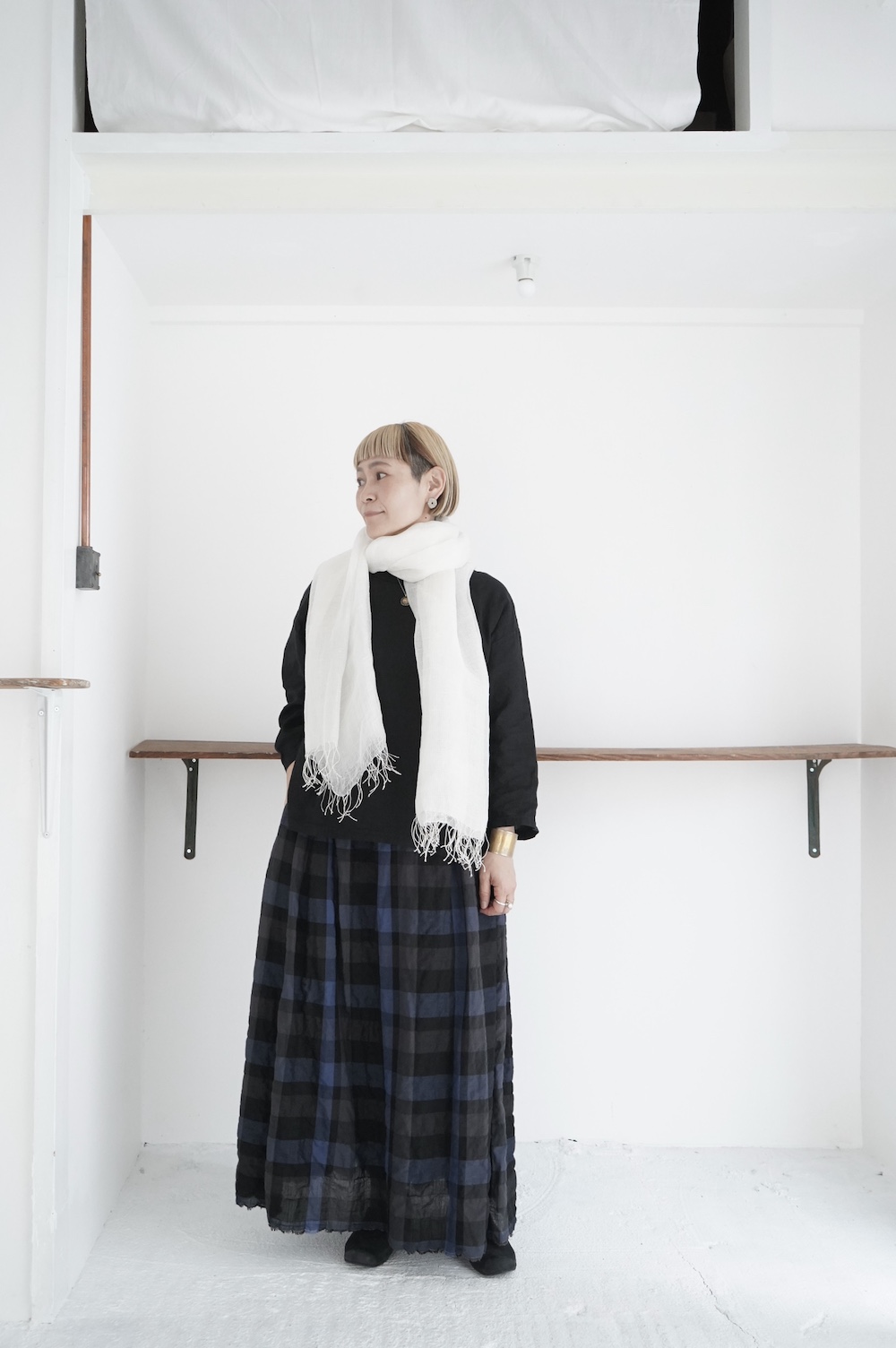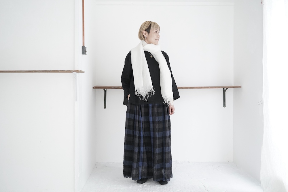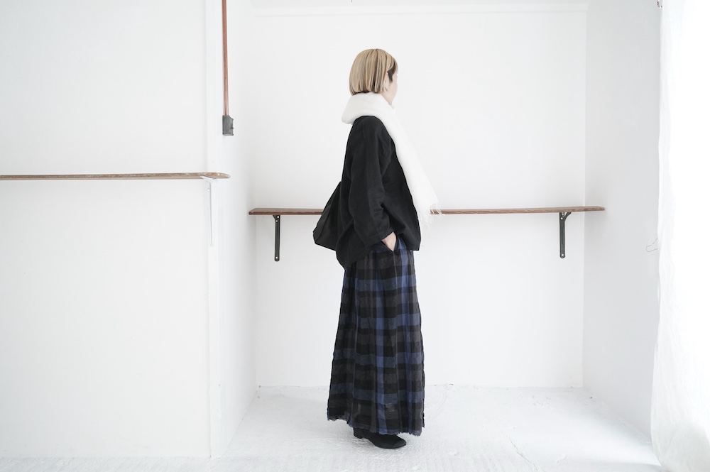 デザインはとてもシンプルで、膨らみすぎないシャーリングギャザーロングスカートです。ギャザーというよりは、ウェストのゴムによる伸縮性でシャーリングが出ているタイプで、実際にはギャザー分量はありません。ロング丈で、裾は耳づかいをしています。さりげないデザインで、様々なスタイリングに活用できそうです。トップスの変化で日々お楽しみください。