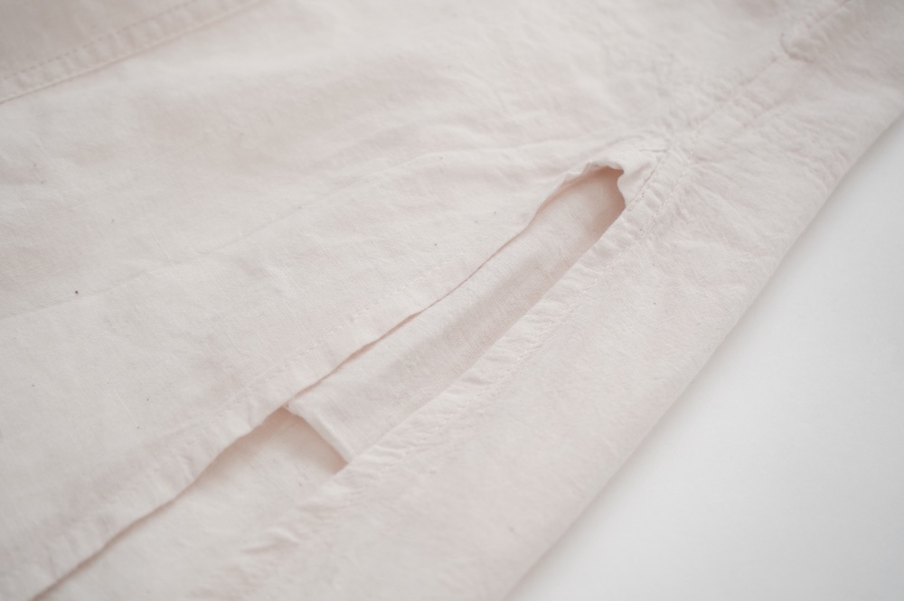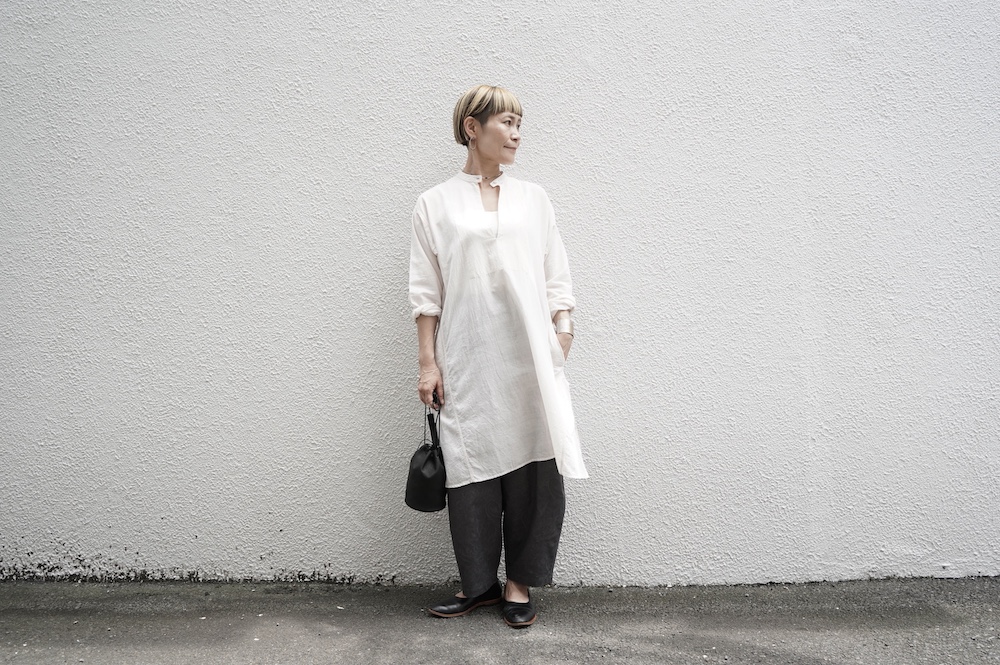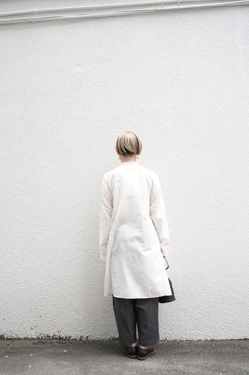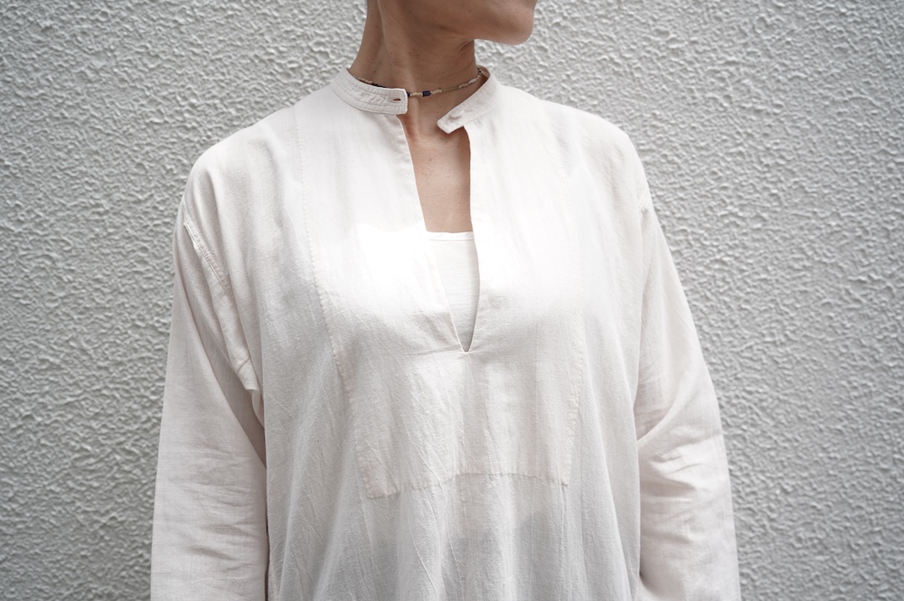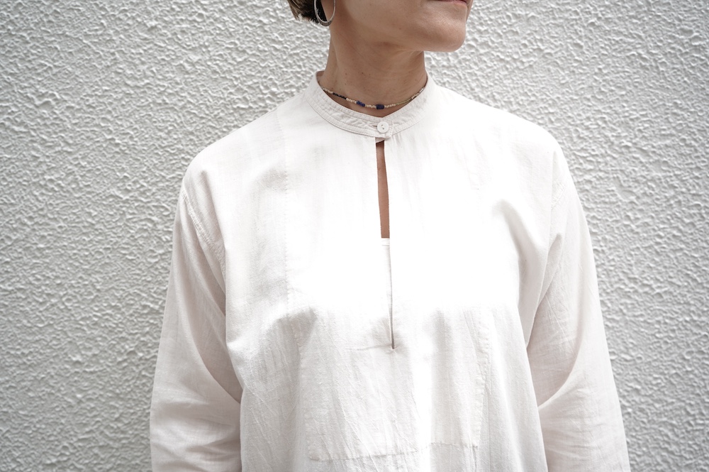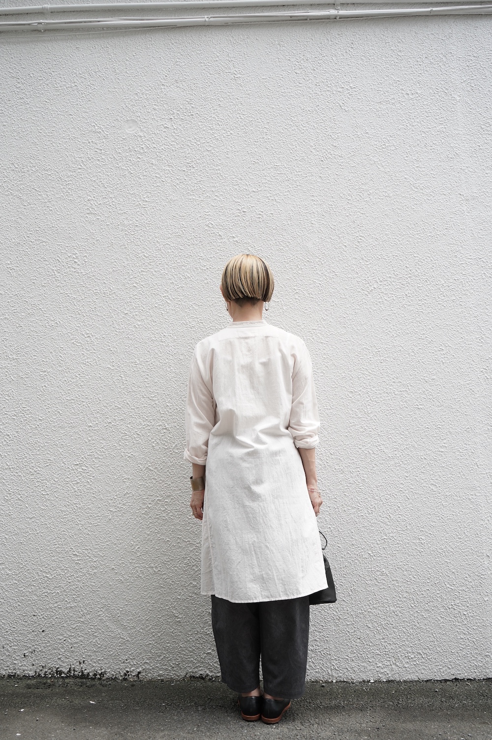 デザインは、インドのクルタシャツのような膝上丈のプルオーバーシャツ。バンドカラーで中心は襟部分のみボタンがついており、ボタンを外すとスリットネックのように縦に深い開きが女性らしい。袖下のマチ切り替えや、サイドが接ぎ合せになっていることで、程よいゆとりのあるAラインシルエットに仕上がっています。両サイドにはポケット付き。スリットも入っているのでボトムとのバランスが取りやすくなっています。ロングシャツながら見た目にも軽やかで、風の通りの良いシャツです。