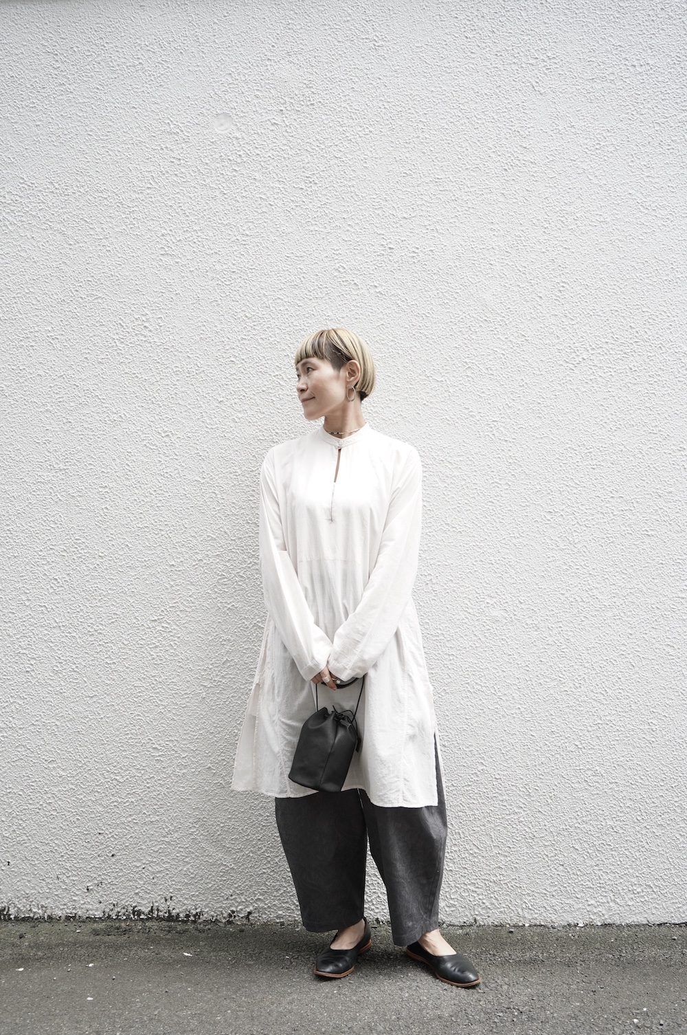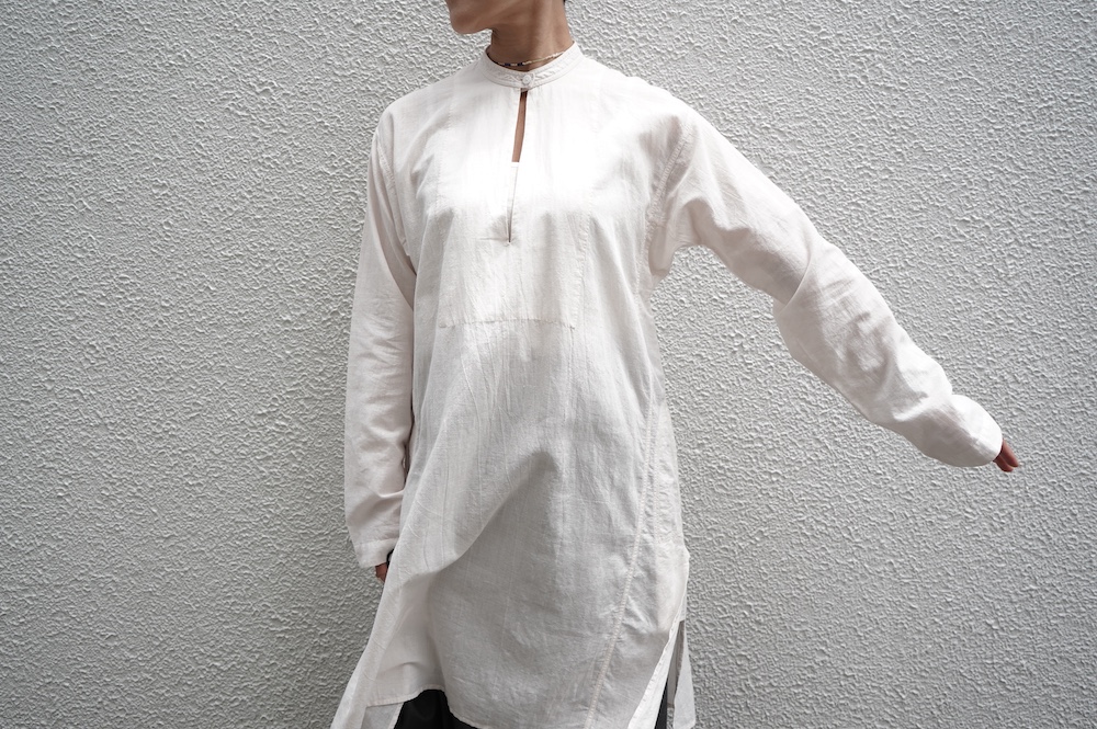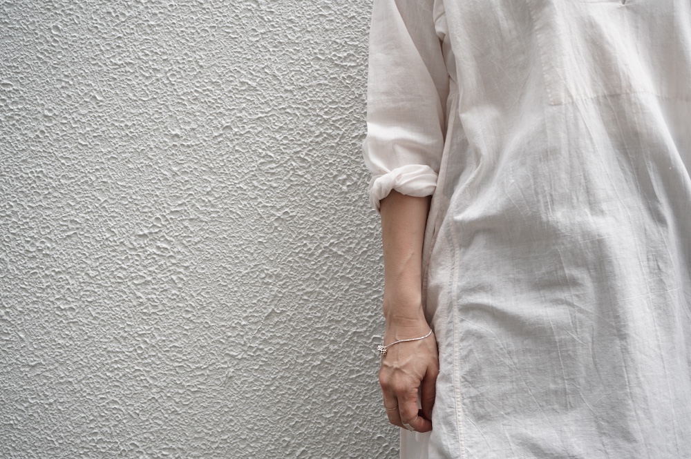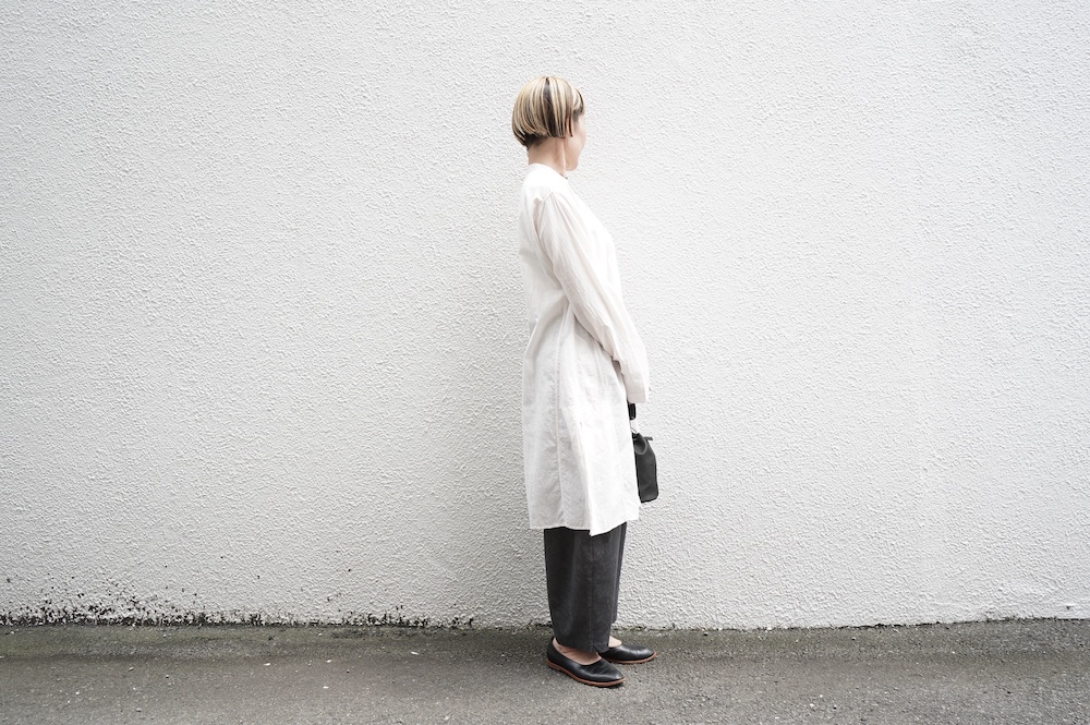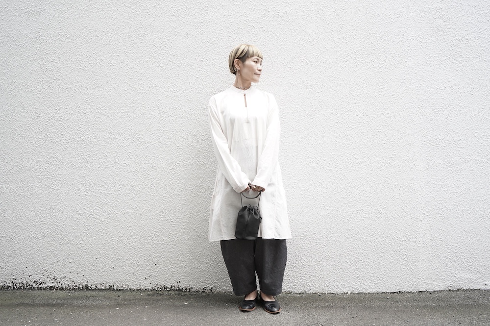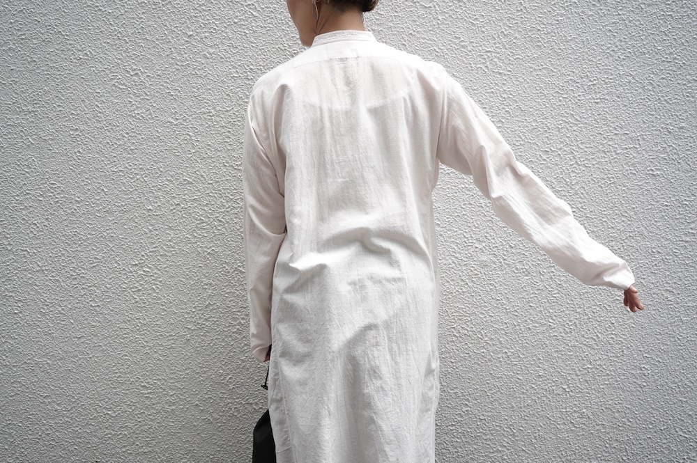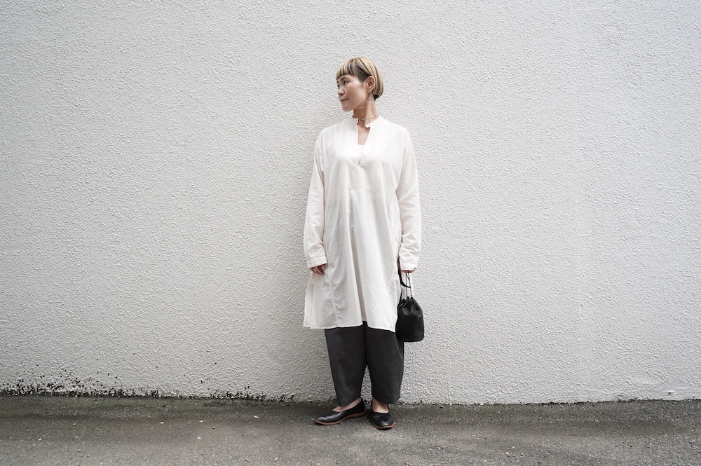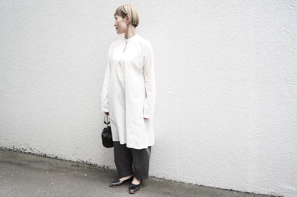 デザインは、インドのクルタシャツのような膝上丈のプルオーバーシャツ。バンドカラーで中心は襟部分のみボタンがついており、ボタンを外すとスリットネックのように縦に深い開きが女性らしい。袖下のマチ切り替えや、サイドが接ぎ合せになっていることで、程よいゆとりのあるAラインシルエットに仕上がっています。両サイドにはポケット付き。スリットも入っているのでボトムとのバランスが取りやすくなっています。ロングシャツながら見た目にも軽やかで、風の通りの良いシャツです。