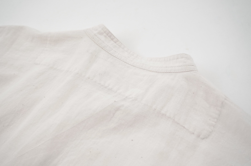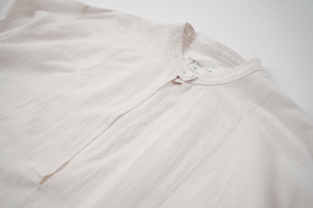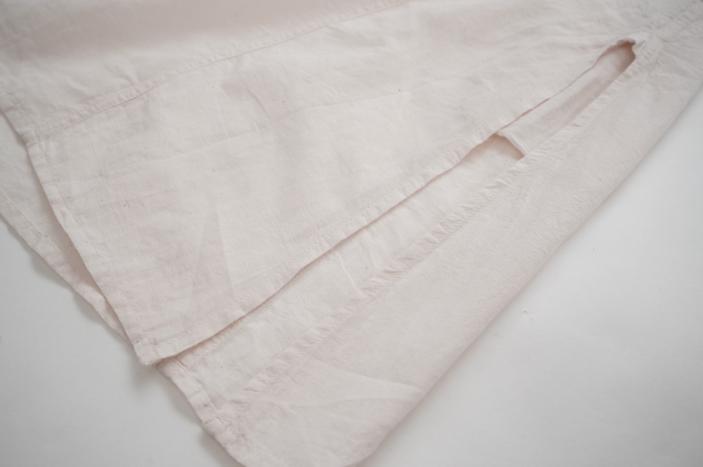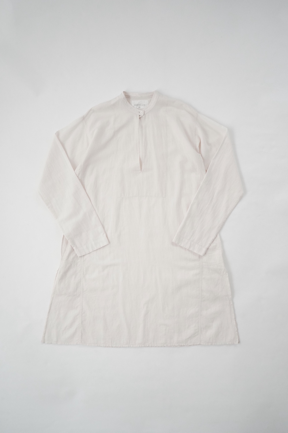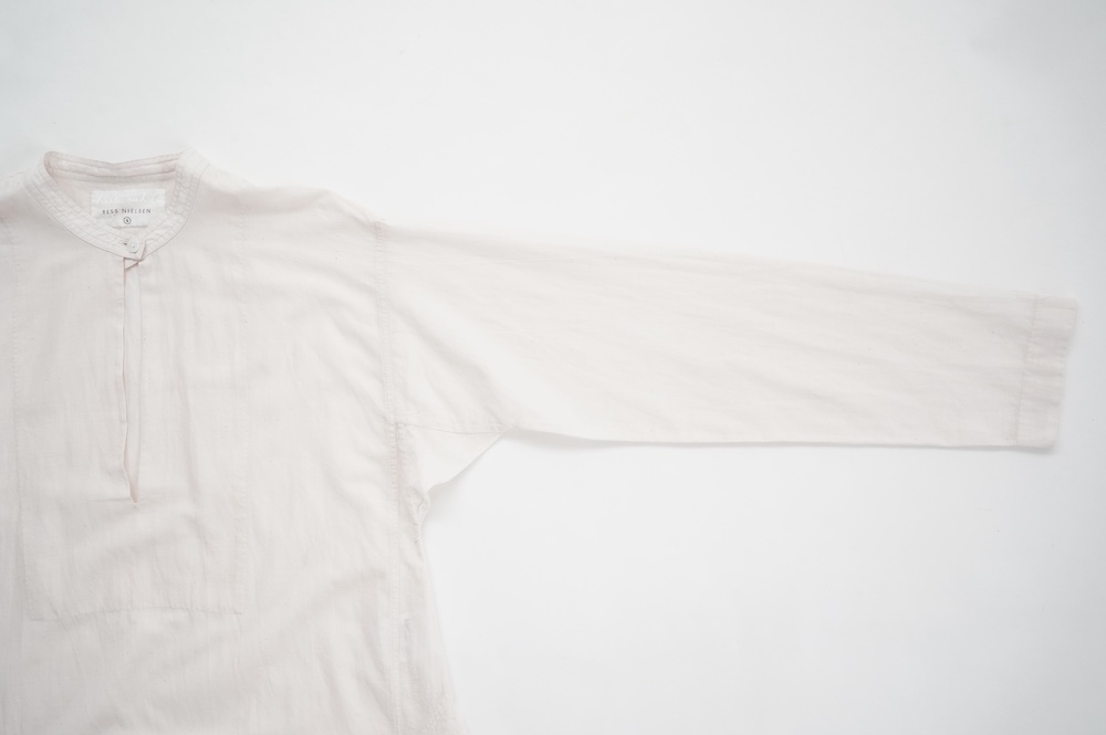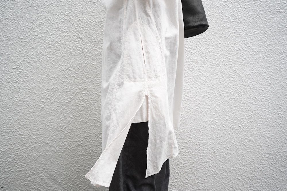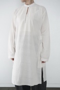 デザインは、インドのクルタシャツのような膝上丈のプルオーバーシャツ。バンドカラーで中心は襟部分のみボタンがついており、ボタンを外すとスリットネックのように縦に深い開きが女性らしい。袖下のマチ切り替えや、サイドが接ぎ合せになっていることで、程よいゆとりのあるAラインシルエットに仕上がっています。両サイドにはポケット付き。スリットも入っているのでボトムとのバランスが取りやすくなっています。ロングシャツながら見た目にも軽やかで、風の通りの良いシャツです。