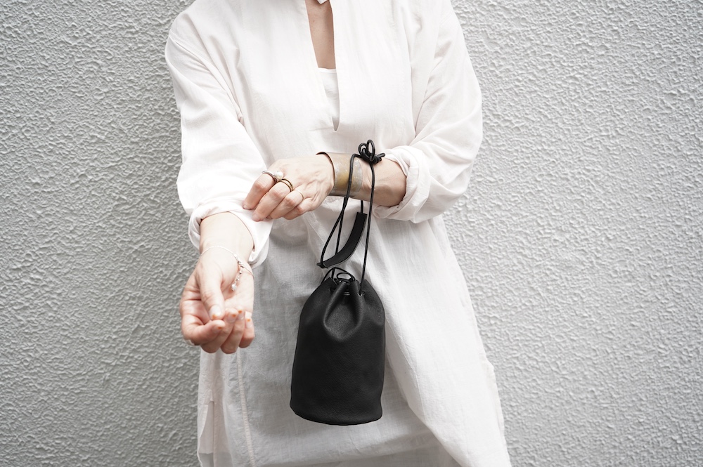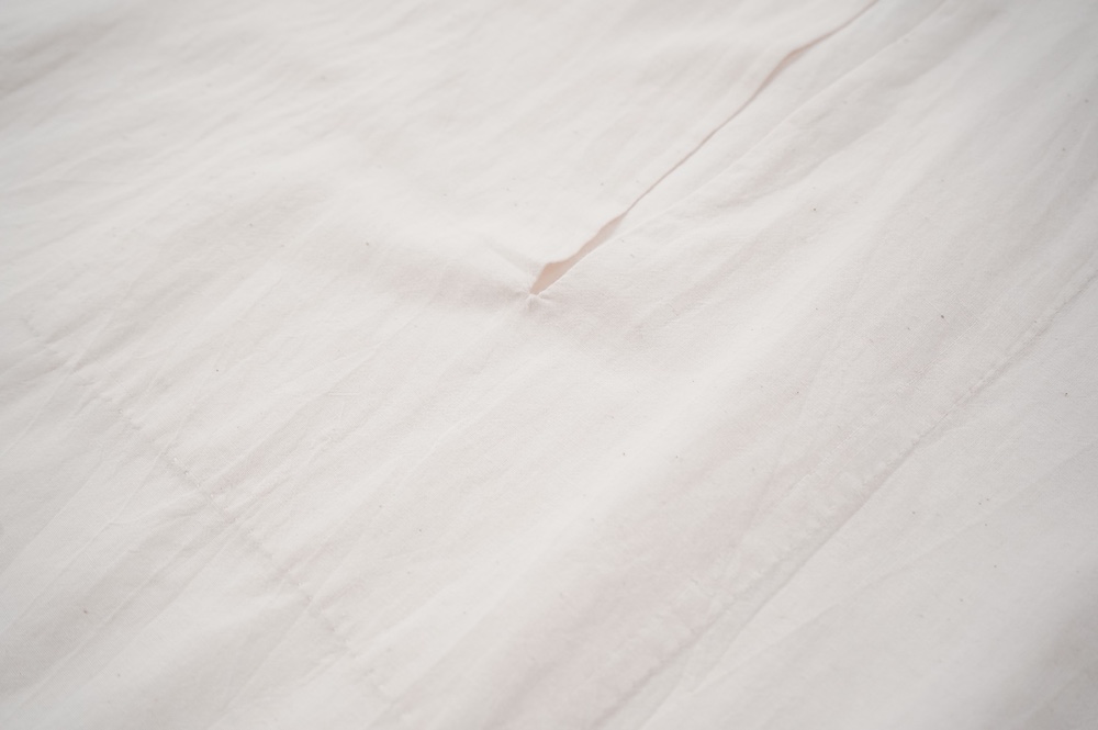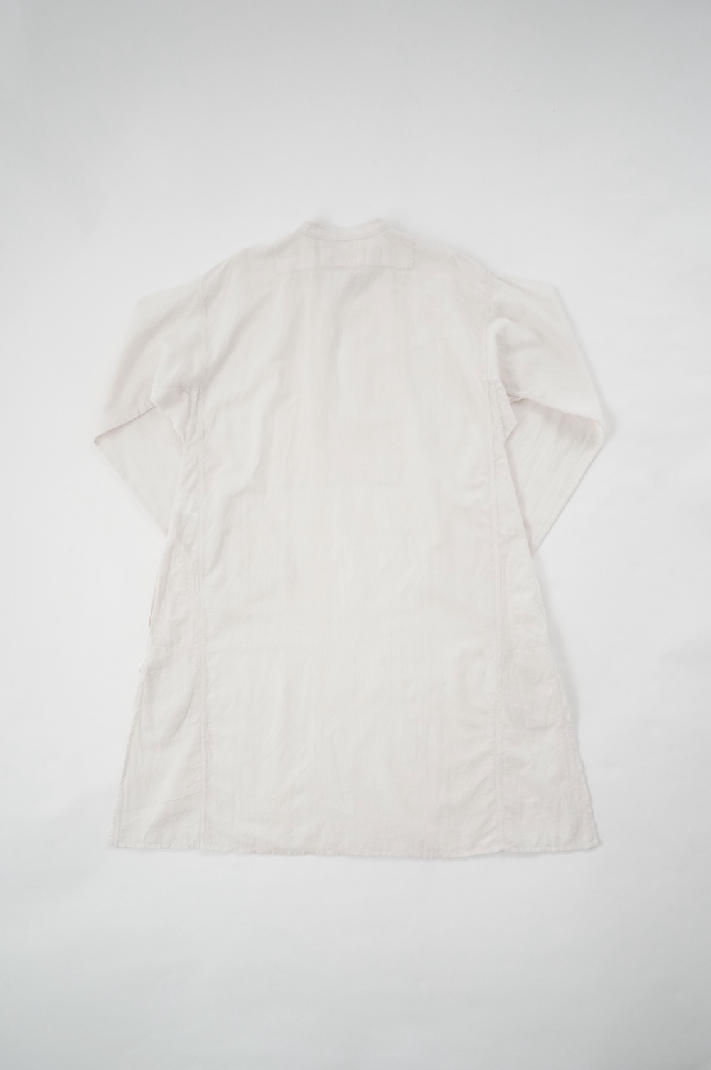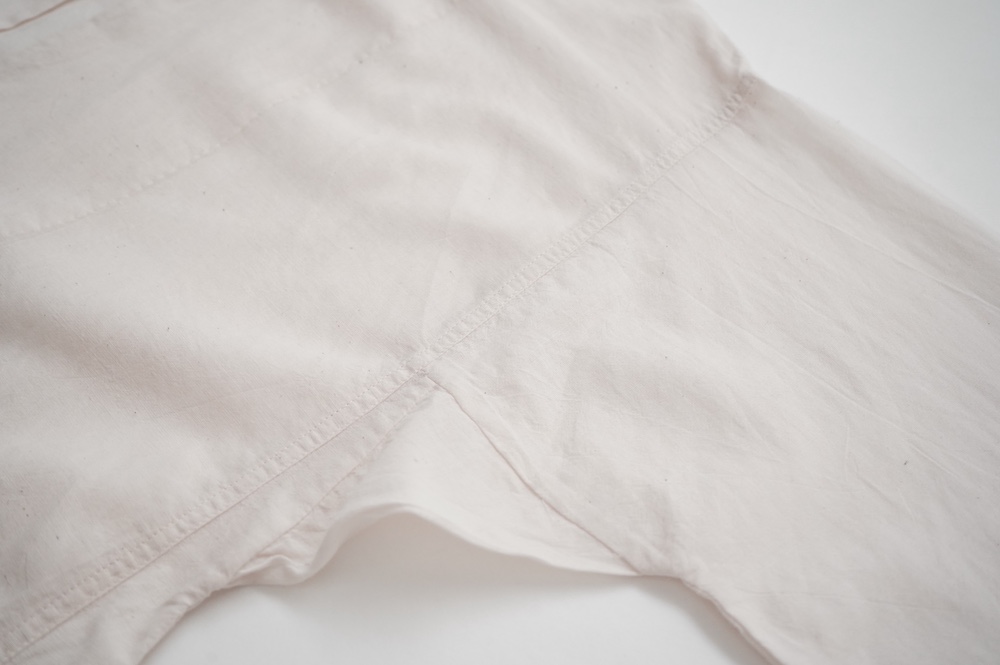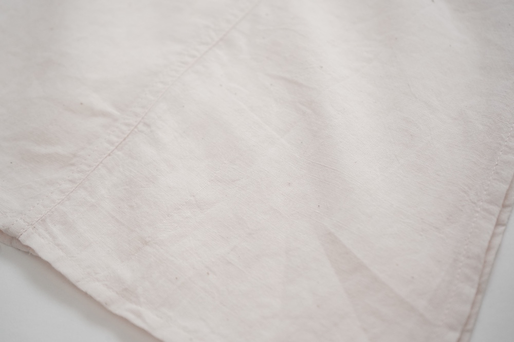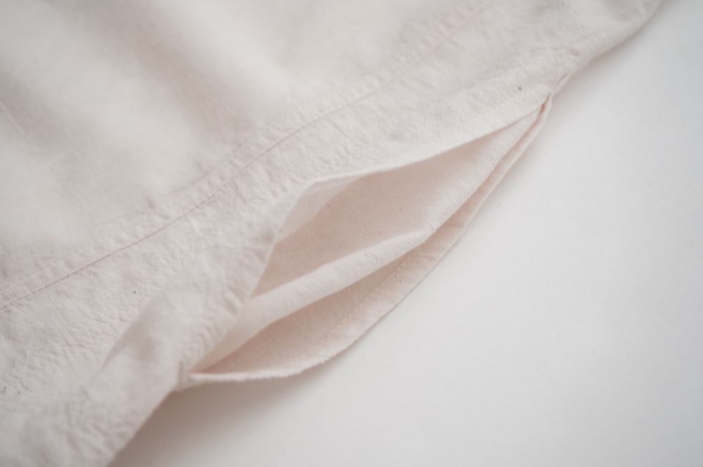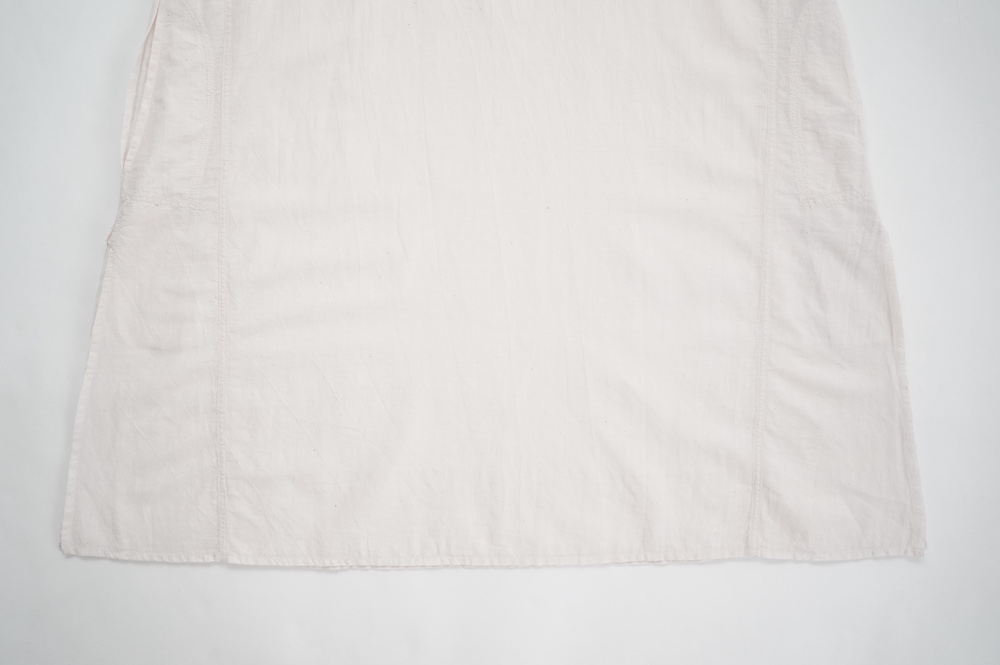 デザインは、インドのクルタシャツのような膝上丈のプルオーバーシャツ。バンドカラーで中心は襟部分のみボタンがついており、ボタンを外すとスリットネックのように縦に深い開きが女性らしい。袖下のマチ切り替えや、サイドが接ぎ合せになっていることで、程よいゆとりのあるAラインシルエットに仕上がっています。両サイドにはポケット付き。スリットも入っているのでボトムとのバランスが取りやすくなっています。ロングシャツながら見た目にも軽やかで、風の通りの良いシャツです。