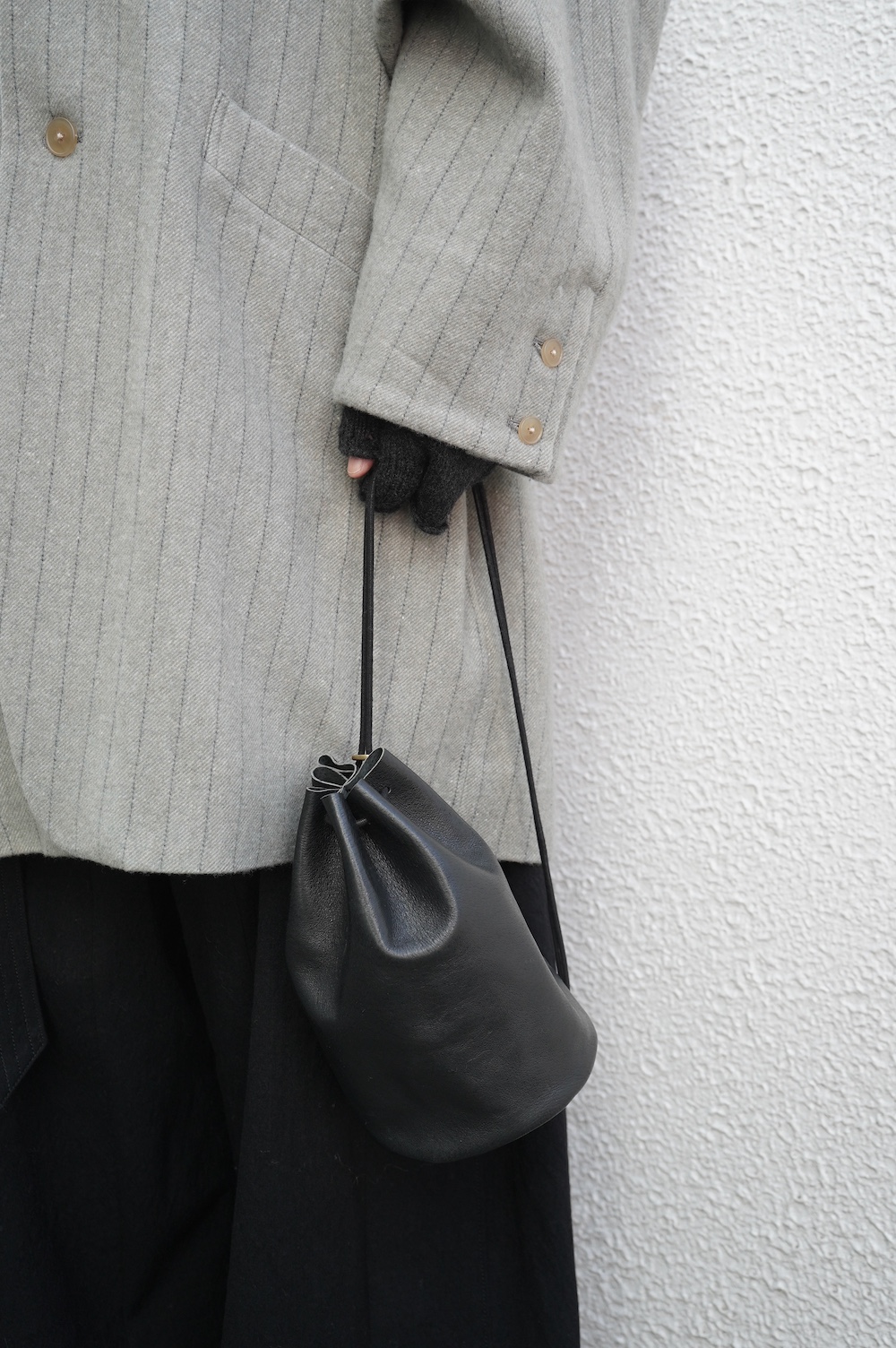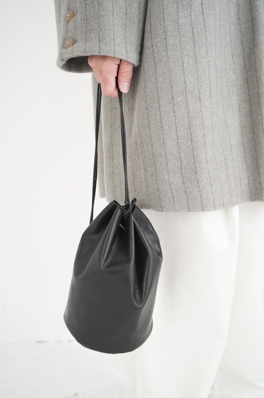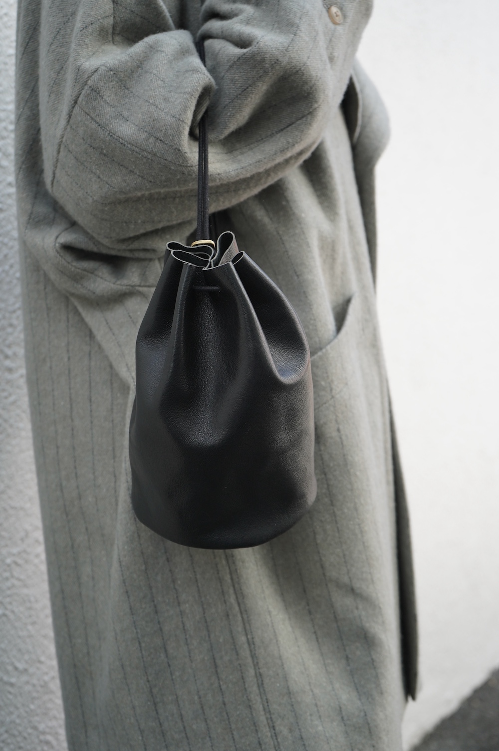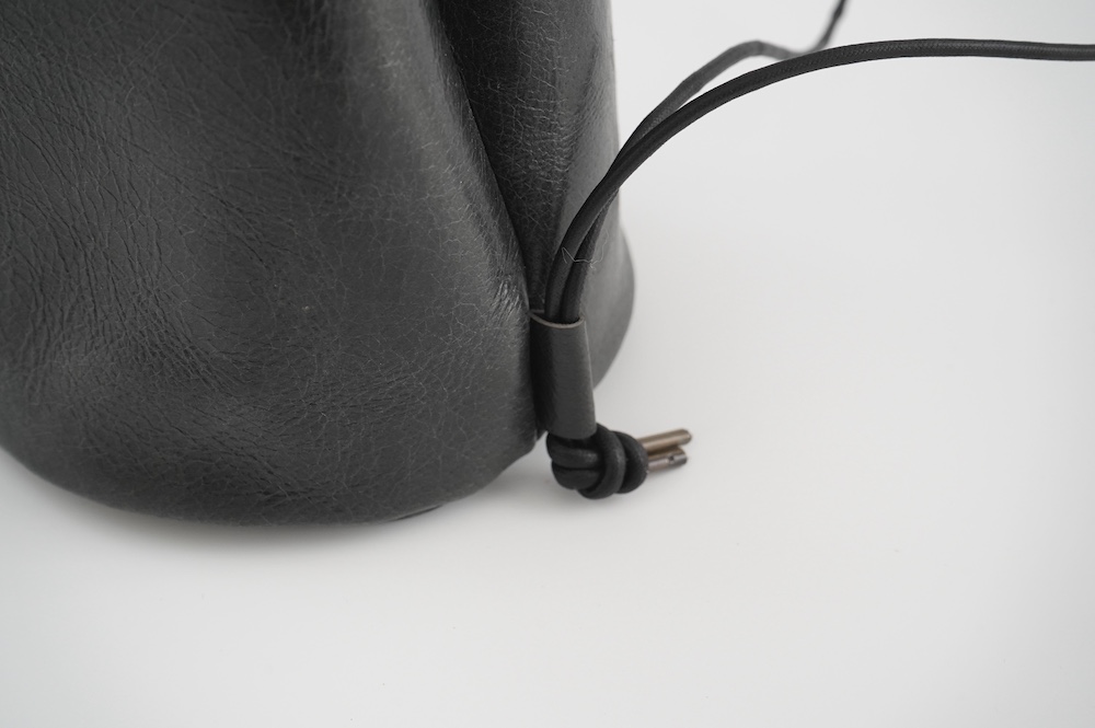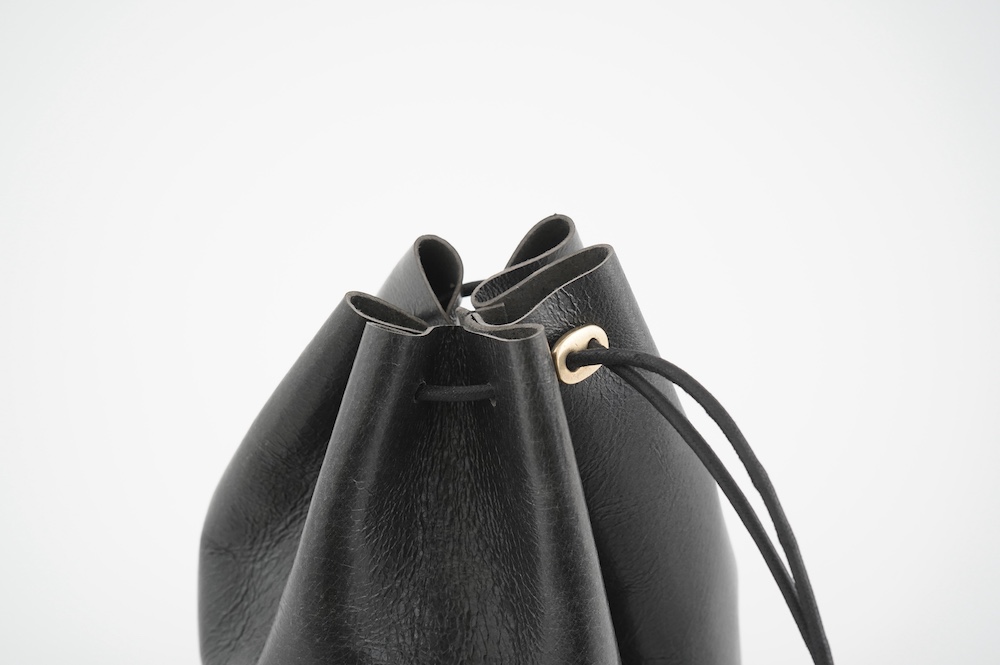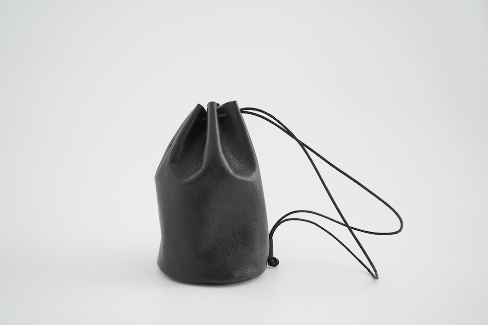 こちらは小さめだけど長財布がしっかり入る少し縦長なバランスの巾着バッグ。昔肩からかけてプールに行く時持った経験のある、あの丸底のバッグをデザインベースに作りました。斜めにぷらーんと手持ちにしたり、肩から掛けたり。紐の通し方を変えて、持ち方も遊べます。長財布、メガネ、ペンケース、文庫本、携帯電話等を入れても、キュッと上を閉じることができます。