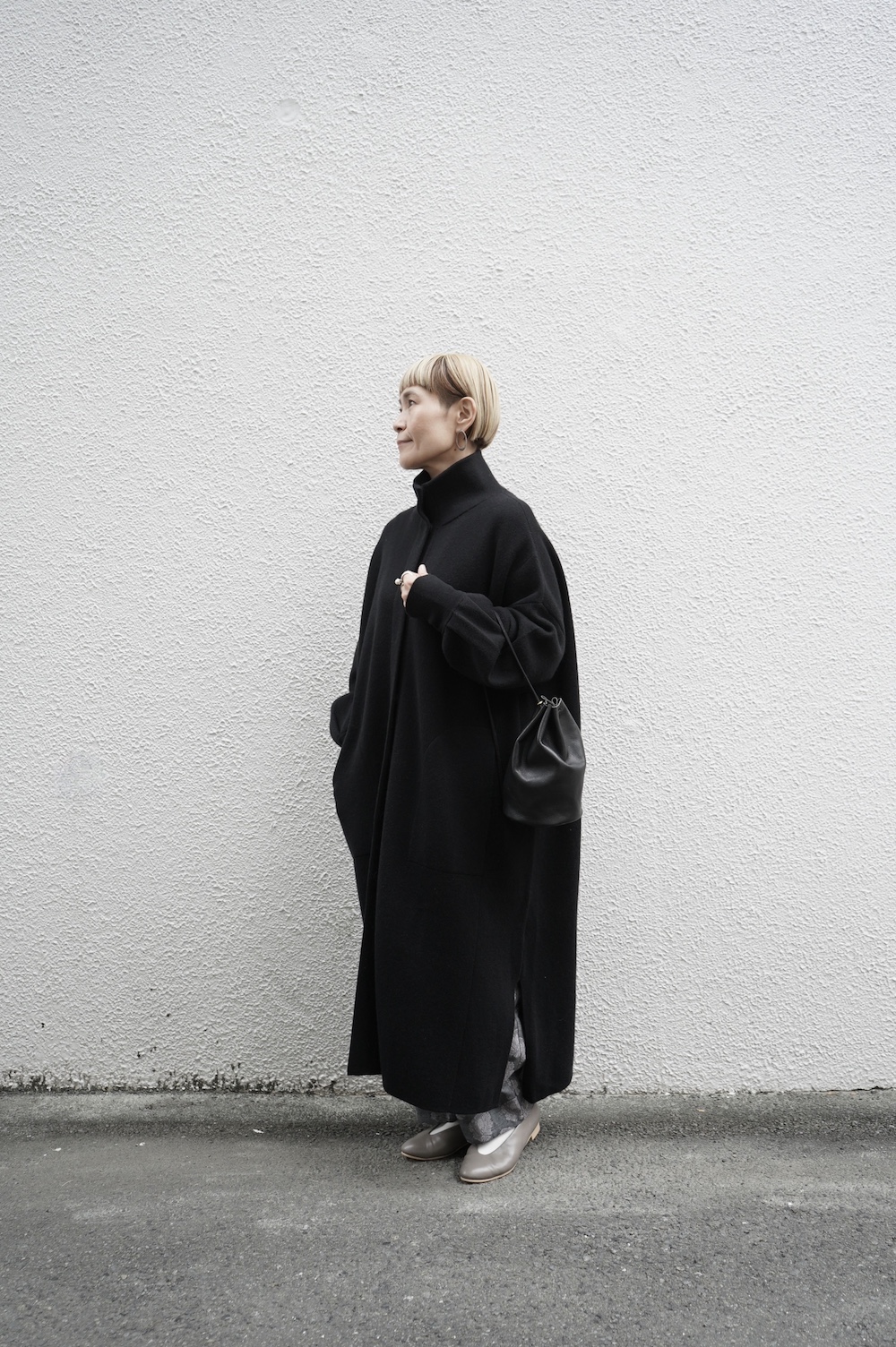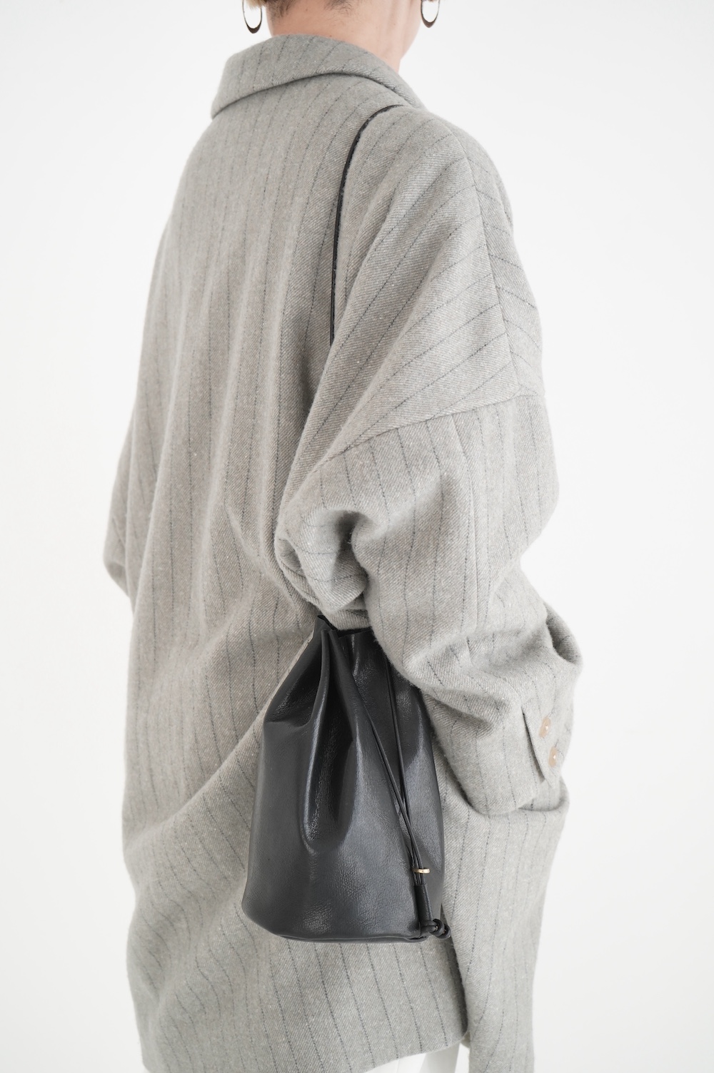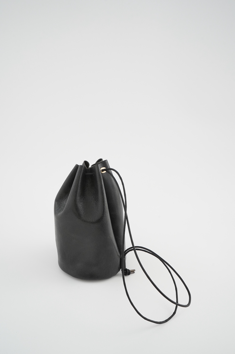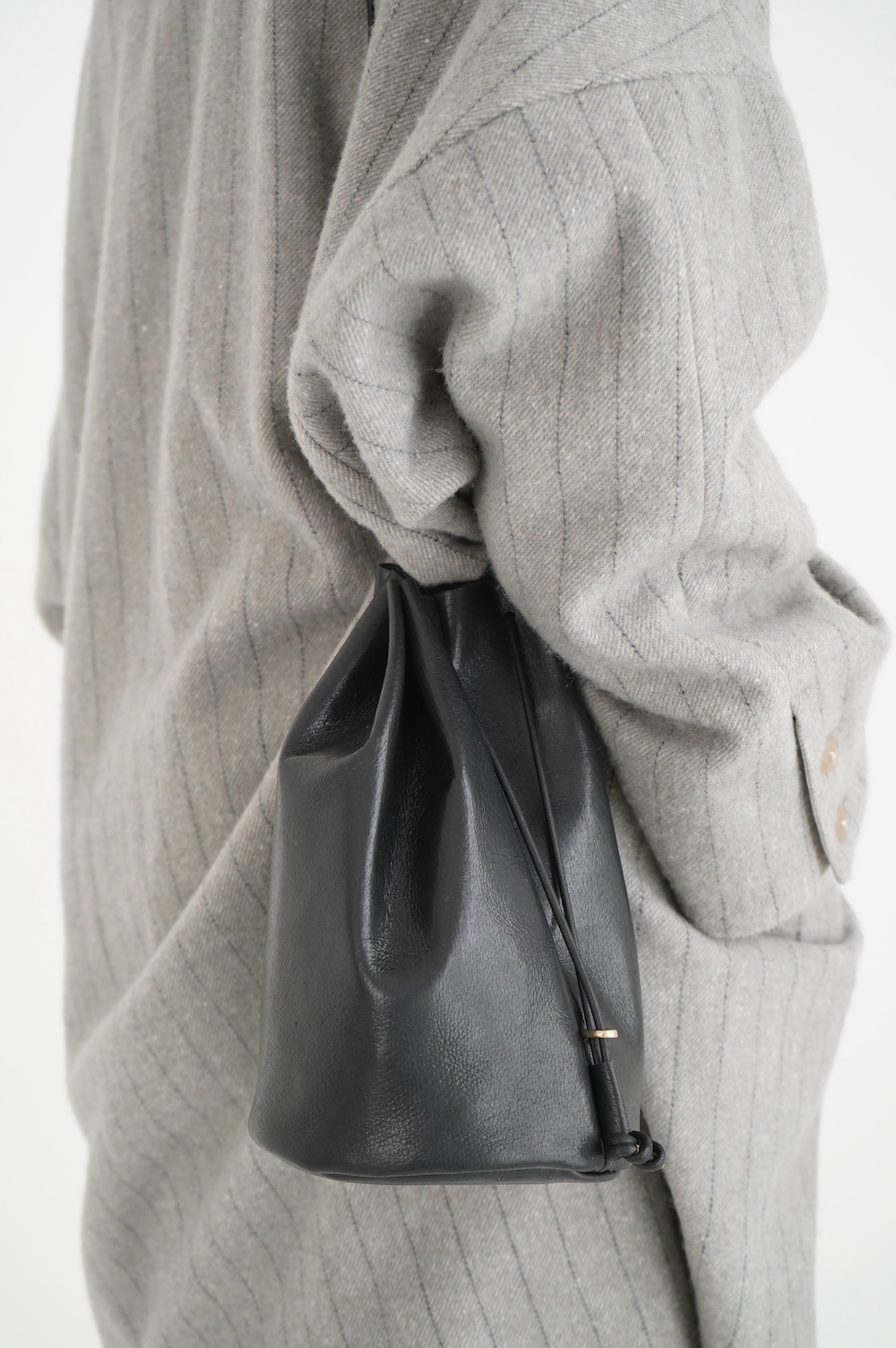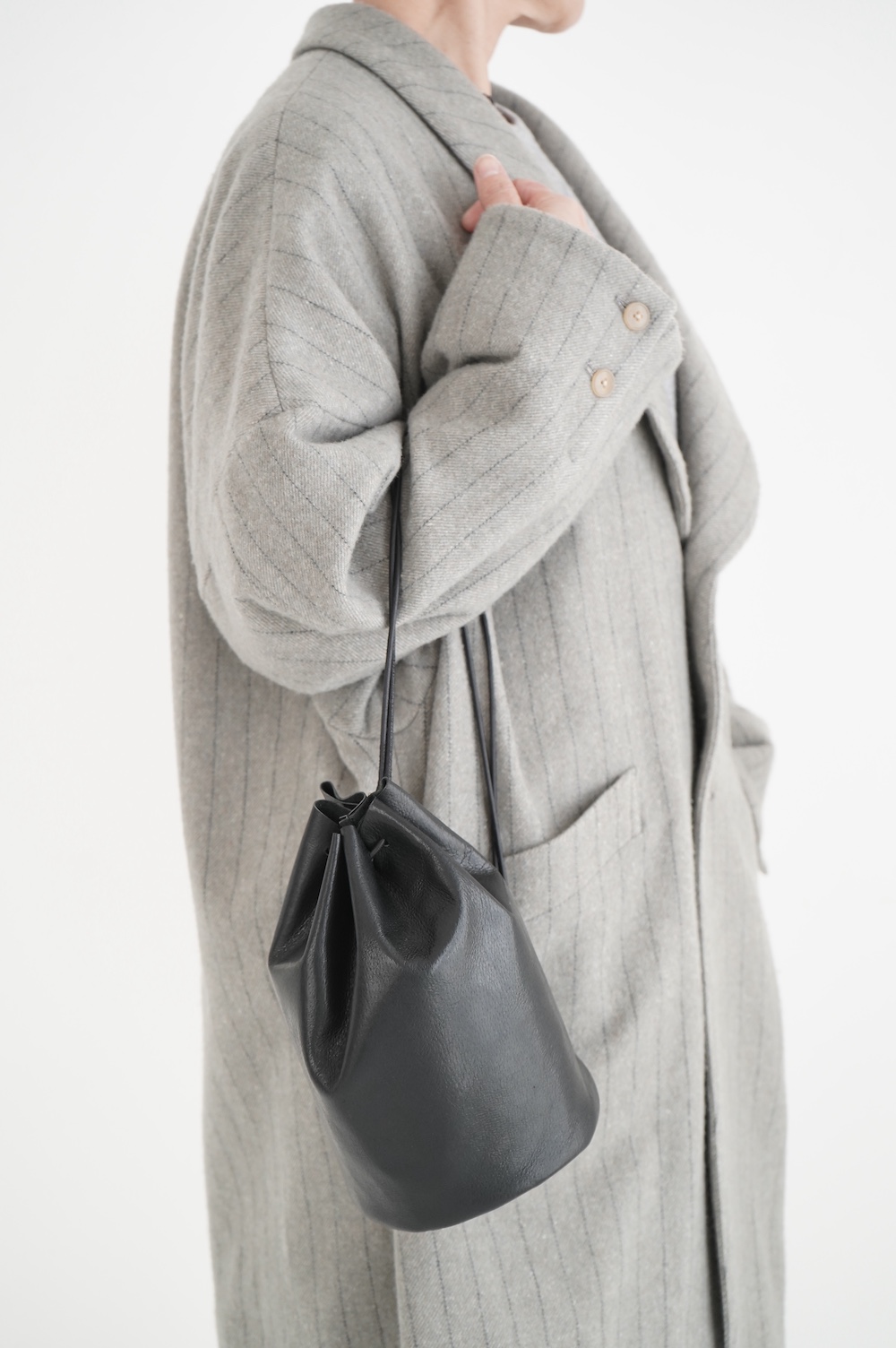 こちらは小さめだけど長財布がしっかり入る少し縦長なバランスの巾着バッグ。昔肩からかけてプールに行く時持った経験のある、あの丸底のバッグをデザインベースに作りました。斜めにぷらーんと手持ちにしたり、肩から掛けたり。紐の通し方を変えて、持ち方も遊べます。長財布、メガネ、ペンケース、文庫本、携帯電話等を入れても、キュッと上を閉じることができます。