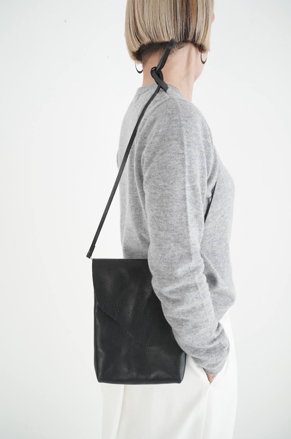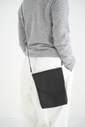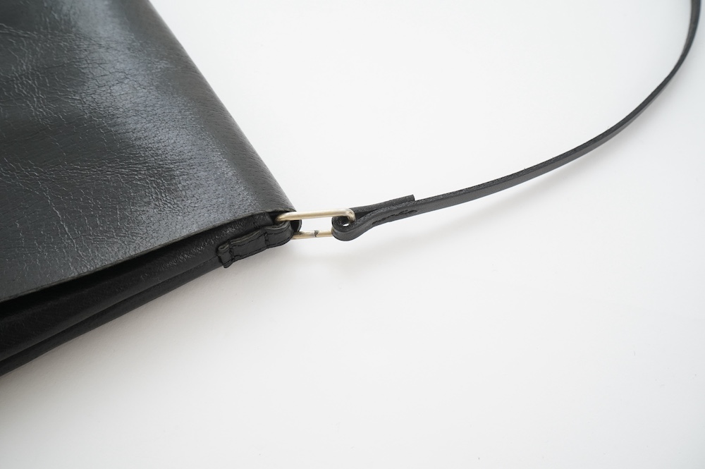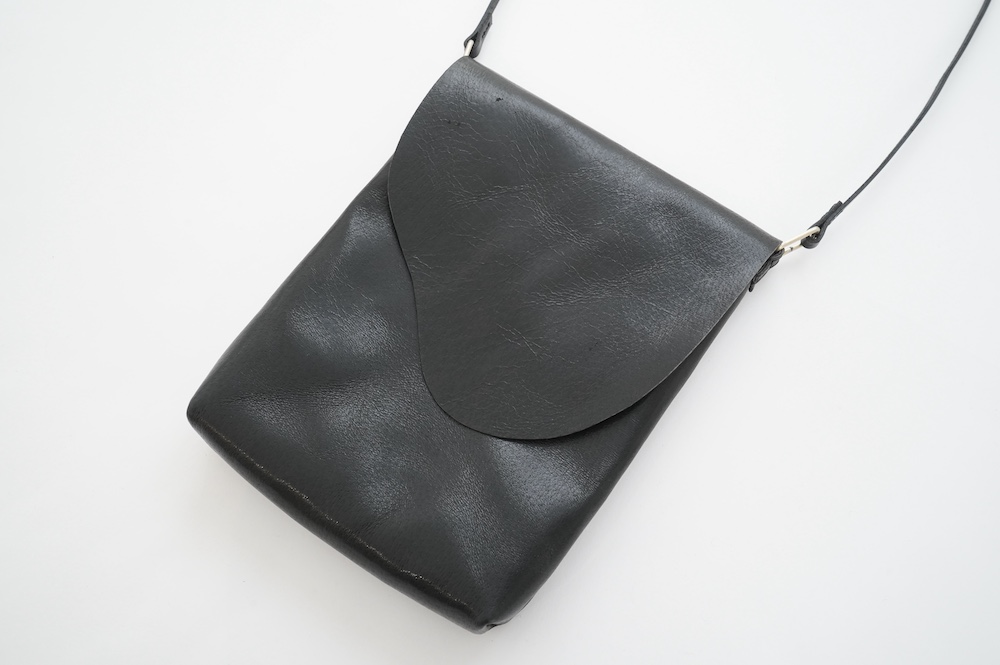 山のような形状のフラップが特徴的なショルダーバッグ。店主が小さめなショルダーが欲しいなーという興味から生まれた、一番男性的な要素が含まれるアイテムです。マチは薄めですが長財布、ノート、携帯、カードケース等入れても余裕があります。細めのストラップと、サイドの四角い金具の形状にも拘った、女性だけではなく男性にもお勧めなショルダーバッグです。