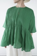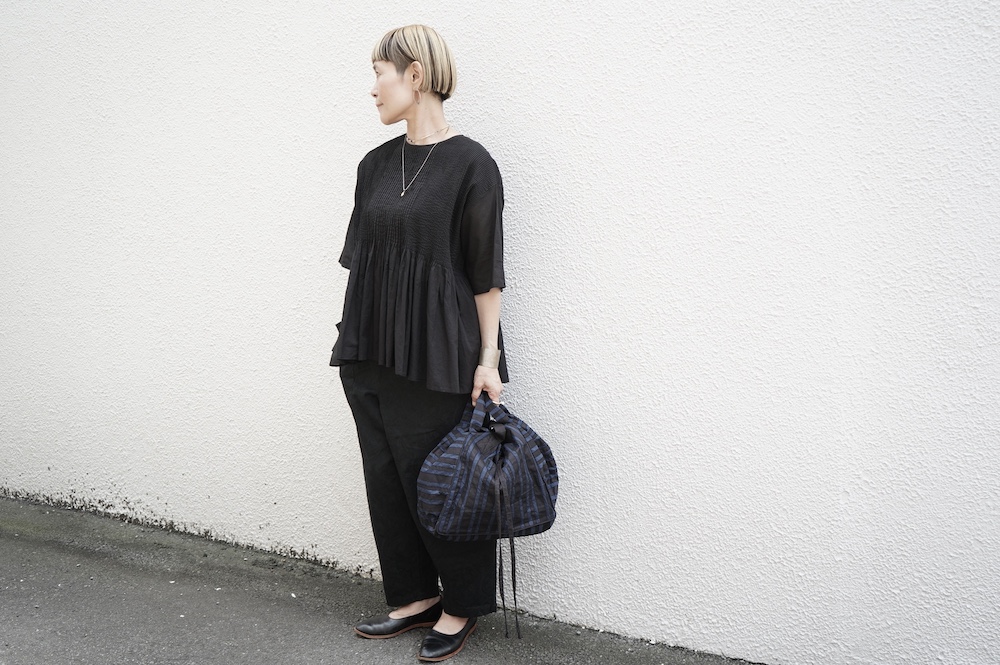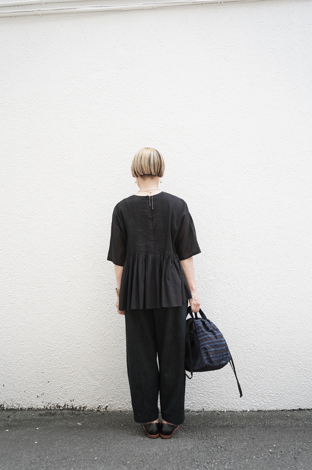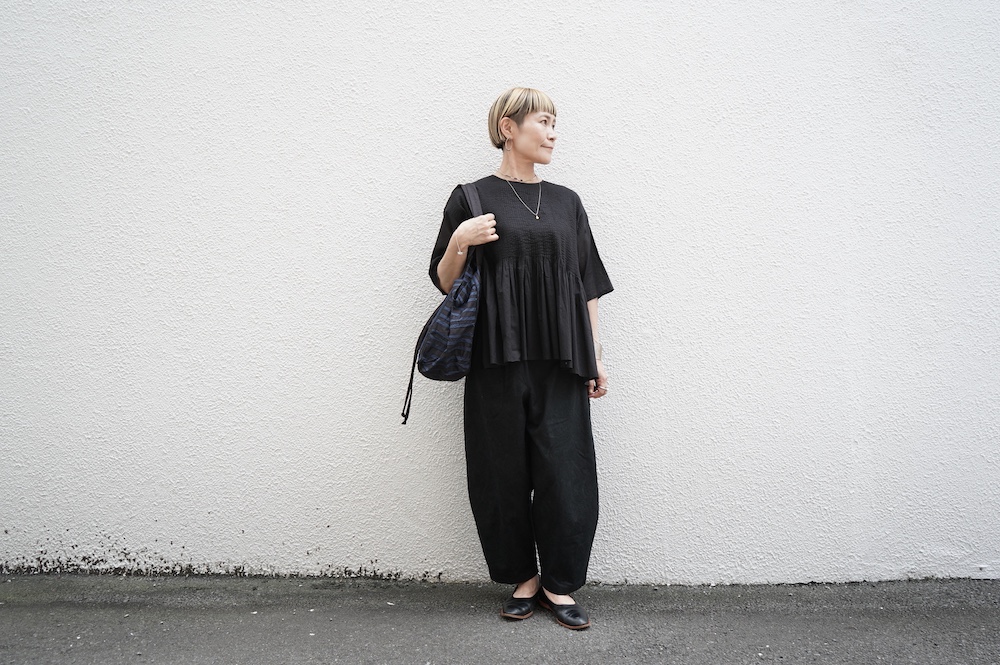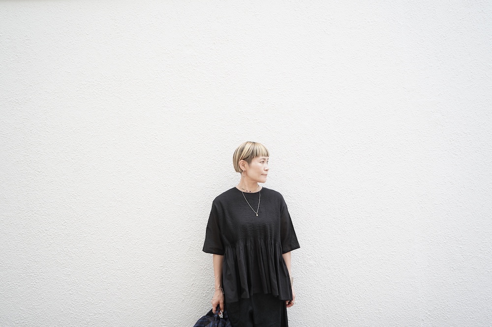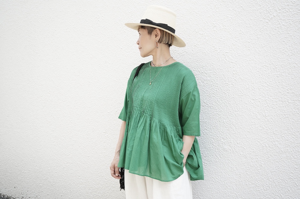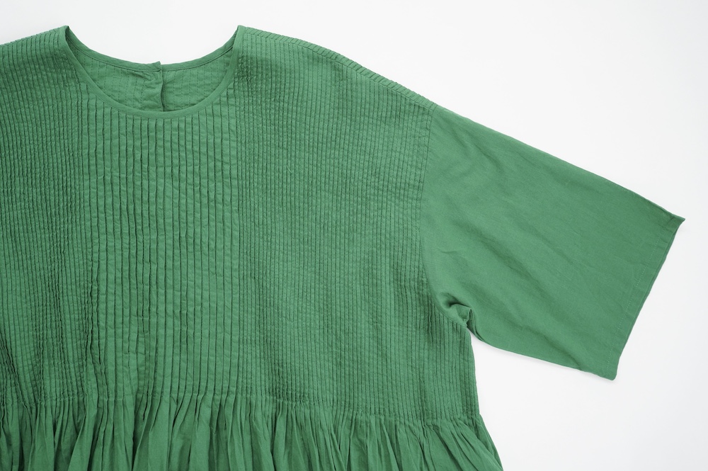 変えているのもアクセントになっています。後ろはボタン開きで、共布の包みボタンを使用しています。袖が肘くらいまでの5分袖です。ピンタックが施されていることで胸元はすっきりと、裾にかけて緩やかな広がりのあるシルエットが可愛らしい。薄手のコットンで見た目にも軽やかに着ていただけるプルオーバーです。