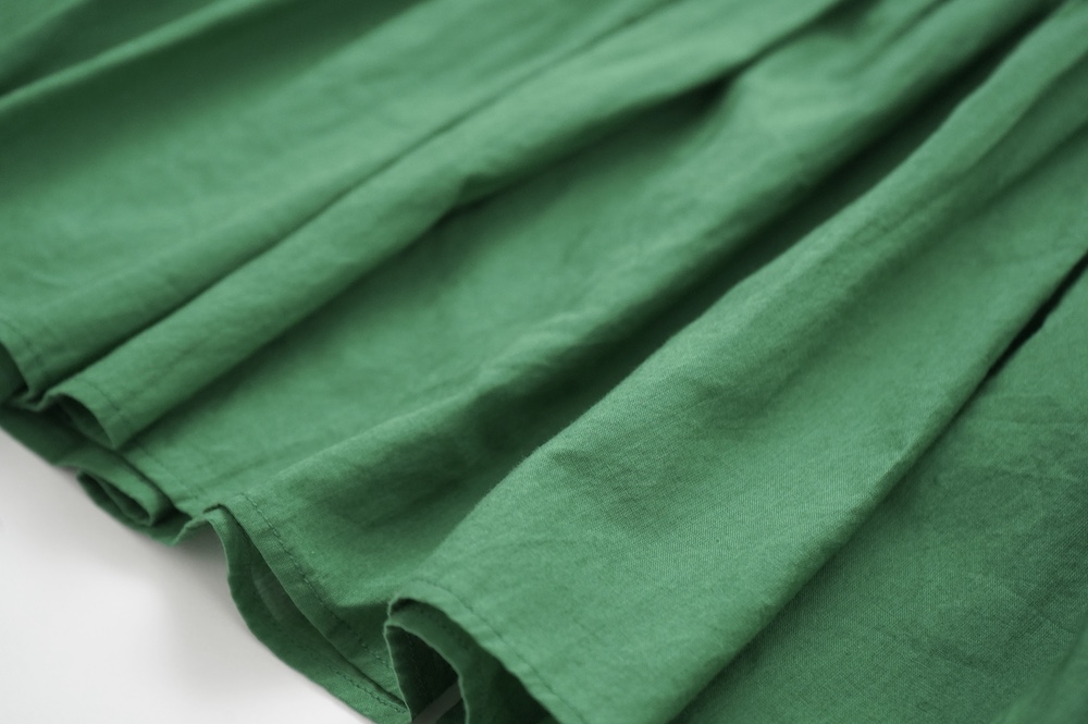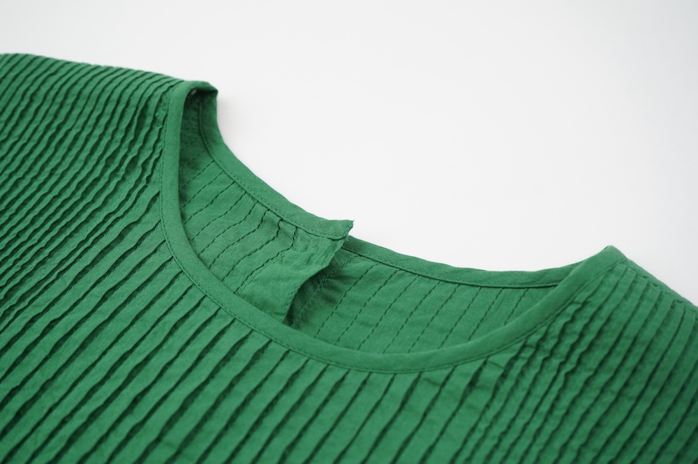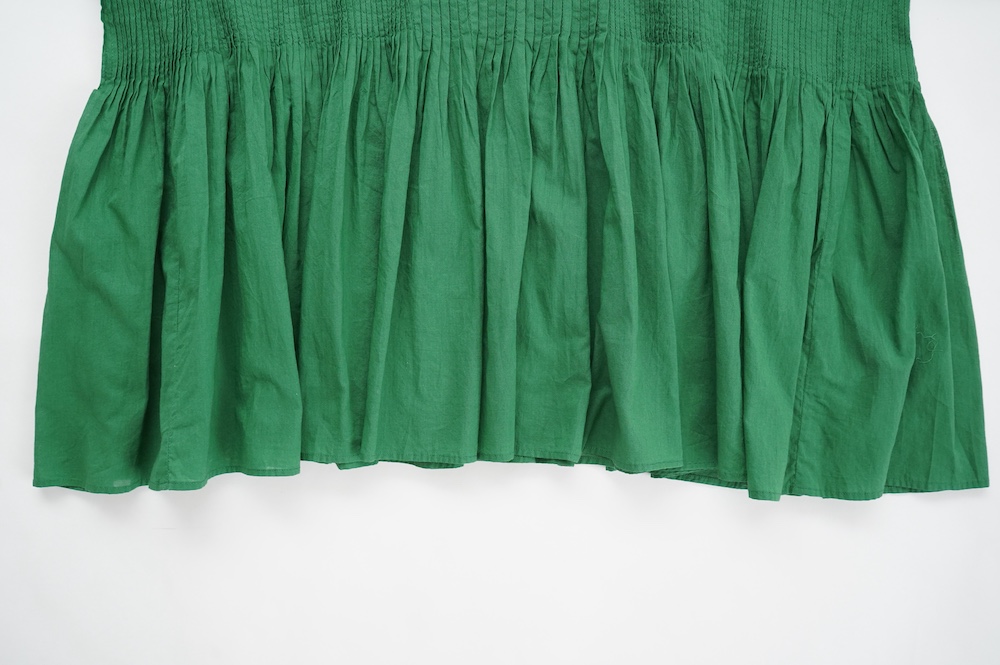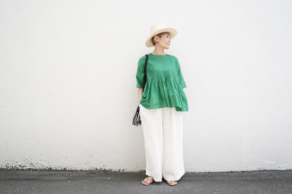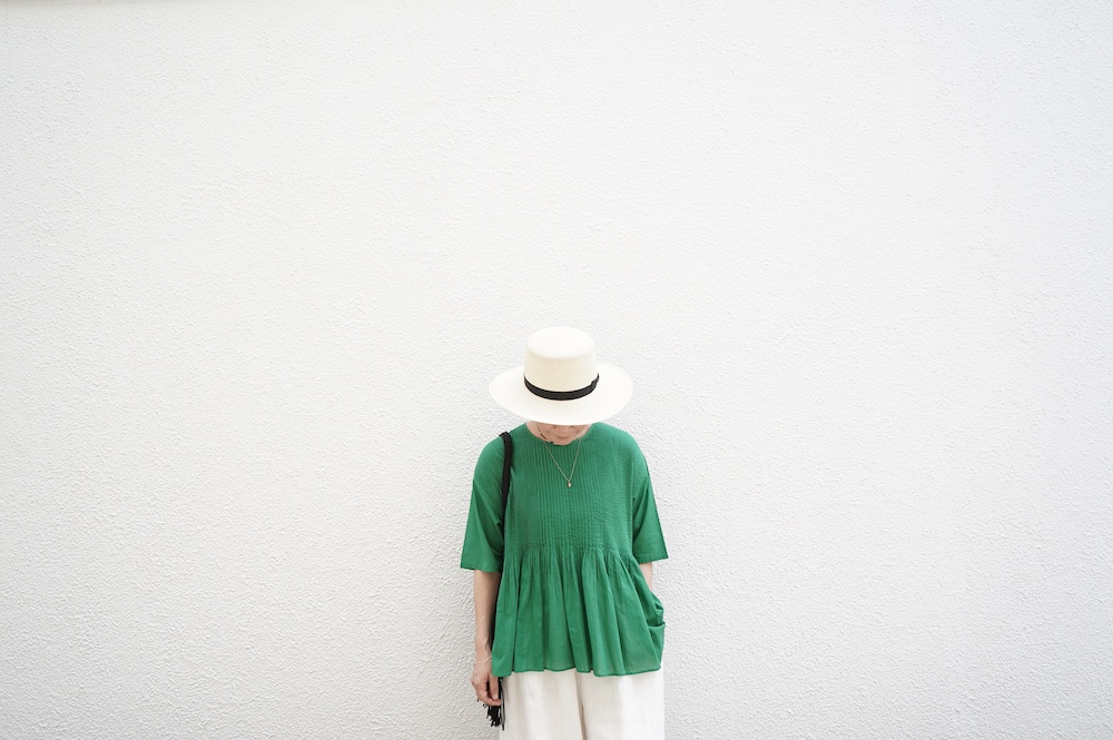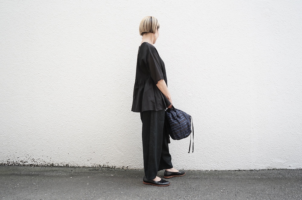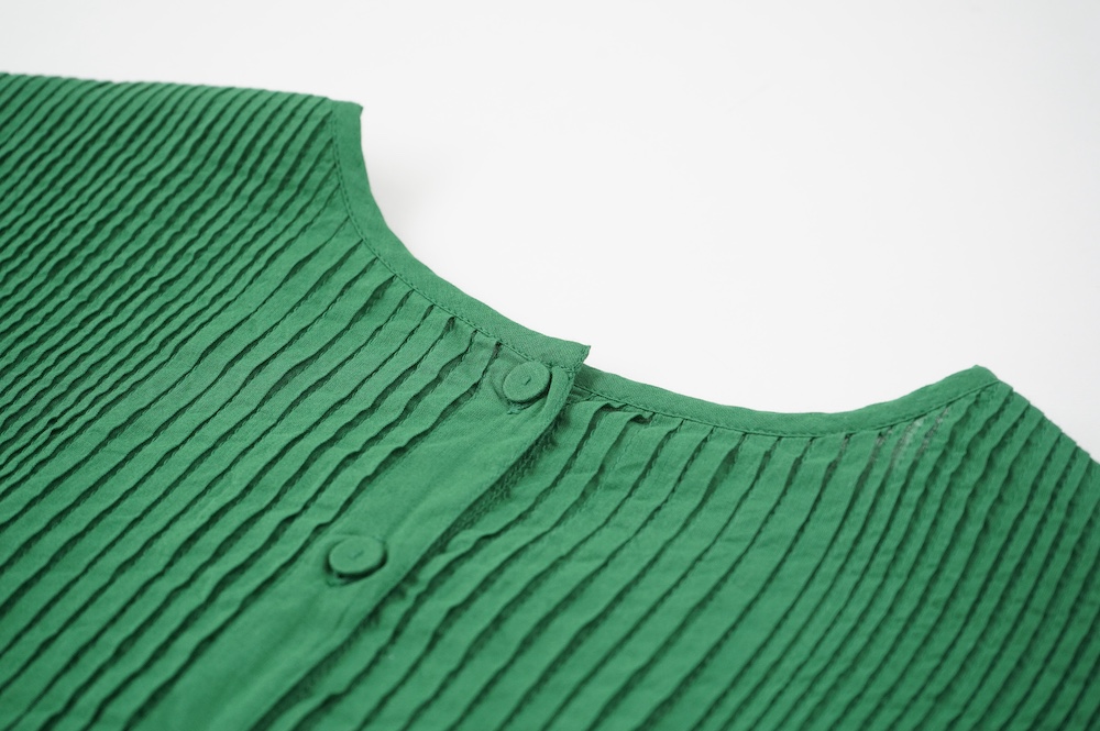 変えているのもアクセントになっています。後ろはボタン開きで、共布の包みボタンを使用しています。袖が肘くらいまでの5分袖です。ピンタックが施されていることで胸元はすっきりと、裾にかけて緩やかな広がりのあるシルエットが可愛らしい。薄手のコットンで見た目にも軽やかに着ていただけるプルオーバーです。