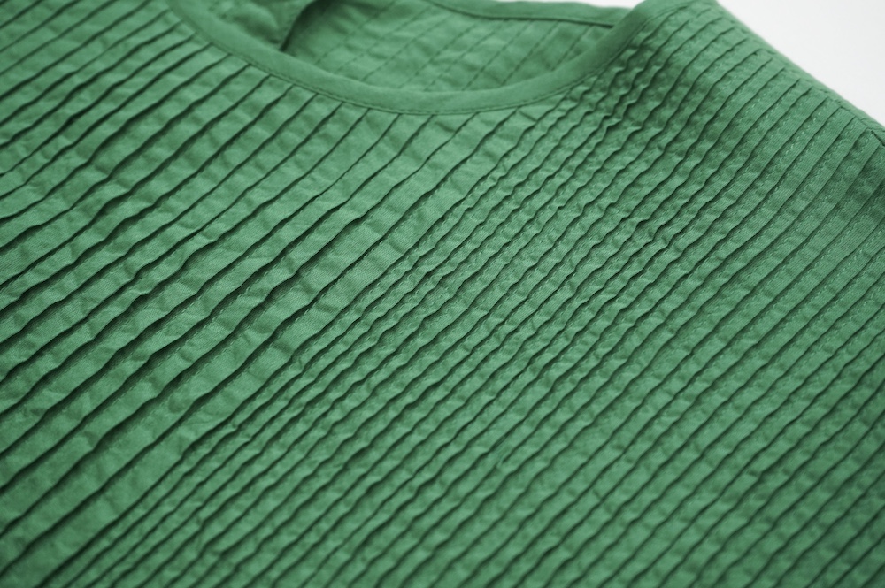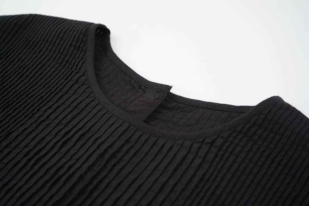 デザインは、胸元のピンタックがポイントのプルオーバー。ピンタックの中央とサイドでピンタック幅を