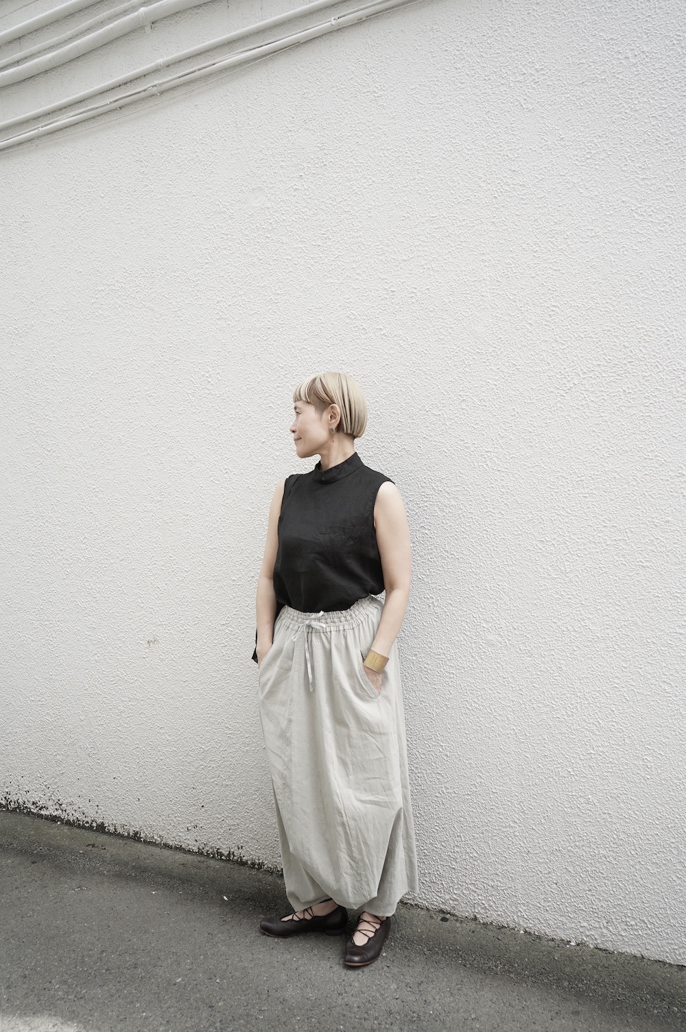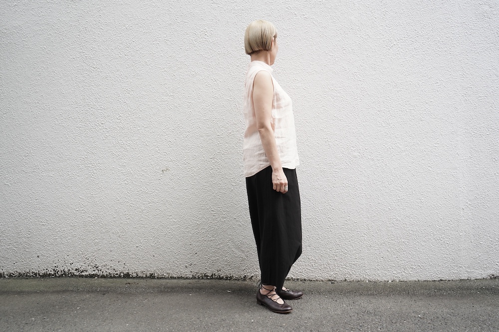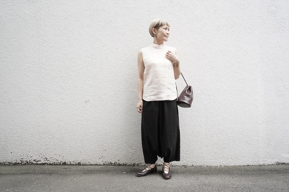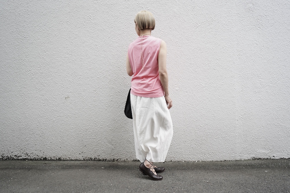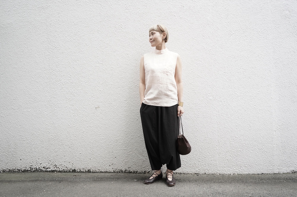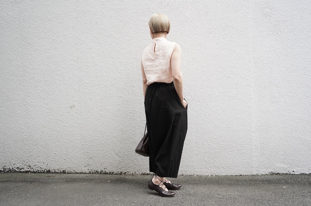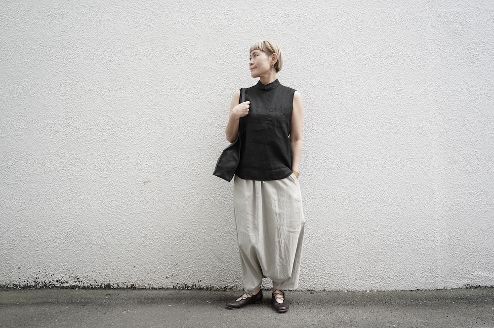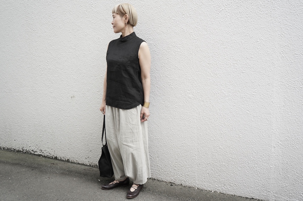 ゴーシュのハイネックノースリーブに合わせてタックイン