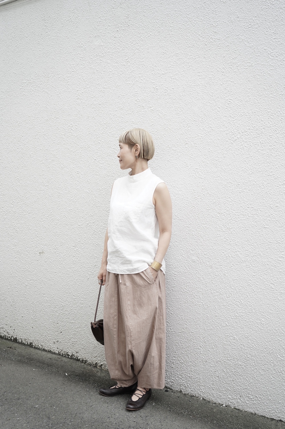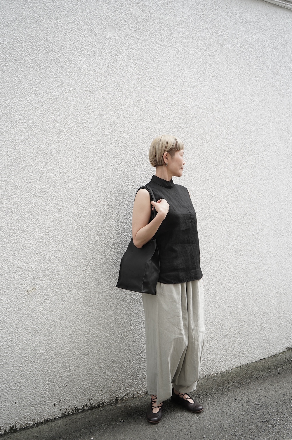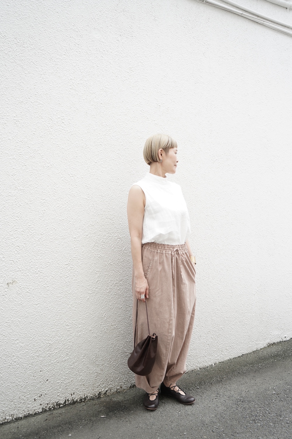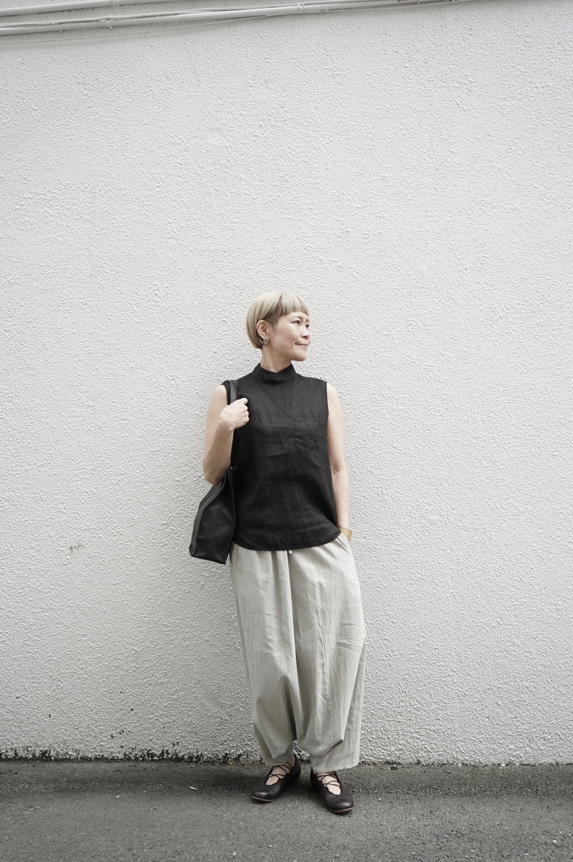 ゴーシュのハイネックノースリーブに合わせてタックイン