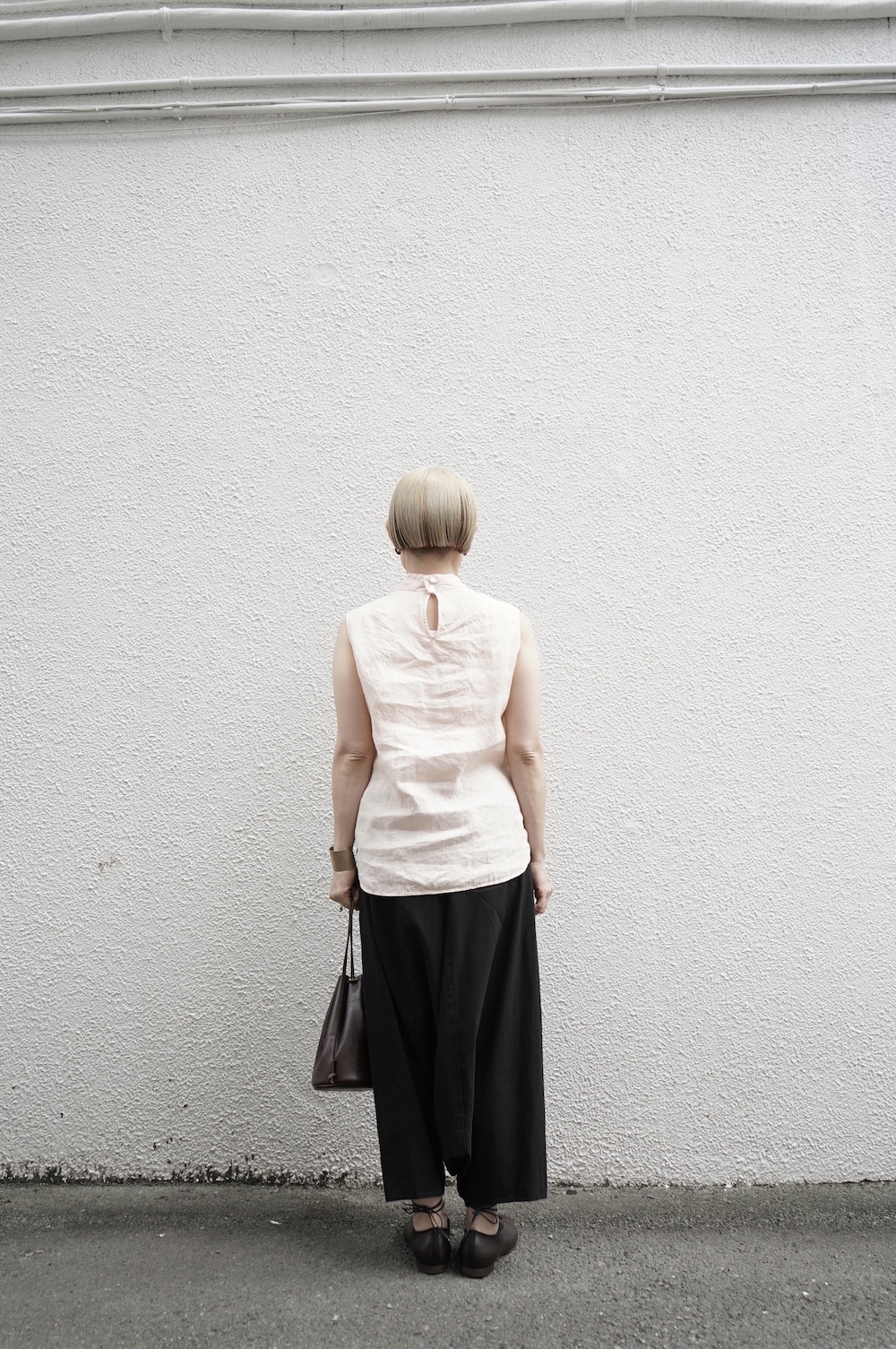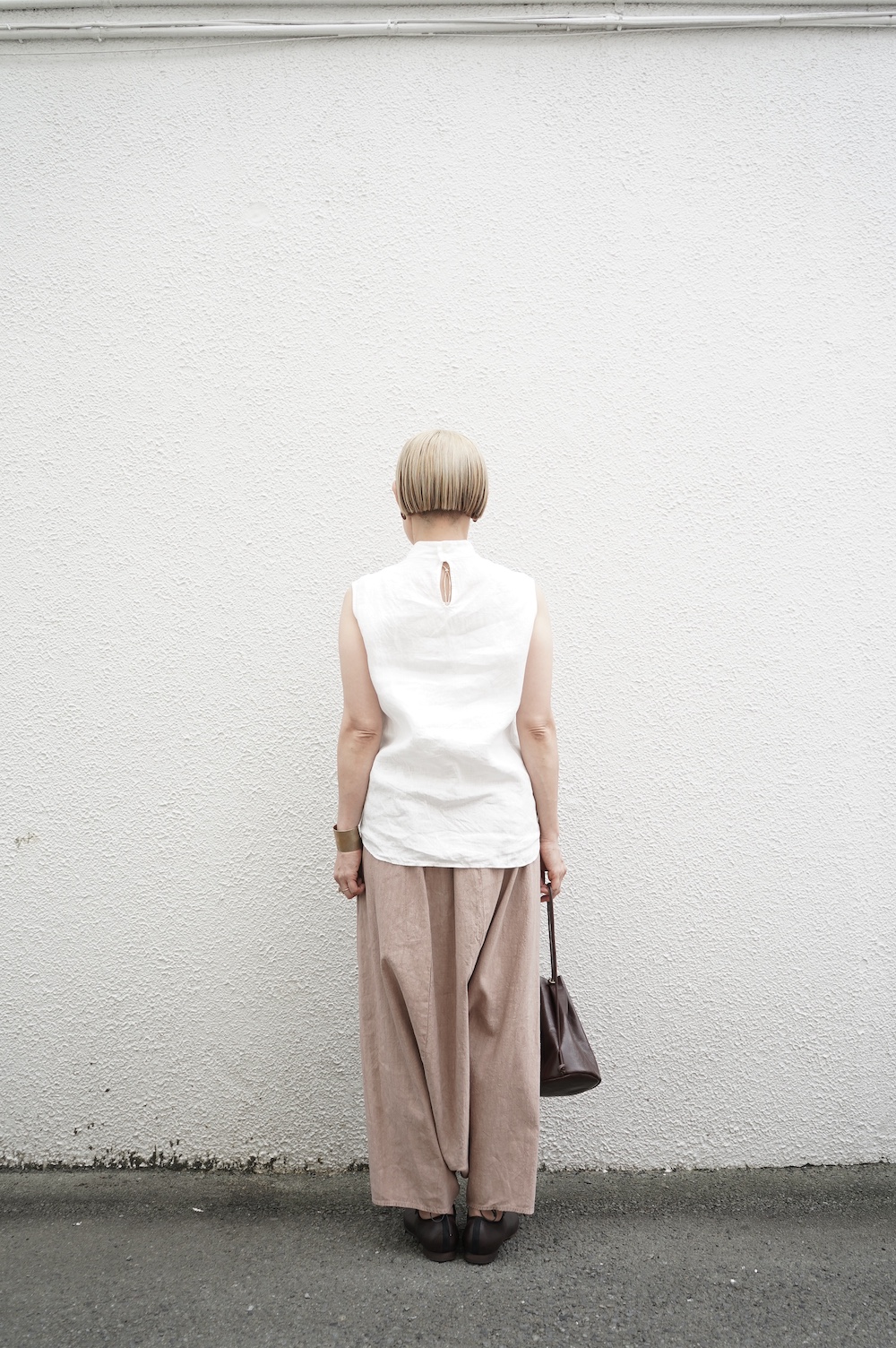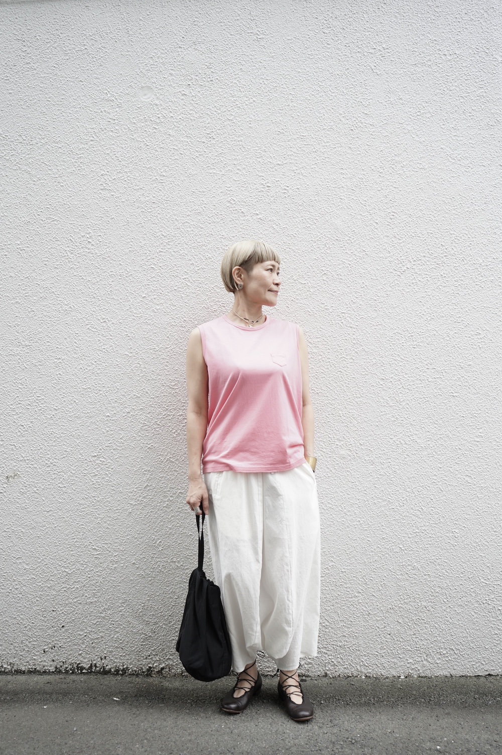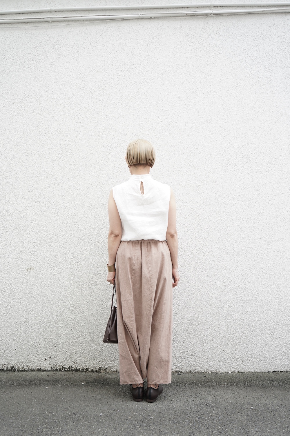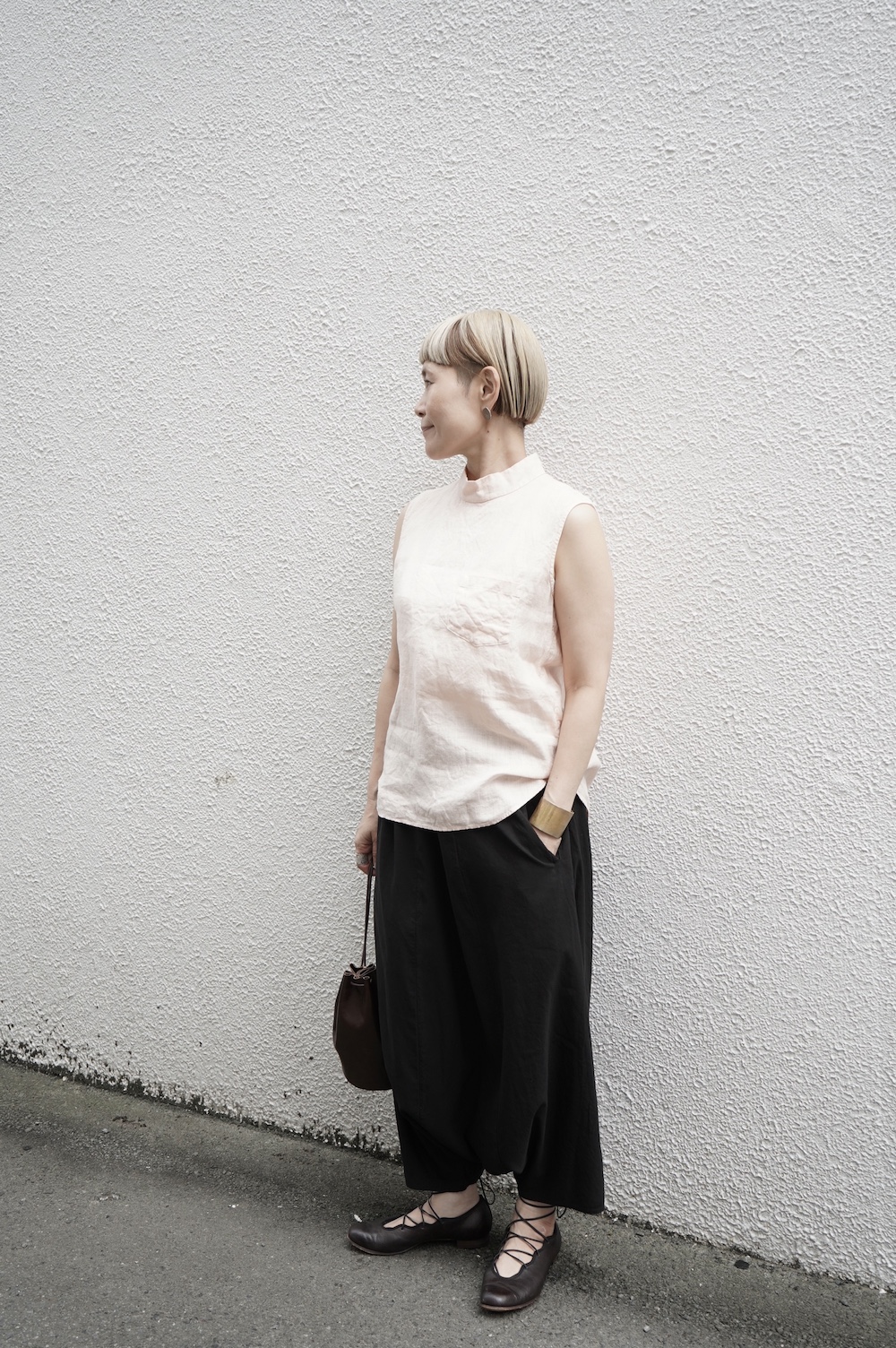 ゴーシュのハイネックノースリーブに合わせてタックイン
