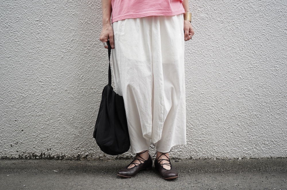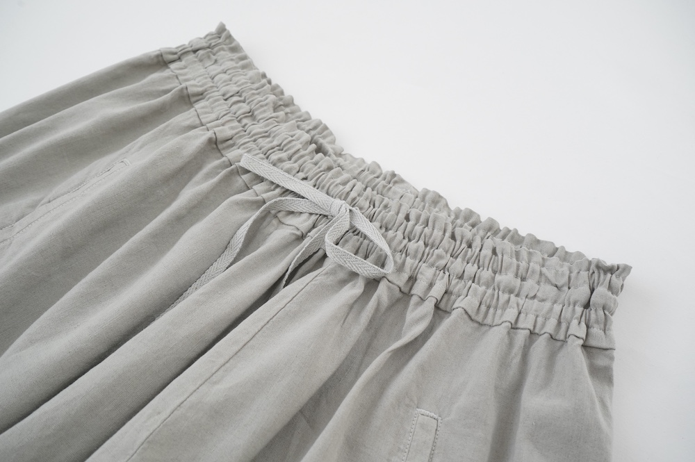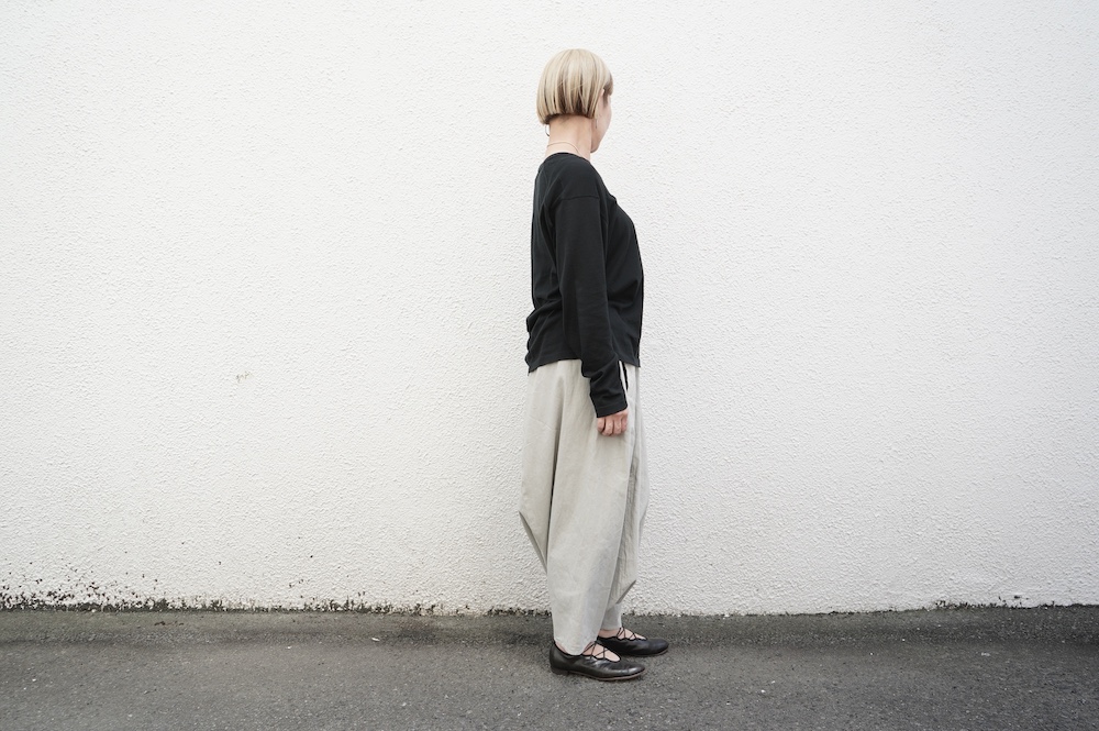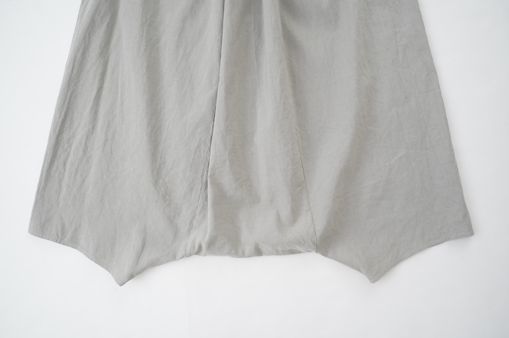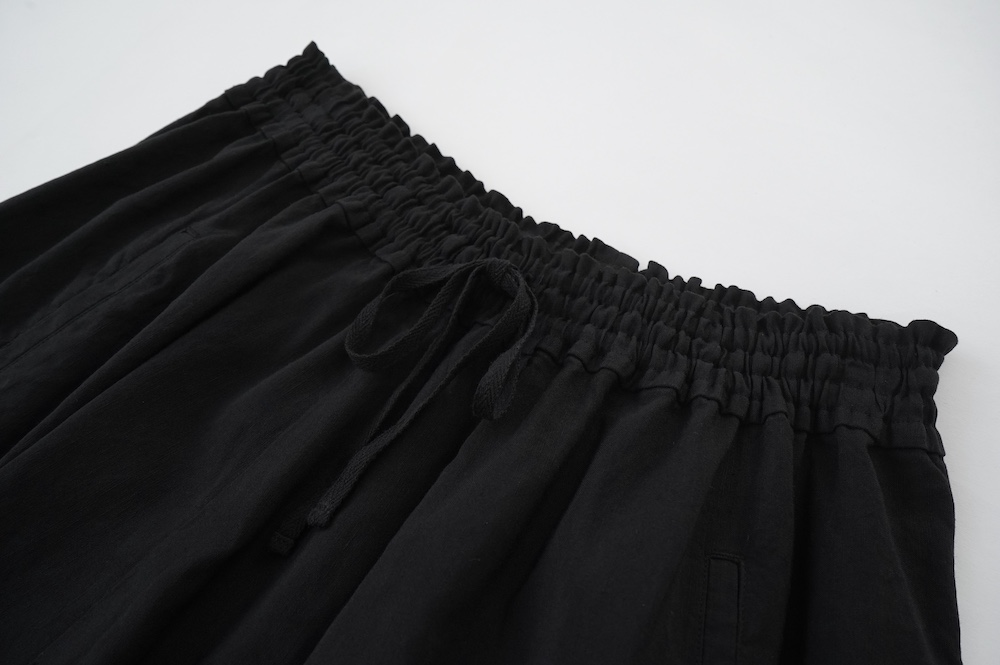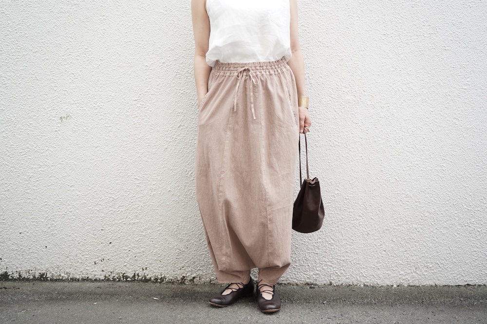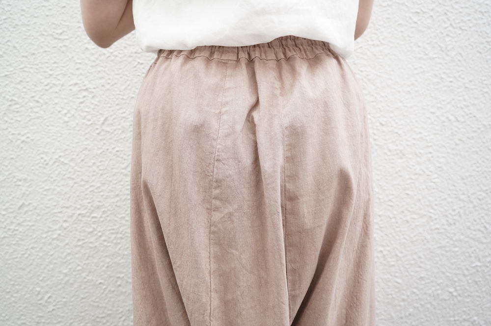 デザインは股上が裾の位置に近いところまであり、一見スカートのようなシルエットに見えます。サルエルパンツというと股下の生地のたまり方やボリュームが気になるところ、こちらは綺麗な収まり方でボリュームが程良く、スッキリと穿いていただけます。ウェストはゴムとヒモです。
