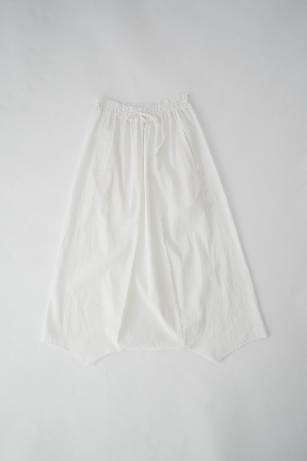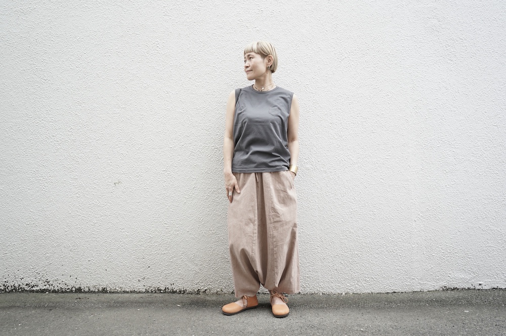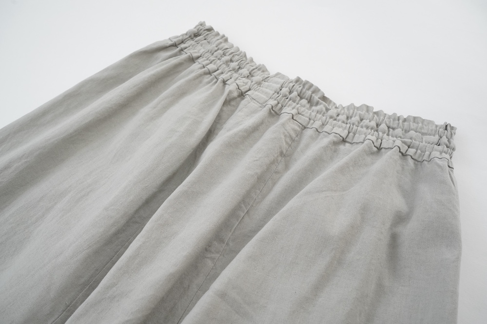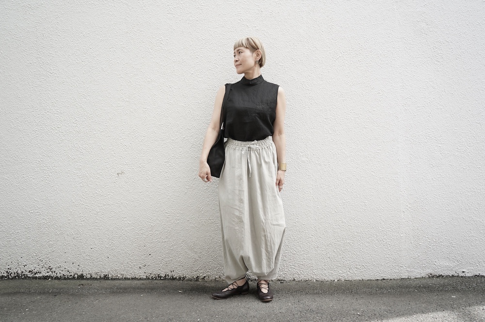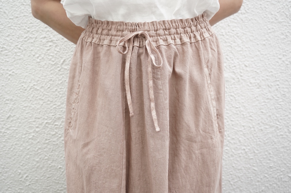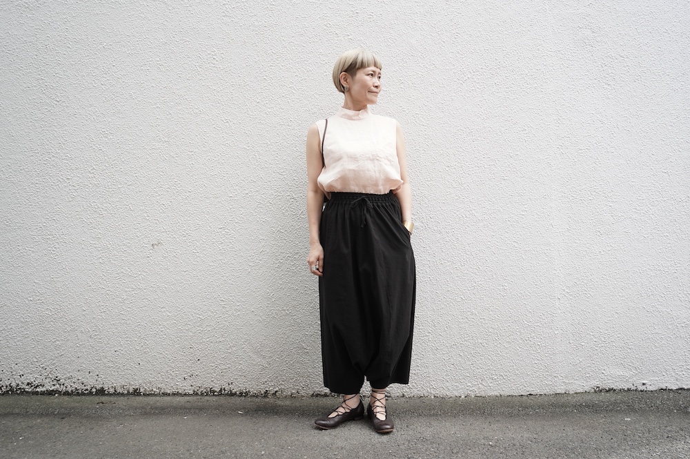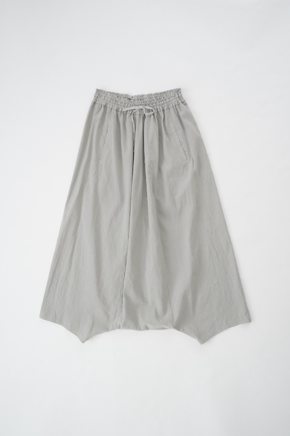 デザインは股上が裾の位置に近いところまであり、一見スカートのようなシルエットに見えます。サルエルパンツというと股下の生地のたまり方やボリュームが気になるところ、こちらは綺麗な収まり方でボリュームが程良く、スッキリと穿いていただけます。ウェストはゴムとヒモです。