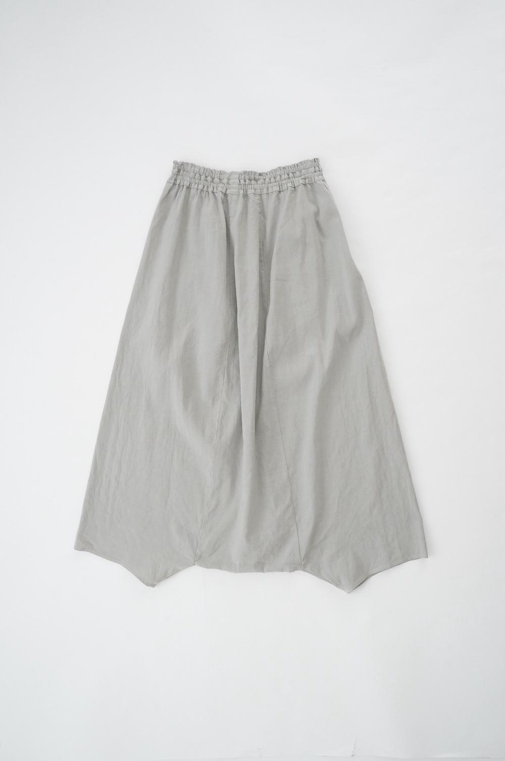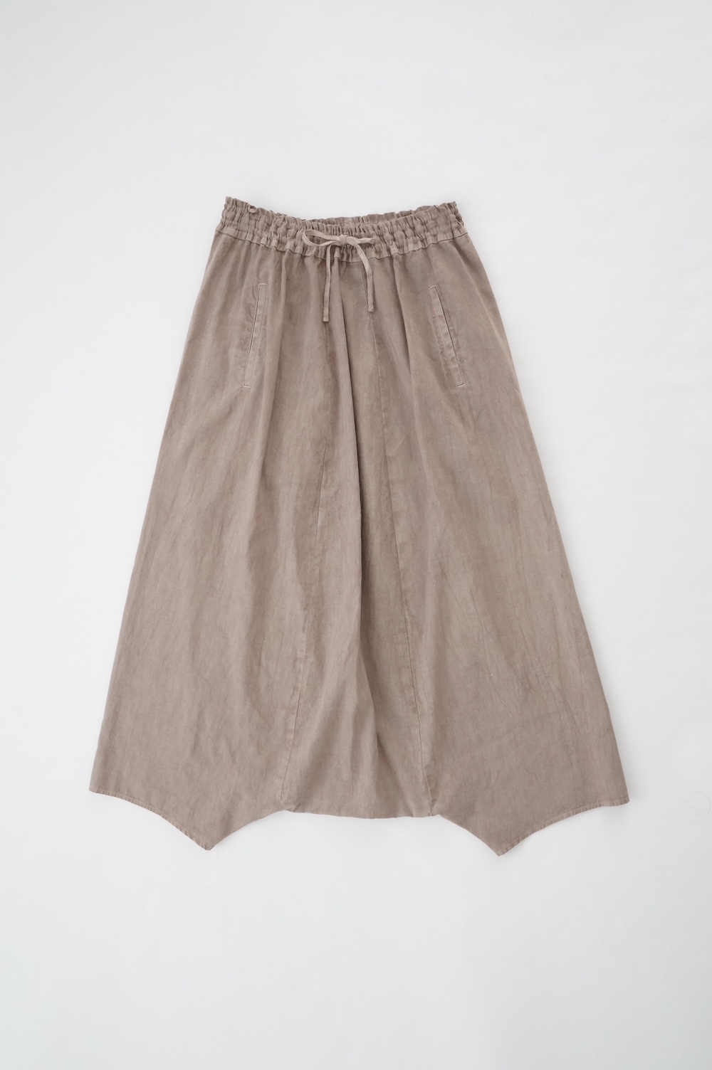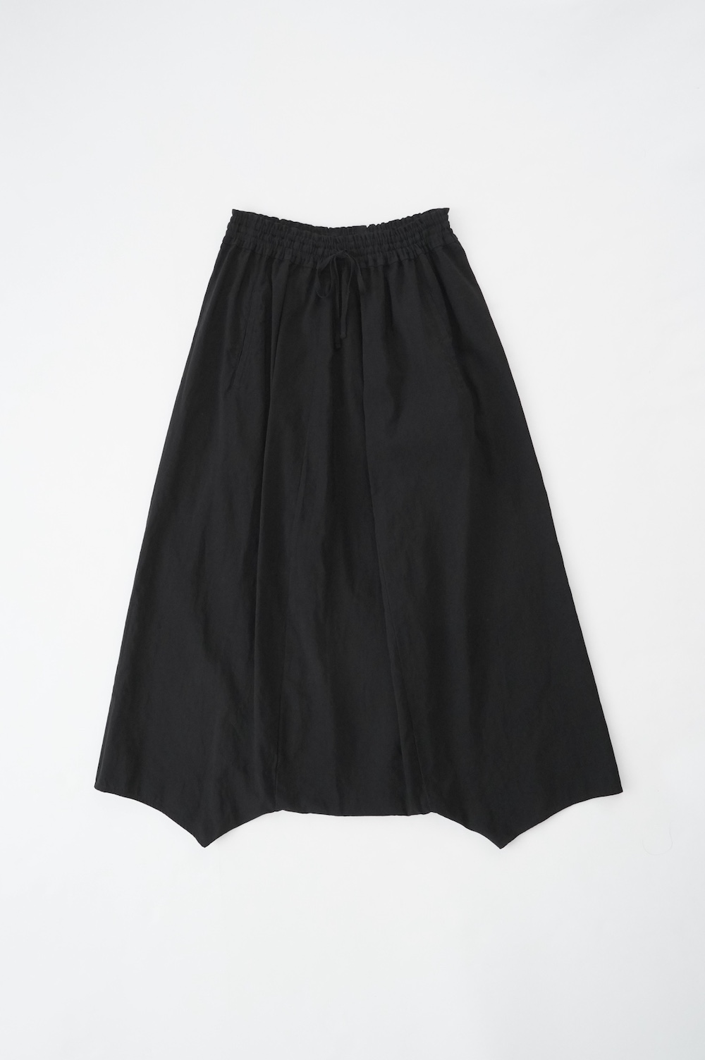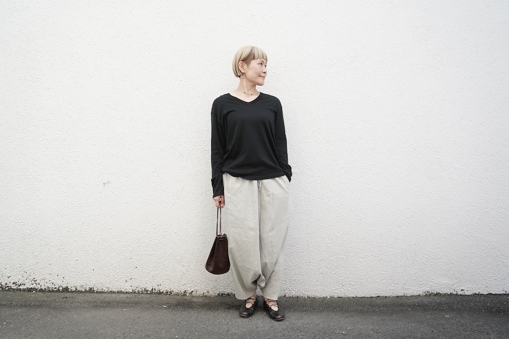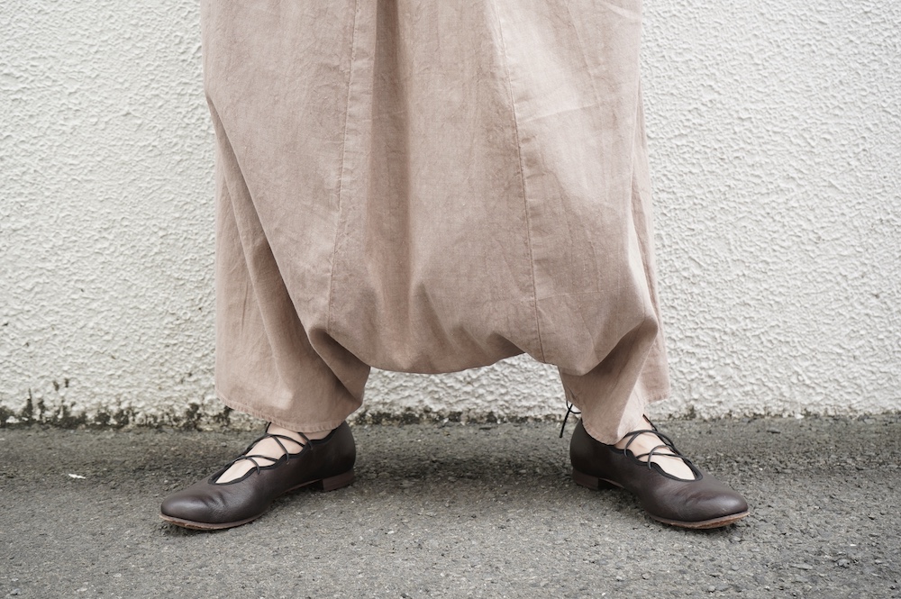 デザインは股上が裾の位置に近いところまであり、一見スカートのようなシルエットに見えます。サルエルパンツというと股下の生地のたまり方やボリュームが気になるところ、こちらは綺麗な収まり方でボリュームが程良く、スッキリと穿いていただけます。ウェストはゴムとヒモです。